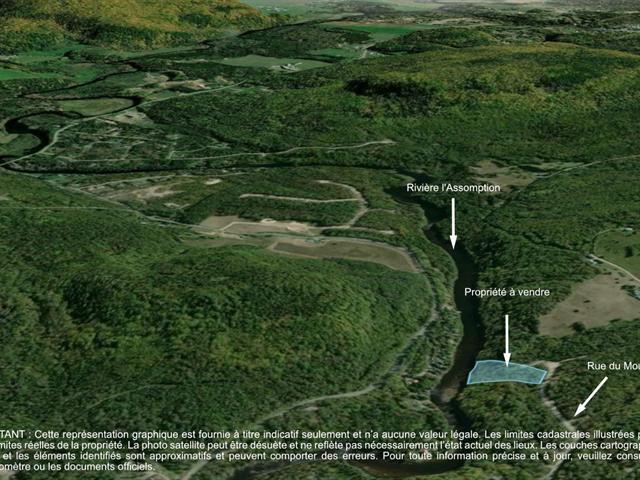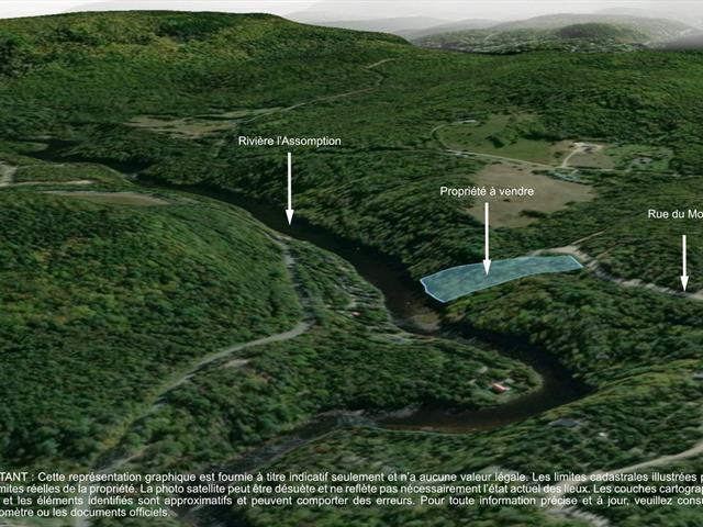 Magnifique terrain boisé de plus de 110 000 pieds carrés situé en montagne, en bordure de la rivière L'Assomption. La propriété se distingue par la présence d'un ruisseau et de charmantes cascades qui ajoutent une ambiance apaisante et unique au site. Niché dans un environnement naturel privilégié, ce terrain offre un cadre idéal pour les amoureux de la nature et de tranquillité. Situé sur un chemin déneigé et desservi par l'électricité, à proximité d'un cul-de-sac, il bénéficie d'un accès facile tout en assurant une grande quiétude. Un endroit rêvé pour concrétiser votre projet et faire de votre rêve une réalité. (57618099)