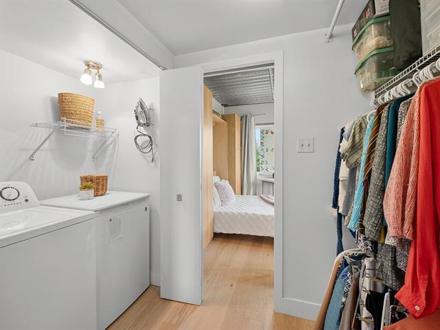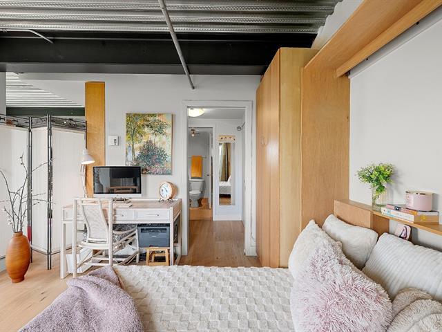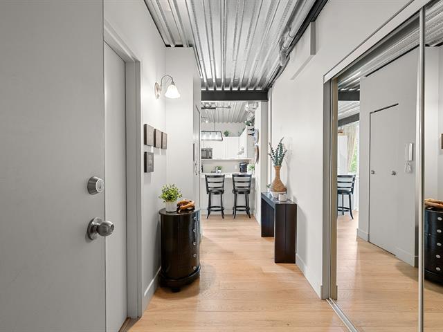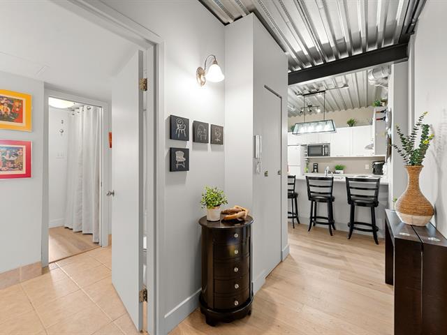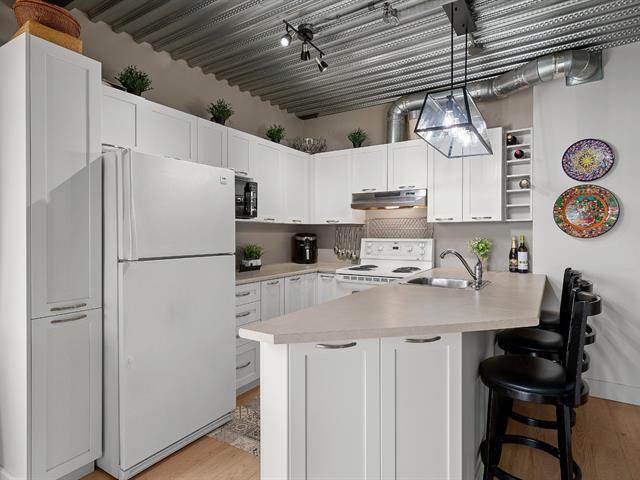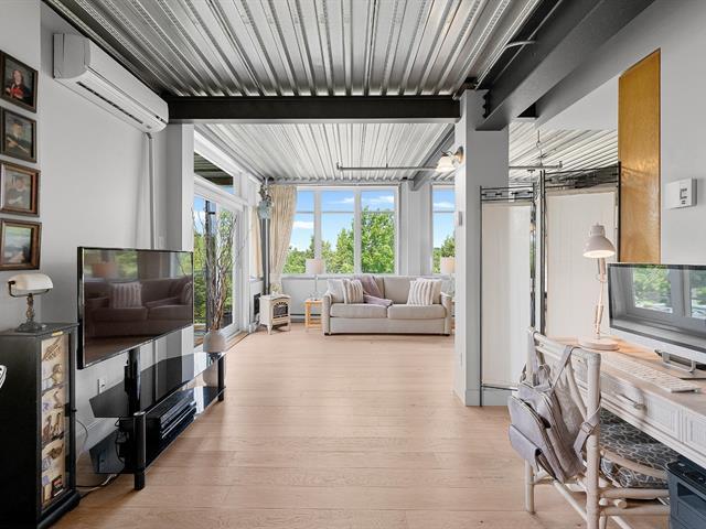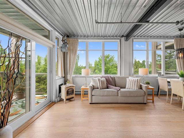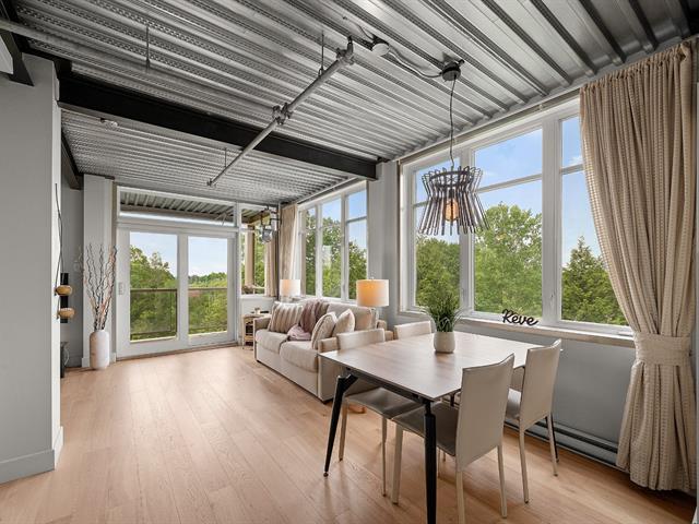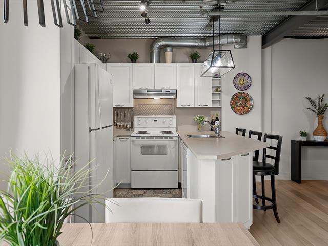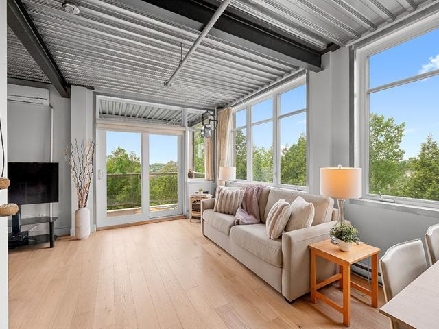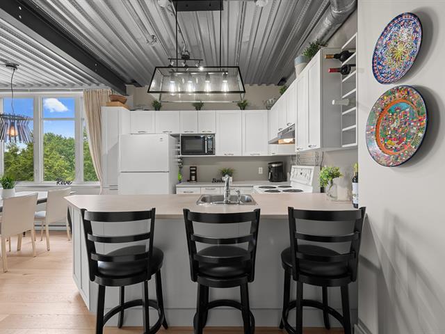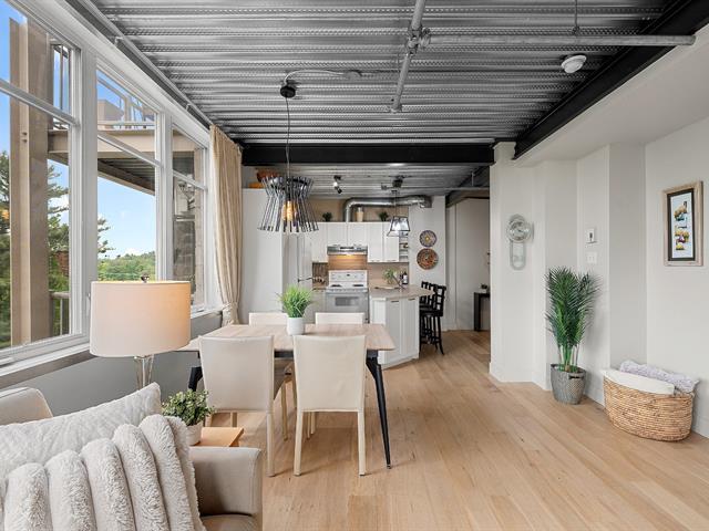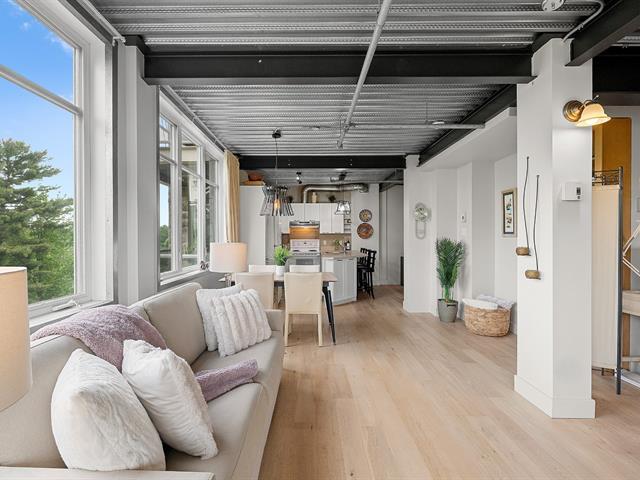 Superb loft-style corner condo with a unique look, located on the 5th floor with elevator. Area of 688 sq. ft., 9' ceilings with exposed beams, abundant light and views of an intimate wooded area. User-friendly open spaces, engineered wood flooring, semi-enclosed bedroom with walk-in closet communicating with the bathroom. Spacious sun-facing balcony, no rear neighbors. Prime location 5 minutes from the train station, Cégep and Vieux Sainte-Thérèse. You'll fall under its spell on your first visit. A real gem! -to visit without delay! (44541370)