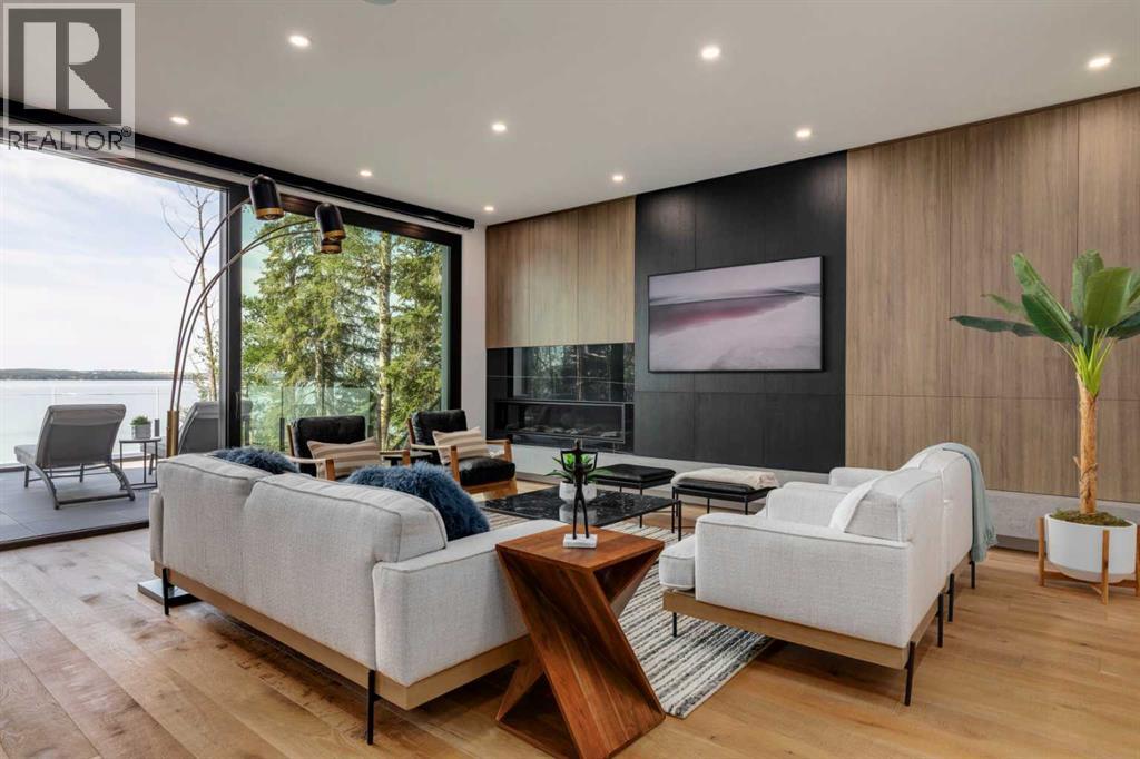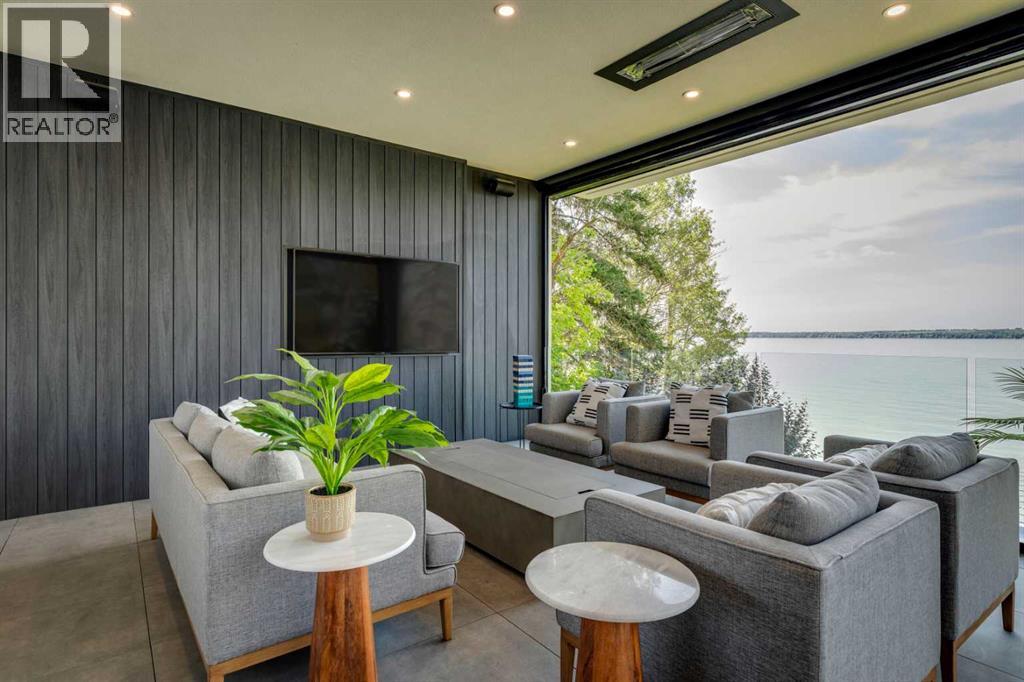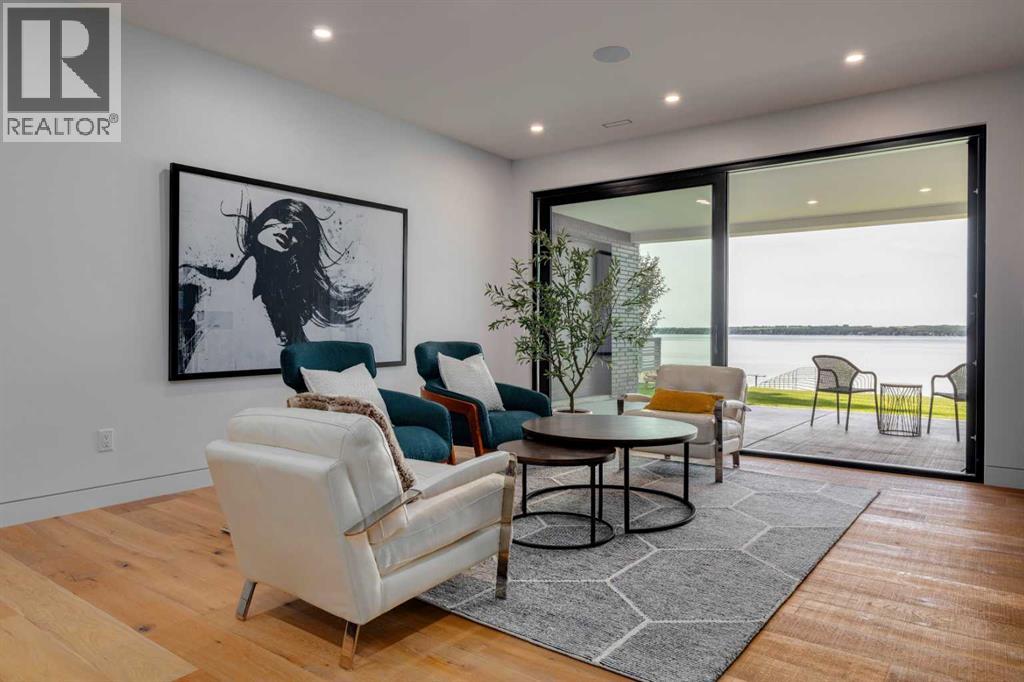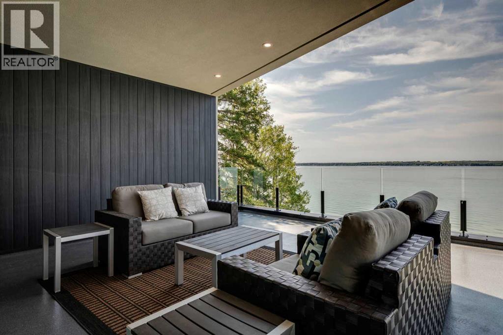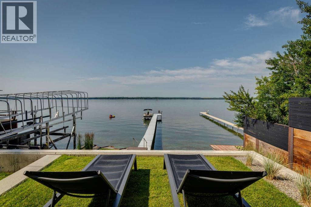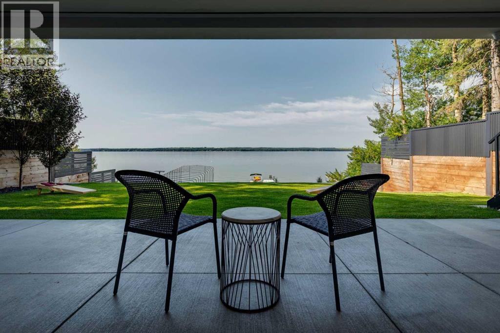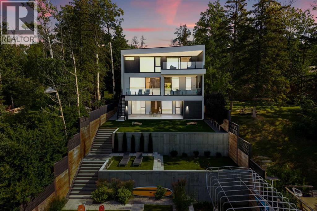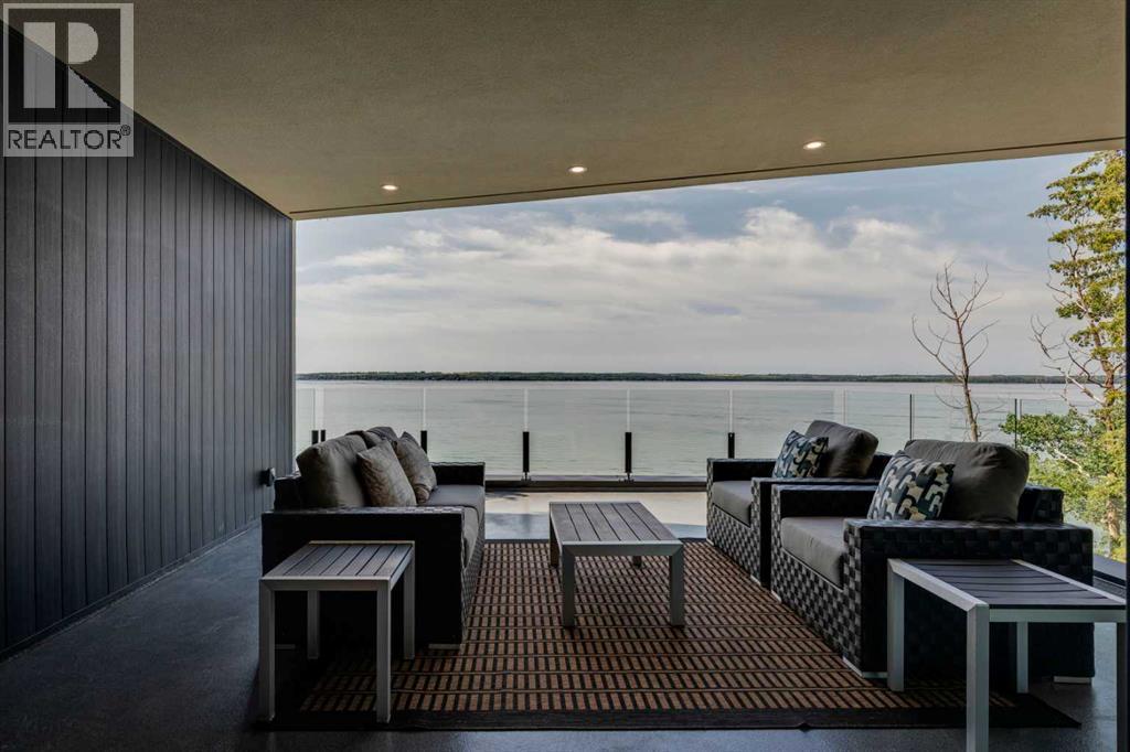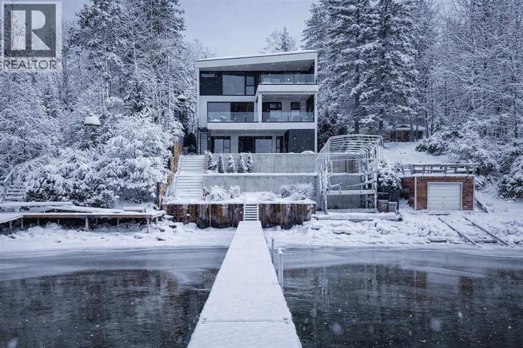 Welcome to The Cliffs — a breathtaking custom lakefront residence built by Square Structures, recipient of the Central Alberta Building Association’s Award of Excellence. This architectural masterpiece offers a seamless blend of luxury, function, and connection to nature, with panoramic south-facing lake views from every level. Designed with wall-to-wall, floor-to-ceiling triple-pane windows, the home is flooded with natural light and offers uninterrupted views of the water throughout. Step outside to enjoy 1,750 sq ft of outdoor decking, including a screened-in living space with gas fireplace, ceiling heaters and TV — the perfect extension of your indoor living. The striking exterior is finished with a premium combination of EIFS stucco, King Klinker brick, Cham Clad, and Lux Architectural panels, setting the tone for the elevated design found within. Enter through a 4’x8’ custom front door into an open-concept main floor featuring 8” wide-plank engineered white oak flooring, a spacious living area, and a fully custom kitchen complete with porcelain countertops, high-end appliances, a built-in ice maker, built-in coffee machine, induction cooktop, and a walk-through pantry housing a full-size fridge and freezer.The main floor also includes a 200 sq ft home office and seamless access to the outdoor living areas. The primary suite is a true retreat, featuring private lake-facing balcony access, a gas fireplace, and a spa-inspired ensuite with dual vanities, walk-through shower, and custom-tiled walls. Additional features include: personal GYM with wraparound balcony, WALK-OUT basement with lake views, family room, THEATRE room (100” screen & 5.1 surround sound) In-floor heating, ELECTRIC power blinds on every level, PROFESSIONALLY landscaped yard with tiered access to the water, underground irrigation, privacy fencing, and landscape lightingThis is a rare opportunity to own a meticulously crafted luxury home with direct lake access and premium finishes throughou t. The Cliffs is more than a home — it’s a lifestyle. (30846402)