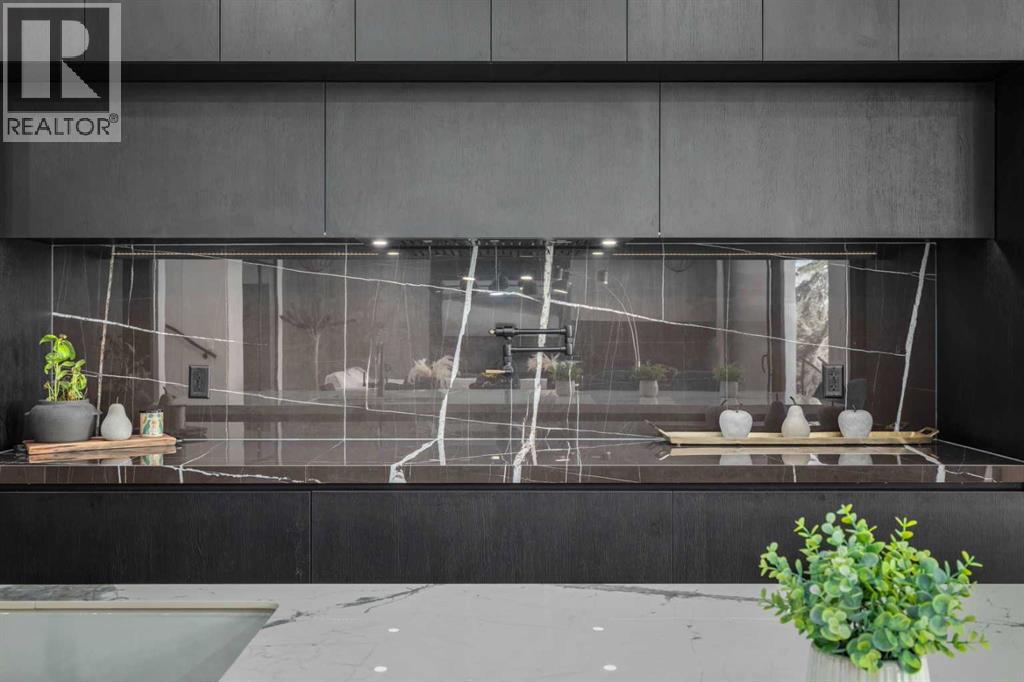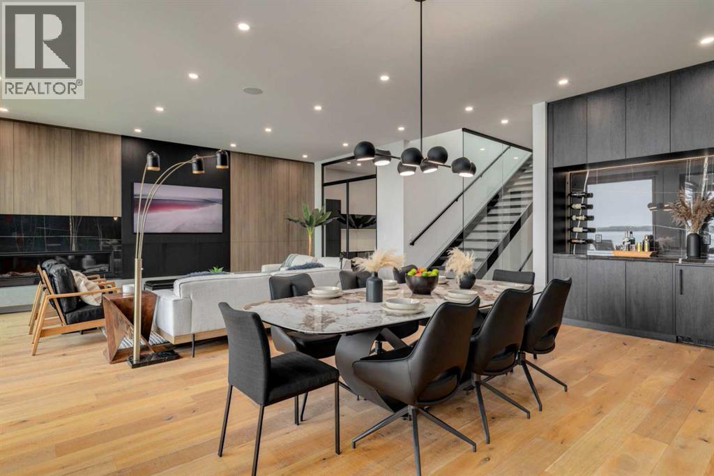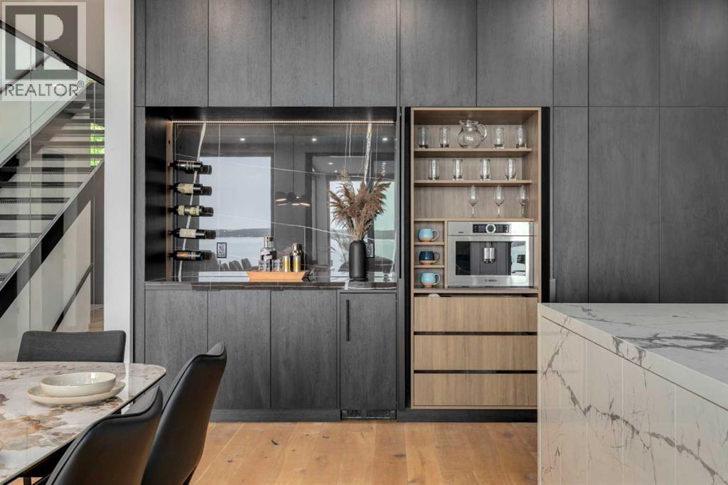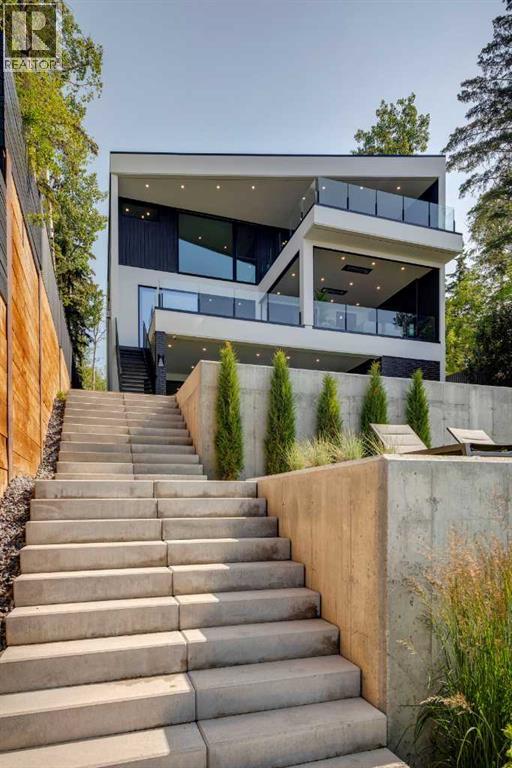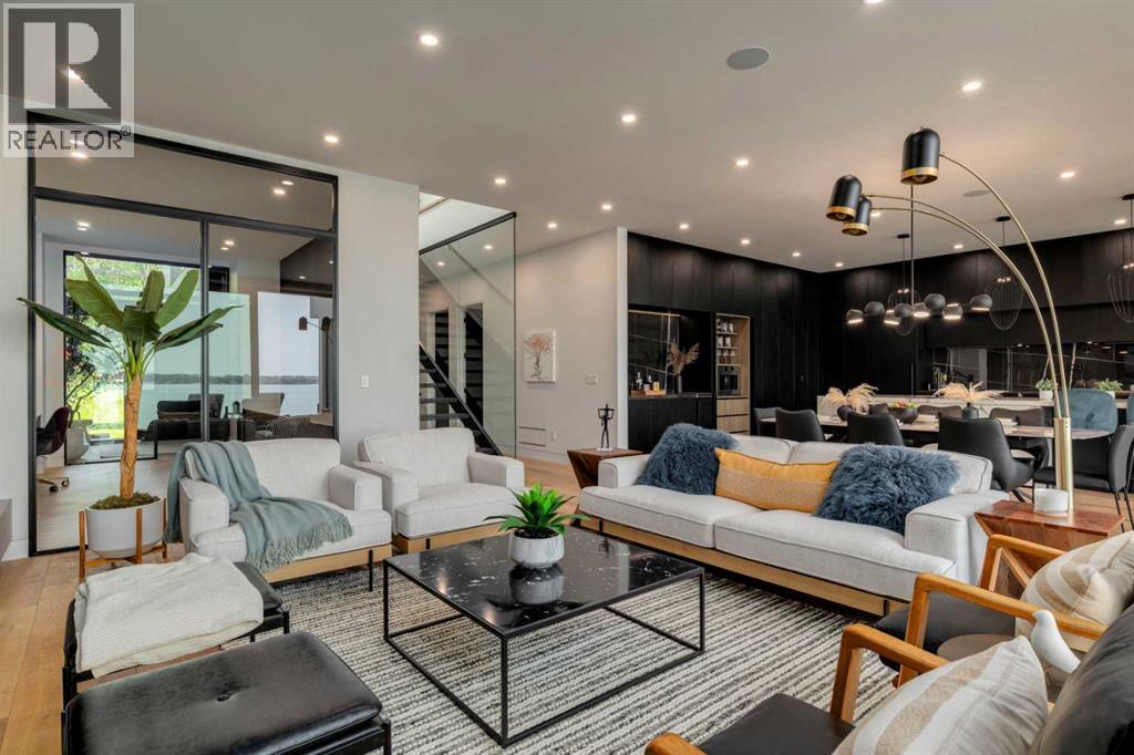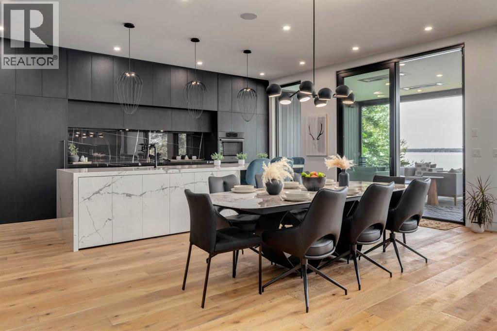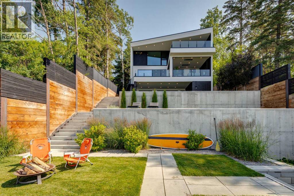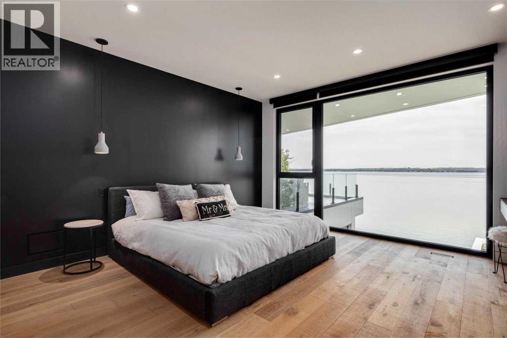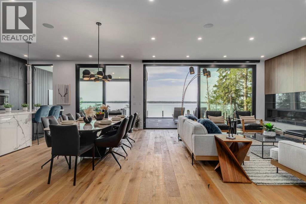 Welcome to The Cliffs — a breathtaking custom lakefront residence built by Square Structures, recipient of the Central Alberta Building Association’s Award of Excellence. This architectural masterpiece offers a seamless blend of luxury, function, and connection to nature, with panoramic south-facing lake views from every level. Designed with wall-to-wall, floor-to-ceiling triple-pane windows, the home is flooded with natural light and offers uninterrupted views of the water throughout. Step outside to enjoy 1,750 sq ft of outdoor decking, including a screened-in living space with gas fireplace, ceiling heaters and TV — the perfect extension of your indoor living. The striking exterior is finished with a premium combination of EIFS stucco, King Klinker brick, Cham Clad, and Lux Architectural panels, setting the tone for the elevated design found within. Enter through a 4’x8’ custom front door into an open-concept main floor featuring 8” wide-plank engineered white oak flooring, a spacious living area, and a fully custom kitchen complete with porcelain countertops, high-end appliances, a built-in ice maker, built-in coffee machine, induction cooktop, and a walk-through pantry housing a full-size fridge and freezer.The main floor also includes a 200 sq ft home office and seamless access to the outdoor living areas. The primary suite is a true retreat, featuring private lake-facing balcony access, a gas fireplace, and a spa-inspired ensuite with dual vanities, walk-through shower, and custom-tiled walls. Additional features include: personal GYM with wraparound balcony, WALK-OUT basement with lake views, family room, THEATRE room (100” screen & 5.1 surround sound) In-floor heating, ELECTRIC power blinds on every level, PROFESSIONALLY landscaped yard with tiered access to the water, underground irrigation, privacy fencing, and landscape lightingThis is a rare opportunity to own a meticulously crafted luxury home with direct lake access and premium finishes throughou t. The Cliffs is more than a home — it’s a lifestyle. (30846402)
