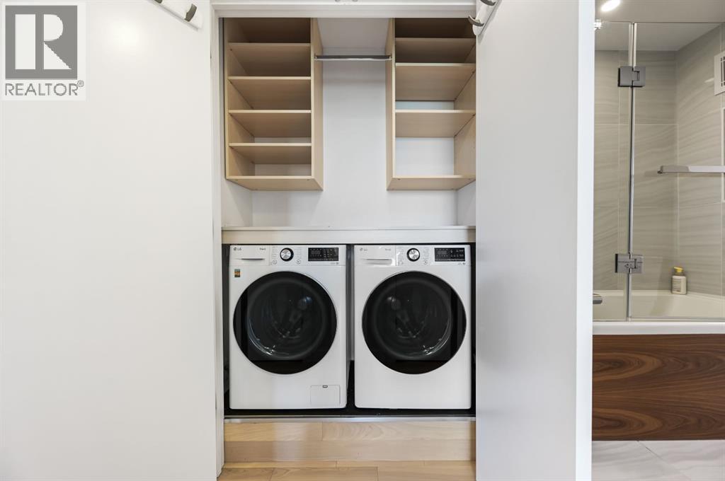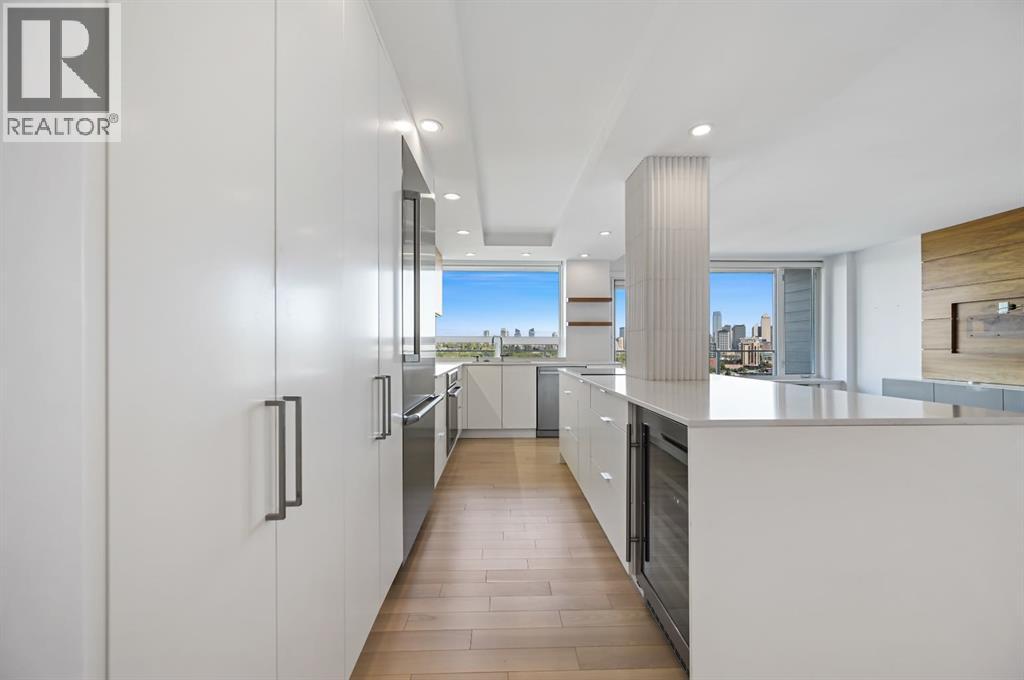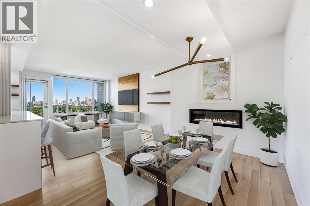 Uninterrupted panoramic views of Calgary’s downtown skyline define this recently renovated two-bedroom, one-bathroom end unit on the 6th floor of the renowned Renfrew House.Renovated in 2016, the transformation went far beyond aesthetics. The unit was completely rebuilt to modern standards with new windows, electrical wiring and panel, updated plumbing lines, enhanced soundproofing, and hardwired CAT 6e networking throughout for seamless connectivity.Inside, mid-century modern design meets contemporary sophistication. Commercial-grade Coswick hardwood floors, dimmable LED lighting with designer fixtures, and Lutron controls create a polished ambiance, while unique touches—like the restored original milk delivery door and custom quartz-topped radiator covers—preserve timeless character.The kitchen is a culinary showpiece, boasting built-in Thermador and Bosch appliances including an induction cooktop, custom soft-close cabinetry, and a striking Italian chevron Mutina stone backsplash lit by LED under-cabinet lighting. A built-in electric fireplace enhances the dining area, while the living room is anchored by a walnut-paneled TV feature wall framed by sweeping city views.Custom closet systems maximize storage throughout, while the spa-inspired bathroom offers a walnut vanity, quartz counters, Grohe and Kohler fixtures, and a dedicated makeup station. The primary bedroom provides elegant, functional closet solutions, and the spacious second bedroom is perfect for guests or a home office.The home includes underground parking and a storage unit, all within 13 acres of park-like grounds atop the hill—an unmatched setting combining green space, privacy, and city convenience.Book your private showing today. (31044220)
