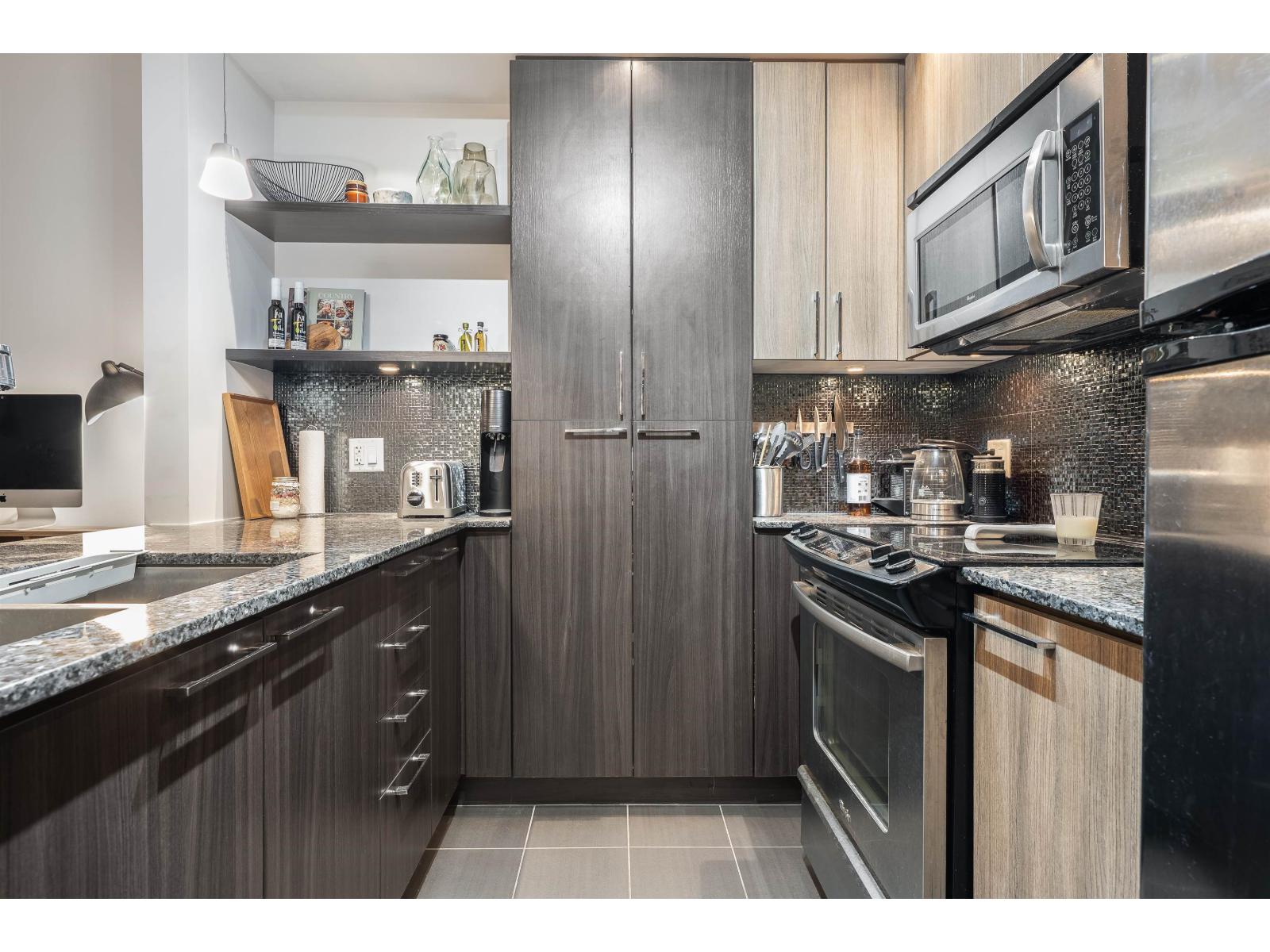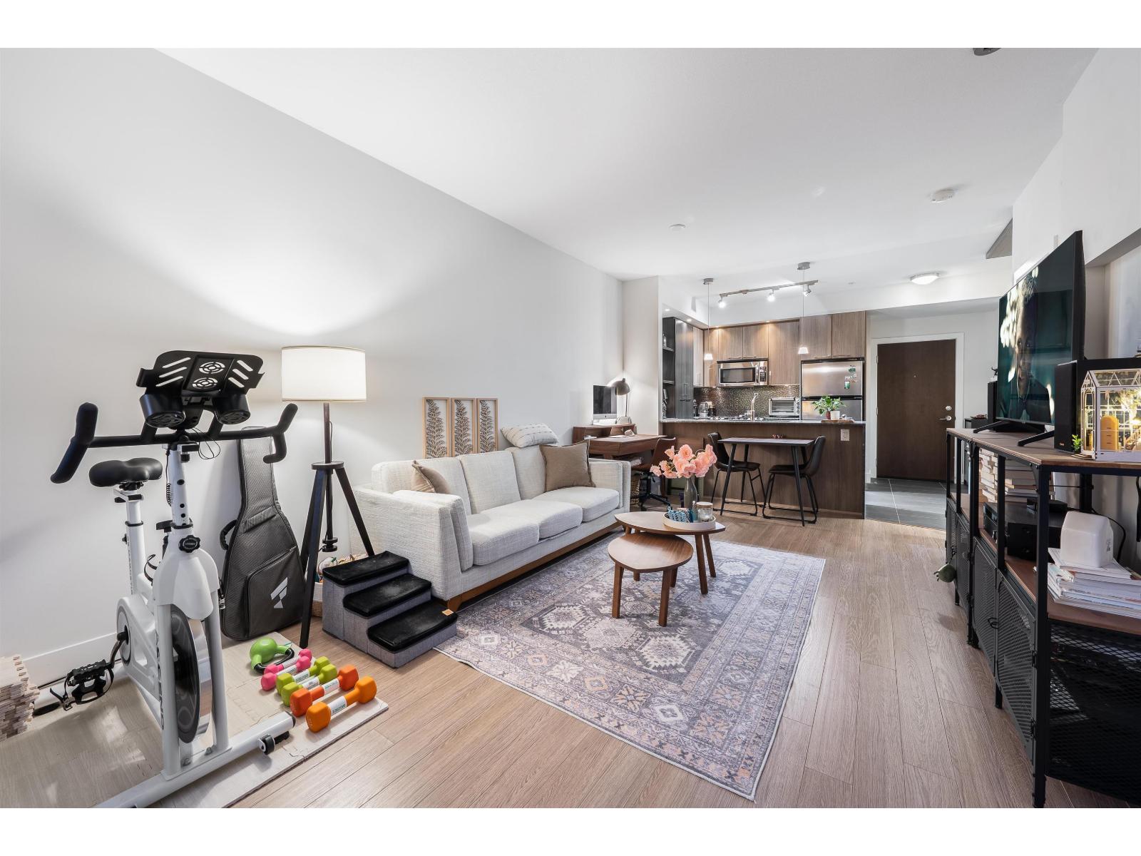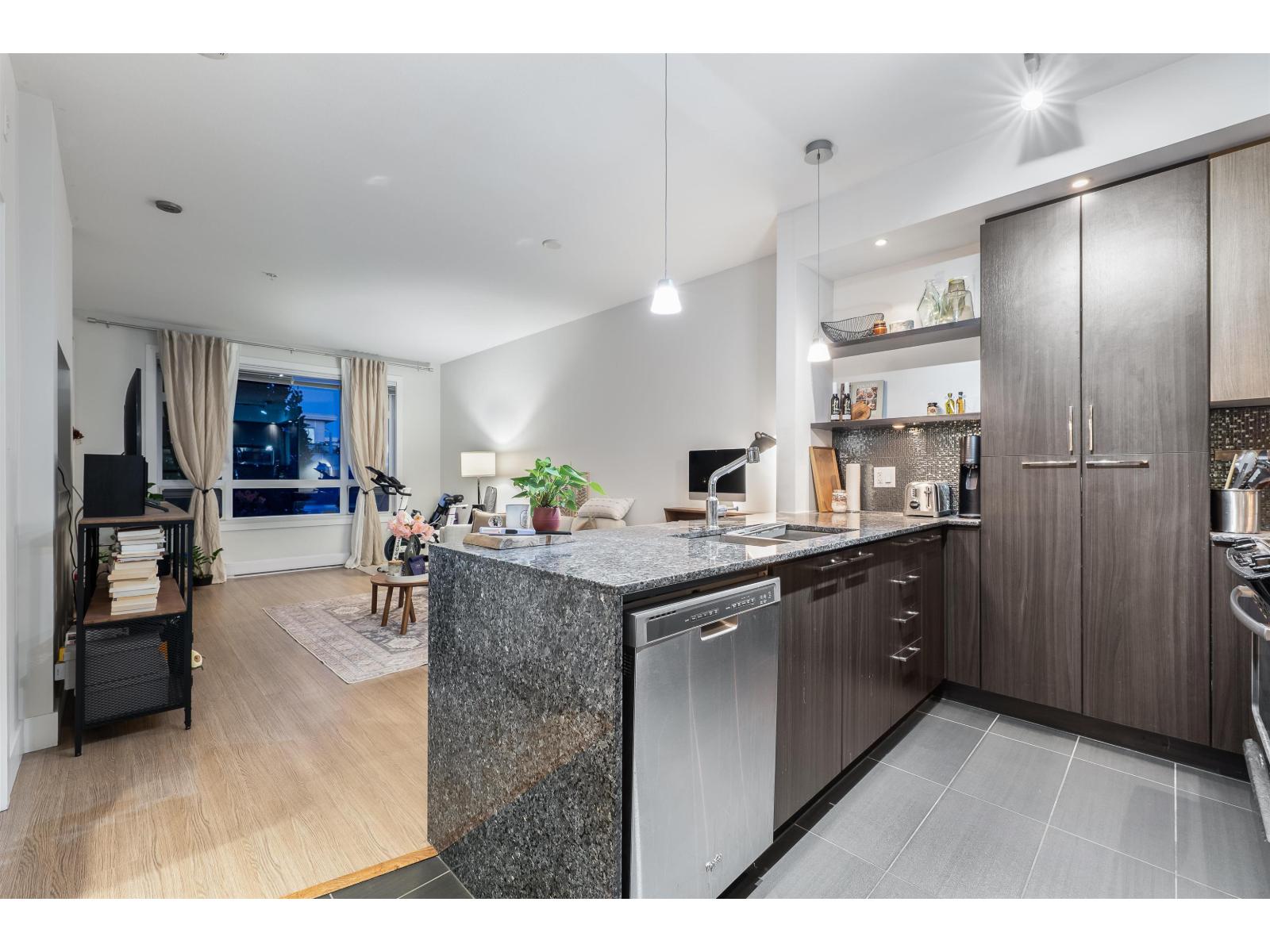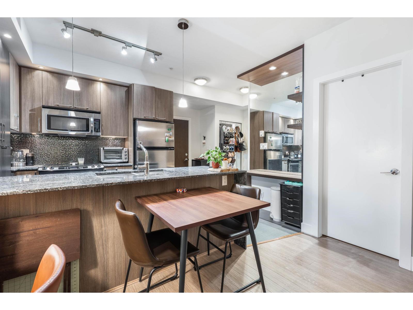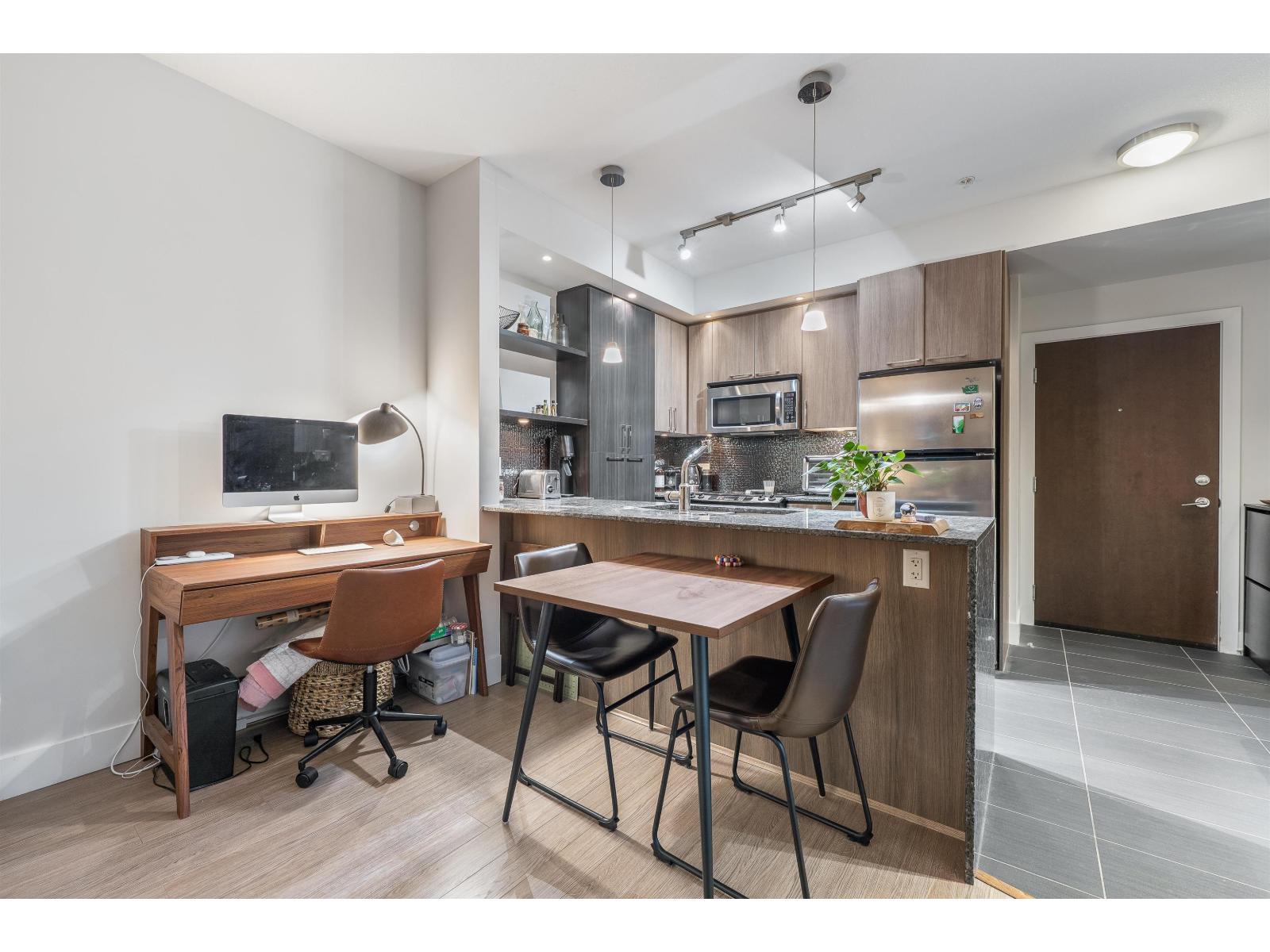 Welcome to Elements, located in one of Langley's most sought-after communities. This bright and modern 1-bedroom home features an open-concept layout with 9-foot ceilings, oversized windows, and stylish wide-plank flooring. The gourmet kitchen boasts granite countertops, stainless steel appliances, elegant cabinetry, and a spacious island perfect for entertaining. The living and dining areas flow seamlessly to a covered balcony, offering a peaceful outlook. The bedroom is spacious and inviting, and the bathroom showcases quality finishes with stone countertops and tile flooring. Residents have access to exceptional amenities, including a fully equipped gym, yoga studio, clubhouse lounge, party room, kids' playroom. (32037128)