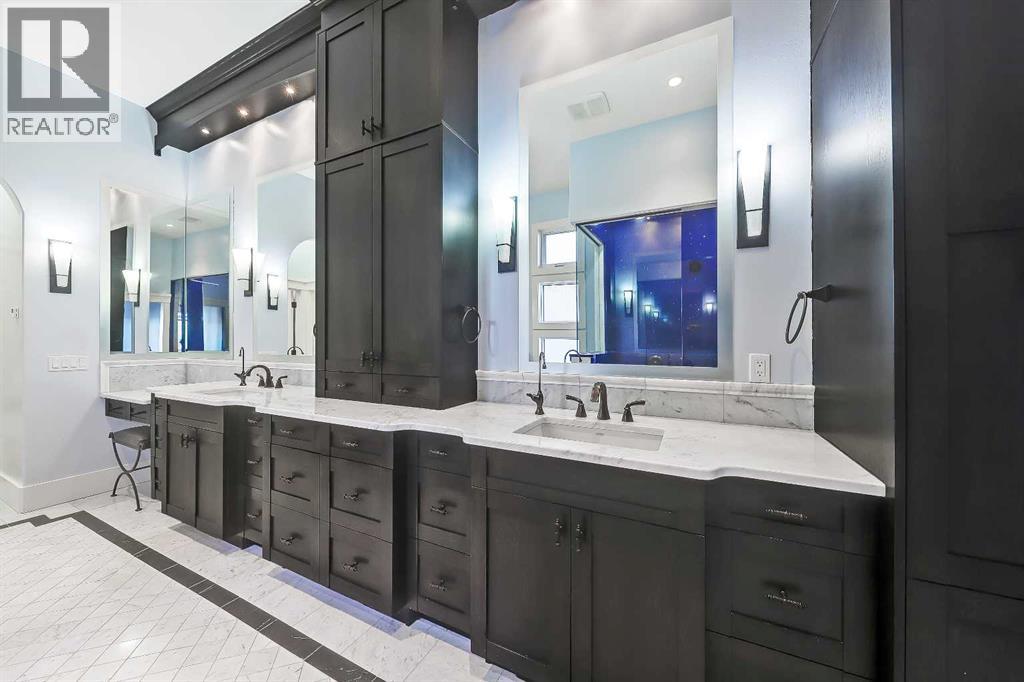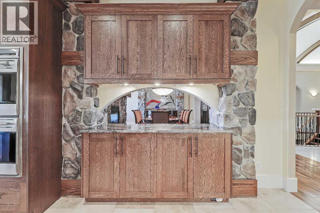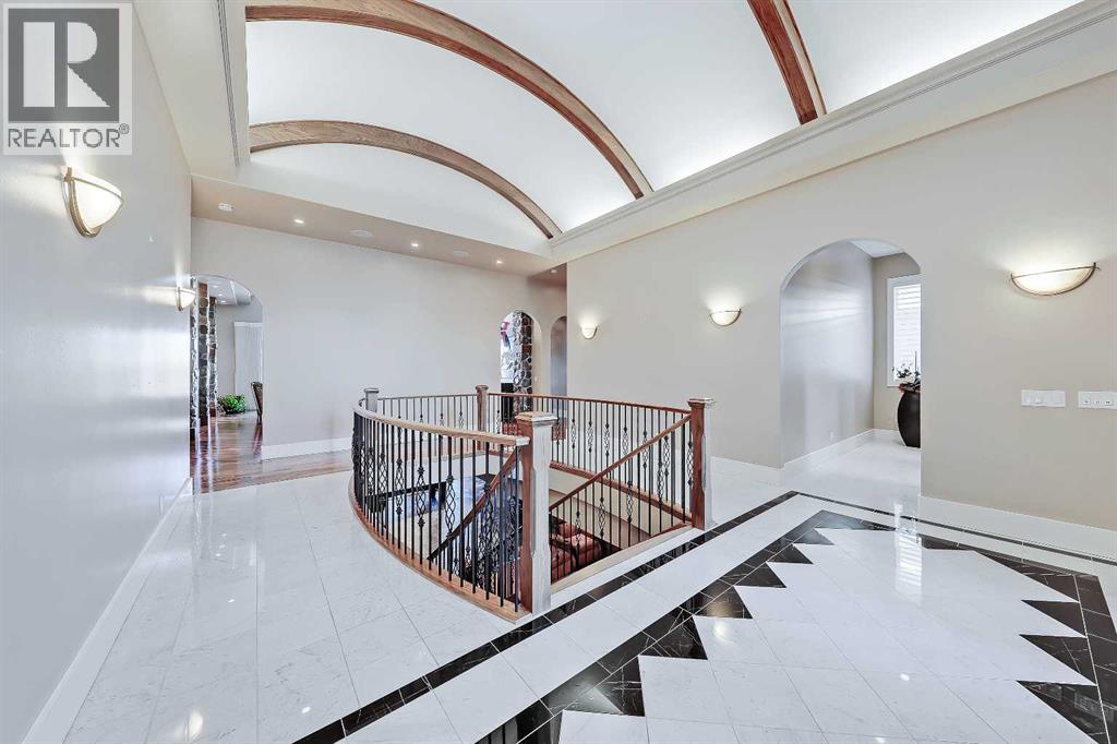 Wake up to sweeping mountain views from this timeless luxury home in prestigious Springbank Hill. Offering nearly 6,200 sq ft of refined living space across all levels, this residence blends classic design with modern comfort on a beautifully landscaped 0.30-acre lot surrounded by mature trees and lush greenery. The grand foyer sets the tone with an 18’ barrel-vault ceiling and Carrara marble floors, leading to a formal dining space with coffered ceilings and a custom stained-glass feature, and an elegant living room anchored by a 2-way fireplace and soaring barrel vault ceilings. West-facing windows frame mountain and community vistas, while French doors extend the living space outdoors to a massive private deck—perfect for evening relaxation or quiet entertaining that is virtually invisible to both neighbours. A gourmet kitchen anchors the home with custom hardwood cabinetry, dual islands, and premium appliances from Wolf, Sub-Zero, and Miele. The thoughtful layout also features a bright and airy breakfast nook and a walk-in pantry. Just off the kitchen is the full laundry room and mudroom that connects to the oversized triple garage. It features epoxy floors, a dog wash, and direct basement access, as well as additional side and front door access. The private main floor primary suite offers a serene retreat with a corner fireplace, private deck access, and a spa-inspired 5-piece ensuite featuring a steam shower, soaker tub, and dual vanities. Plus, a fully equipped walk-in closet features floor-to-ceiling storage for endless organization. Upstairs, a versatile loft with vaulted ceilings, skylights, and a fireplace offers an ideal office, library, or additional bedroom option, complete with its own 2-piece bathroom. The fully developed walkout basement is designed for both leisure and entertaining, featuring a large rec room with custom cabinetry and a wet bar, a dedicated home theatre and with some imagination, could be converted into a full-scale golf simulator! The basement also has two oversized bedrooms with private ensuites and walk-in closets. The basement also features a Tuscan-inspired full bath, perfect for showering off from the included hot tub. Outside, mature landscaping creates a private, forest-like setting, putting green, featuring a west-facing upper deck, a walkout lower patio with a hot tub, and a full-size putting green—all surrounded by stone accents and ambient lighting. Additional highlights include four fireplaces, in-floor heating, a Kinetico Water System throughout, dual central A/C, dual water tanks, high-efficiency systems, integrated home automation and security, and a durable clay tile roof. Every element reflects exceptional craftsmanship and enduring quality. Located moments from Aspen Landing, top-rated schools, and major routes, this home combines elegance, comfort, and convenience. Rarely does a residence with such commanding views and thoughtful design become available—experience the best of Springbank Hill living today. (31263456)