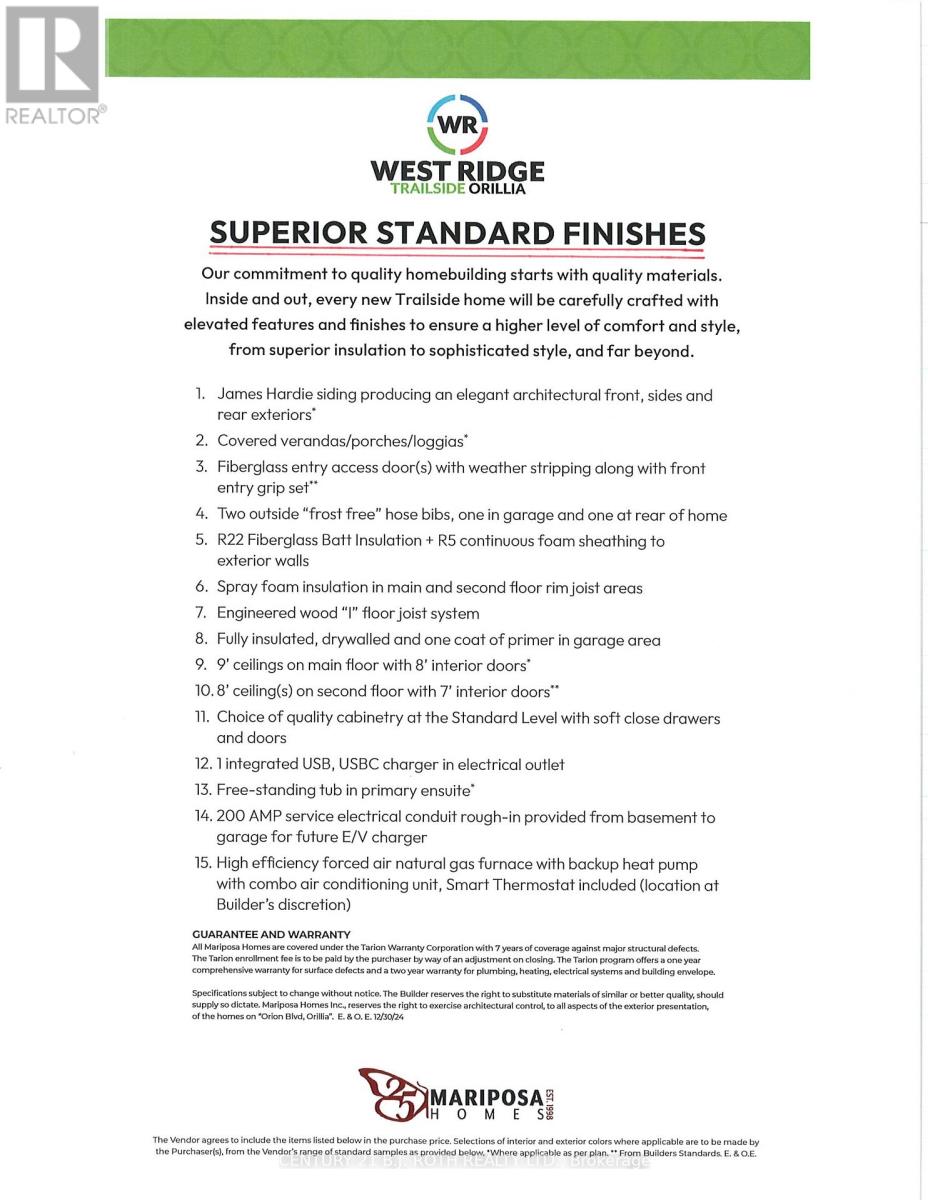 Located in Orillia's highly desirable West Ridge community, this brand-new home offers an exceptional opportunity to enjoy modern living in a prime location just minutes from a full range of amenities. From the moment you arrive the home's curb appeal stands out. Professionally landscaped grounds are complemented by an in-ground sprinkler system providing convenience for todays busy schedules. The exterior façades stone and Hardie board siding set the tone for the high level of finish and attention to detail found inside. The main level features a well-planned layout ideal for both daily living and entertaining. At the heart of the home the kitchen showcases ample cabinetry, quartz countertop and backsplash, and a 9' island perfect for gatherings. High end wide plank engineered hardwood floors seamlessly connect the dining and living area overlooking the 320 square foot covered deck in the backyard. Upstairs, the home offers four spacious bedrooms providing flexibility for families, guests, or home office needs. The primary bedroom serves as a private retreat complete with a beautifully finished ensuite that reflects the home's elevated standard of design. The additional bedrooms are generously sized and share a stylish full bathroom, completing the home's 2.5-bathroom layout. Complete with Tarion Warranty, this forever home is best appreciated in person. Schedule your private showing and experience everything this exceptional home has to offer. (41641825)