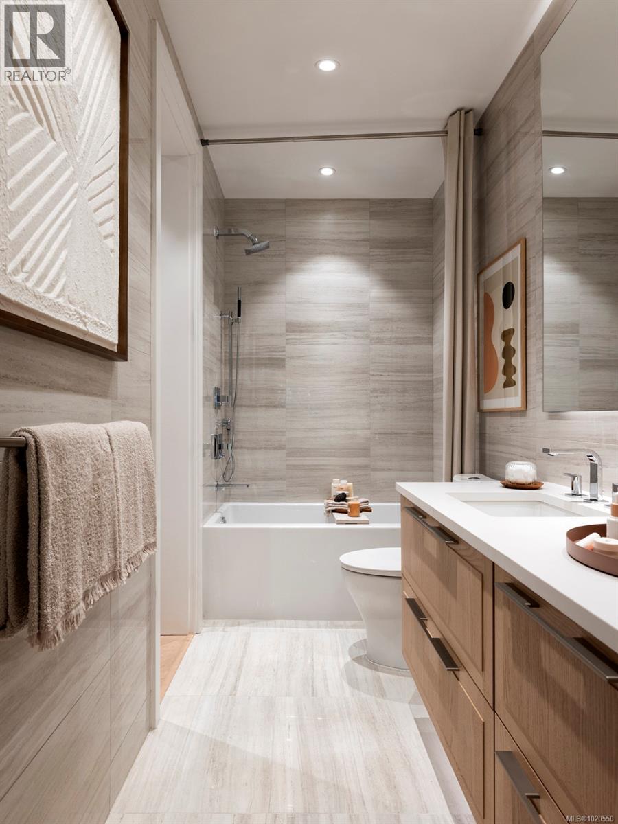 Welcome to Oakwoods by Aragon! This unique 1 bdrm/1 bath plan offers a modest level change, allowing the bedroom to overlook & look through the living area & features 8’ interior doors, 9’6” ceilings, herringbone-patterned engineered oak flooring & ample storage. Chef-inspired kitchen includes a full-size gourmet GE Monogram appliance package with 5-burner gas cooktop, polished tile backsplash and Italian ash cabinetry with floor to ceiling pantry for added storage. Spa-like bathroom has soaker tub & living room offers a brick feature wall with electric fireplace and a geothermal heat pump offers year-round comfort. Oakwoods residents will enjoy exclusive resort-style living with a well-equipped fitness centre, easy access to Janevca Kitchen & Lounge and newly opened Salt and Ivy Spa. Situated just a short walk from the water’s edge in the Saxe Point neighbourhood of Esquimalt and minutes from downtown Victoria, Oakwoods offers a community steeped in tradition. Move in this Fall! (30140738)