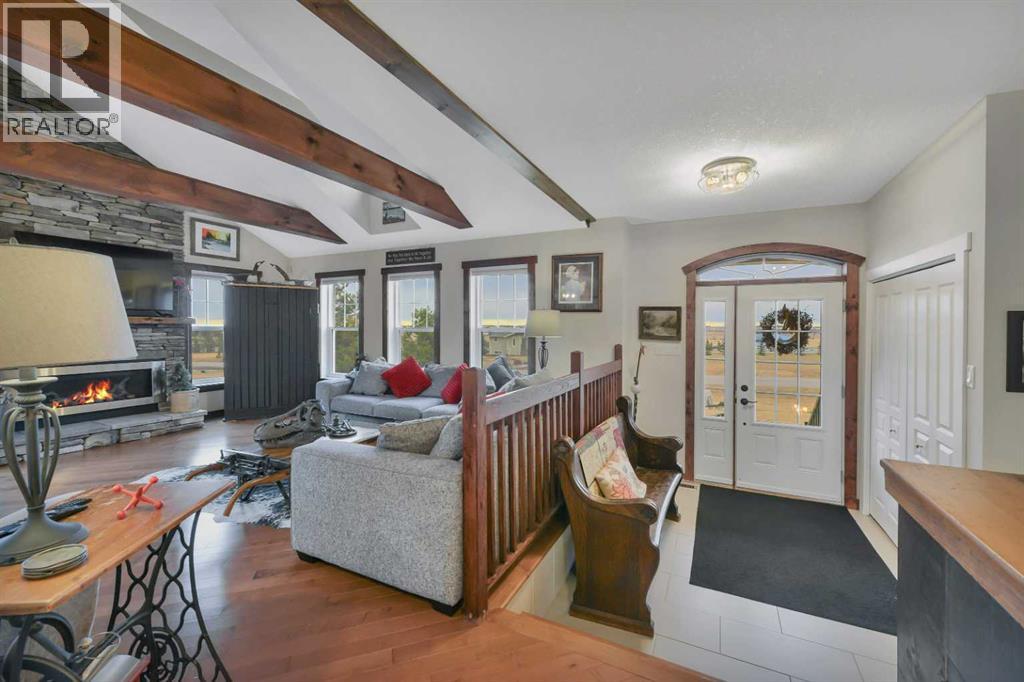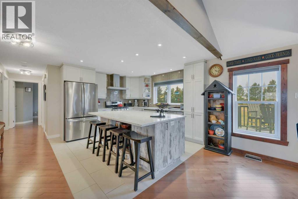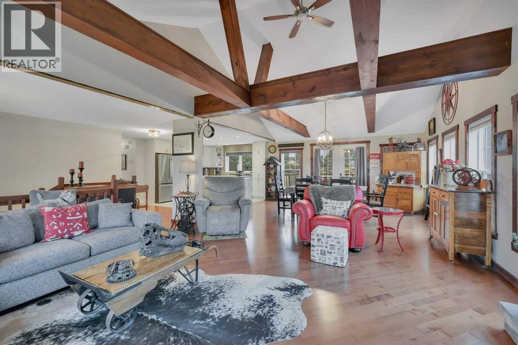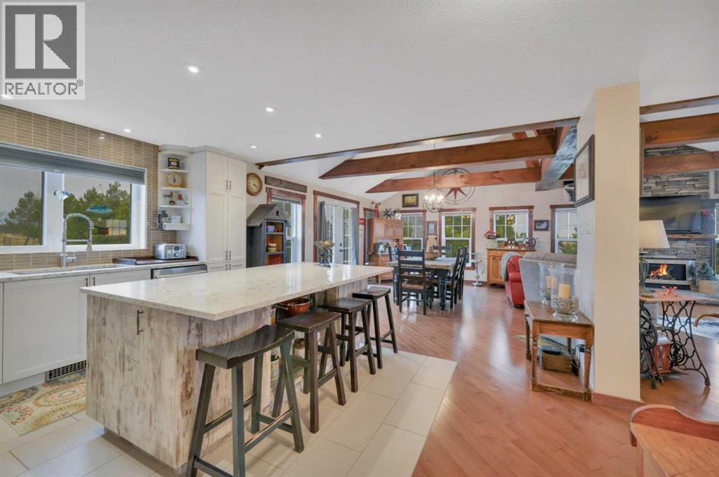 Welcome to this stunning 4-bedroom, 3-bath bungalow perfectly set on 0.99 acres of peaceful countryside just minutes from Rimbey. Combining high-end craftsmanship with warm rustic touches, this home is ideal for anyone seeking both comfort and function, with room to build your dream shop on the gravel prepped pad in back.Step inside and you’re greeted by vaulted ceilings with exposed wood beams and a floor to ceiling stone gas fireplace that anchors the bright, open-concept living space. The premium kitchen features Quartz countertops throughout, a large island, full-height cabinetry, stainless steel appliances, gas stove, and a spacious dining area that opens to the beautiful red cedar deck, perfect for entertaining or enjoying tranquil prairie sunsets.The main level includes two large bedrooms, highlighted by a primary suite with walk-in closet and spa inspired ensuite, featuring a frameless glass and tile shower. A second full bathroom also boasts custom tile finishes and a relaxing soaker tub.Downstairs, discover a fully developed lower level with in-floor heating, a generous family room, second full kitchen, two additional bedrooms, a full bath, and laundry, perfect for extended family, guests. Additional highlights include: Hydronic forced air system plus in-floor heating for year round comfort, Air conditioning and heated attached garage, Gravel base ready for shop or RV parking, Country setting with town amenities minutes awaySurrounded by trees and open skies, this property blends modern luxury with rural charm, offering exceptional value and versatility on nearly an acre of land. RImbey is a prime location for those wanting a more rural lifestyle with the amenities of city life, one of the only small towns with Hospital. (31395941)