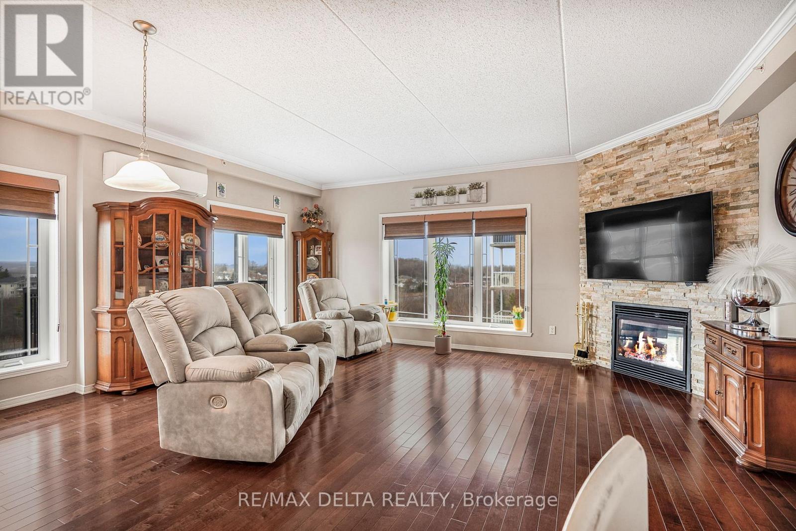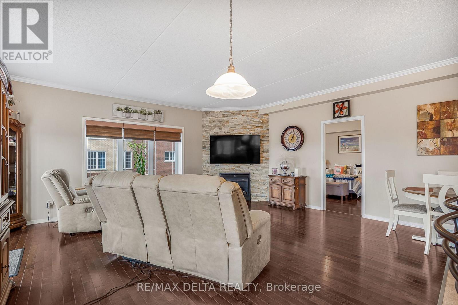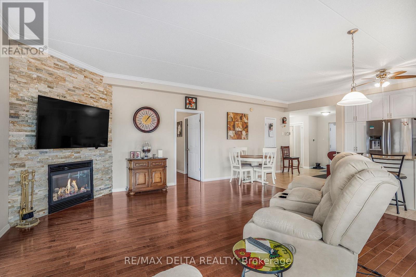 Welcome to this beautifully maintained northeast-facing 2-bedroom corner condo, offering breathtaking views of the river and mountains. Featuring hardwood and ceramic tile flooring throughout, this spacious and inviting unit is perfectly situated close to a variety of amenities.Step into a bright open-concept living space that includes: a spacious kitchen with abundant cabinetry and counter top space, a warm and welcoming living room with a natural gas fireplace, a dining area with patio doors leading to a generously sized balcony-perfect for relaxing. The large primary bedroom includes a walk-in closet and a full ensuite bathroom equipped with a step-in bathtub, thoughtfully designed for accessibility and safety. The second bedroom makes an ideal home office, guest room, or hobby space.A 3-piece main bathroom combined with a convenient in-unit laundry/mechanical room complete this well-laid-out condo. Additional features include: Heated underground garage parking (space #6), locker #38 for extra storage and elevator and secure intercom system. All appliances included in the asking price. As per Form 244: 24 hours irrevocable on all offers; Seller may respond sooner. Don't miss your chance to own this bright, comfortable, and ideally located condo with stunning views and exceptional features. Must be seen! (41743244)