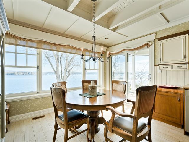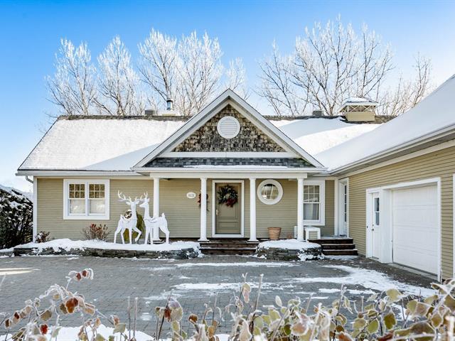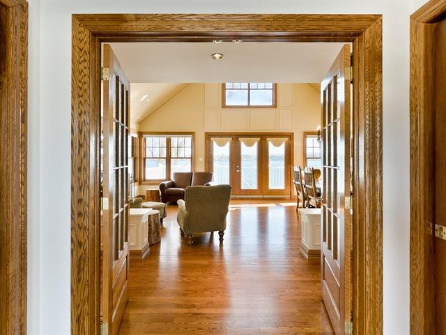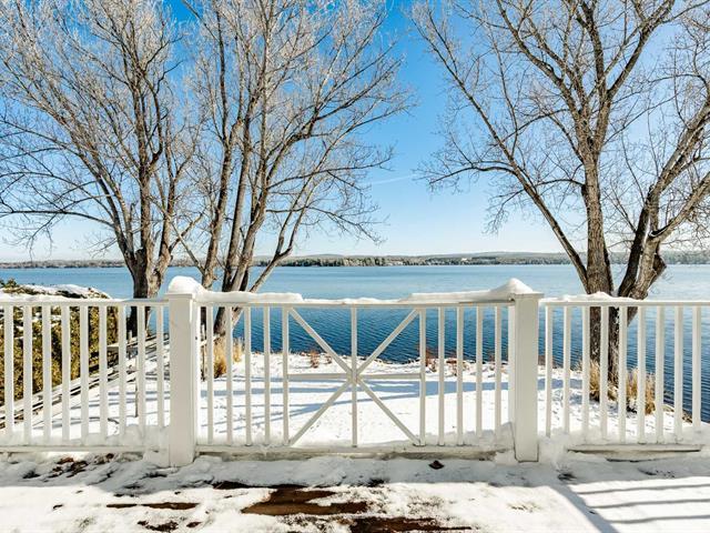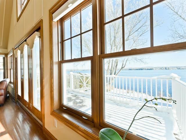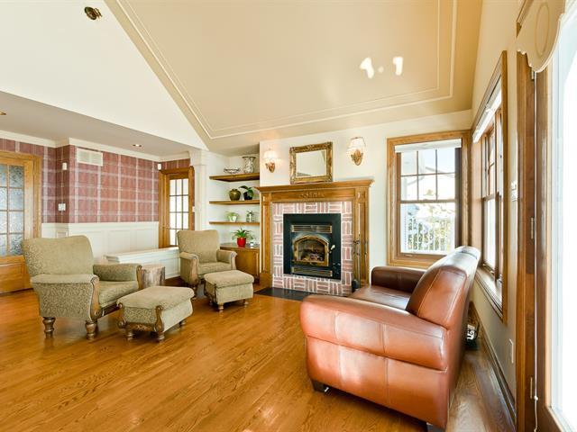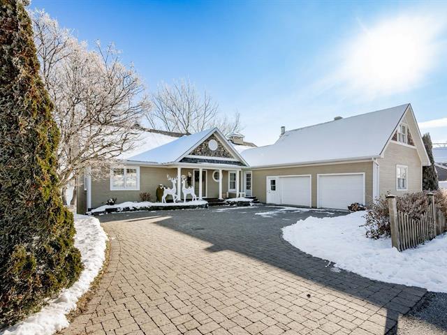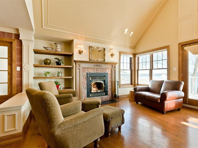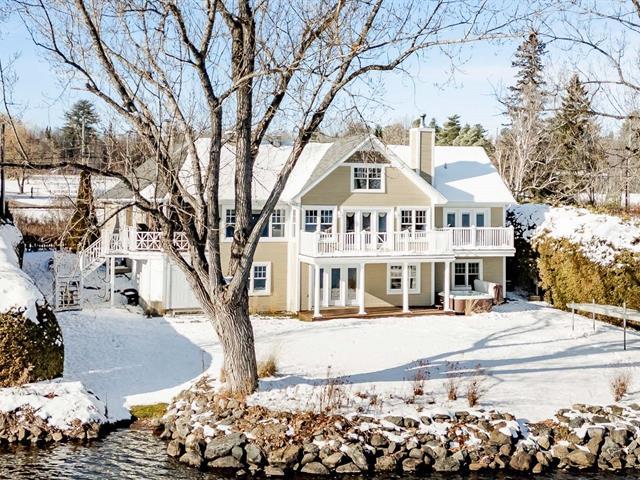 ±105 PI LAKE MAGOG WATERFRONT. COUP DE COEUR. Magog-Deauville sector. Elegant timeless residence with garden level basement facing the lake and double attached garage with home theater on upper level. Living areas offering cathedral, wooden floors, 2 fireplaces (in living room and one on the porch adjoining the kitchen facing south). Master bedroom on the ground floor with superb ensuite bathroom and balcony facing the lake. 3 bedrooms, 1 bath, office and family room on the garden level, offering superb view of the lake, opening onto a covered terrace with spa. Nice waterfront. A-10 in proximity, near urban services of Sherbrooke and Magog. (39285355)