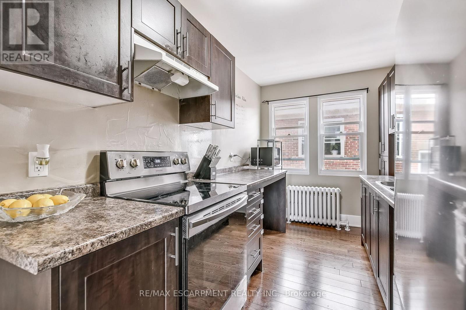 Fabulous 2 Bedroom Condo with Escarpment Views! Bright and spacious approx. 950 sqft. top-floor corner unit offering stunning west and south-facing views over the city and escarpment. This beautifully renovated condo features hardwood flooring throughout, a large sun-filled living room, separate dining area, and a functional kitchen with laundry hook-up. Enjoy two generous bedrooms and a full 4-piece bath. Permit parking available. Conveniently located close to walking trails, public transit, and St. Joseph's Hospital, perfect for professionals or downsizers seeking comfort and accessibility. (41765034)