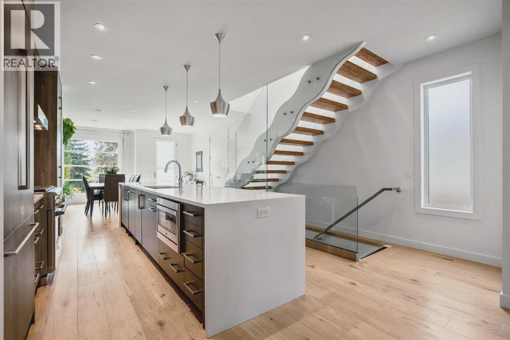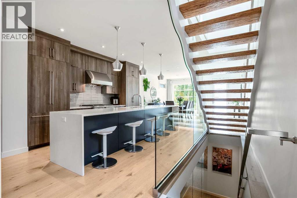 Walking distance to the Glenmore Aquatic Center, Stu Peppard Arena, Outdoor Track and Field as well as Lakeview Golf Course, 2 High Schools and St James School. Featuring a home with 2,638 square feet of developed un-parallel quality & design. Enter into 9' main floor ceilings, engineered hardwood flooring throughout. A front oversized family dining area blends into the central hub of the home, this amazing chef's kitchen offering top of the line Bosch & GE appliances including a wine fridge, gas stove, extended cabinets, soft close mechanics and a center island with a quartz waterfall and seating for 6. The custom gas fireplace is the focal of the back lifestyle room, with added built-in speakers, 2 upper transom windows and smooth access to the mudroom and outdoor space. Wavy mono risers with exposed industrial paralam steps and a glass railing are easily the most stylish way to the upper floor. Vaulted upper Ceilings with added Skylights creates a very open and inviting plan. 2 additional kid's rooms with their own shared 4-piece bath, convenient upper laundry adorn with a barn door and a front primary bedroom offering a walk-in closet for two, as well as a spa inspired 5-piece en-suite bath with an oversized tiled shower, free standing tub & dual sinks. The lower level is fully developed with a spacious recreation room, entertaining bar, 4th Bedroom a 4-piece bathroom and added storage. Enjoy summer nights or cozy fall days on the garden size deck, with space for all types of casual loungers and dining. A double detached garage for all the families' toys complete this space. With all this around you and a quick commute to downtown, local shopping and thriving amenities, this isn't just a home, but a lifestyle! (31439602)