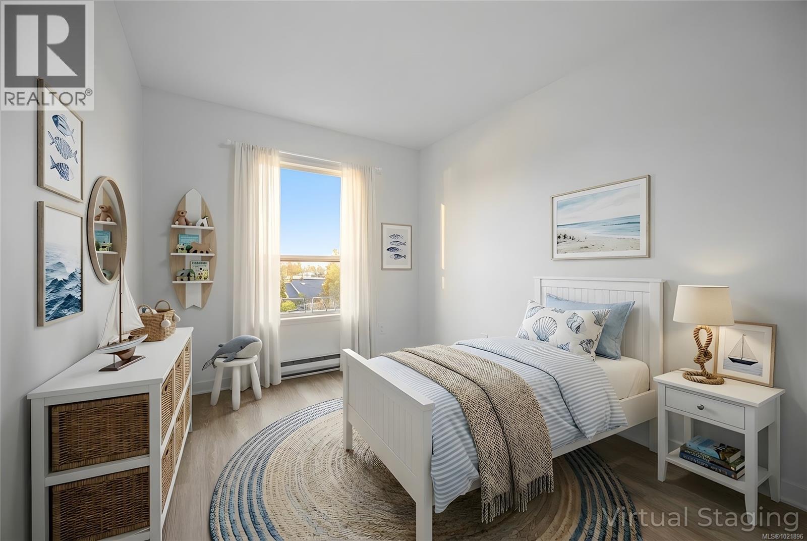 Virtual staging Bedroom with wood finished floors and a baseboard radiator
