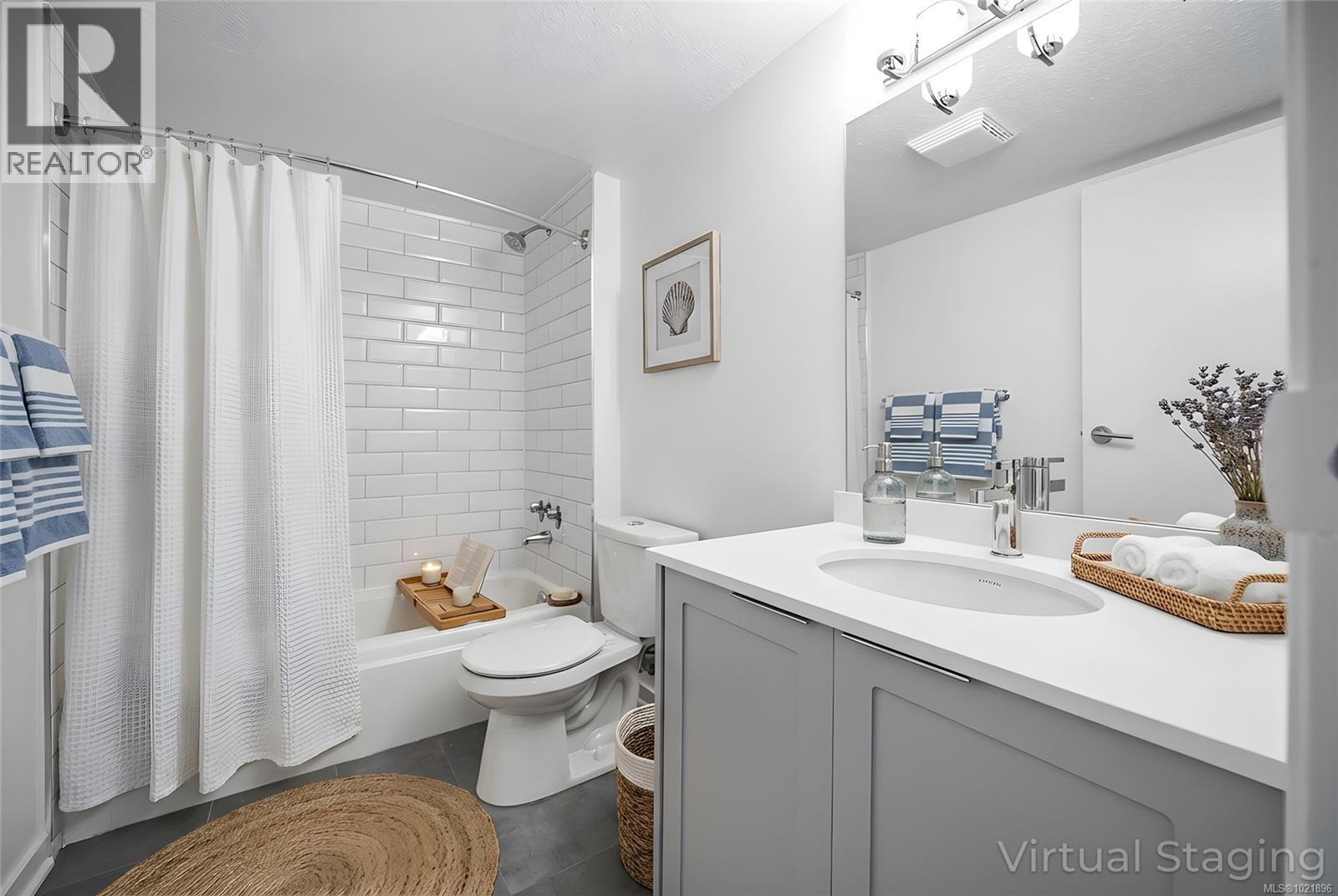 Virtual staging Full bathroom featuring shower / bath combo, vanity, and dark tile patterned flooring