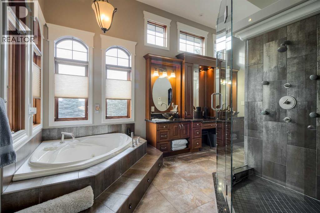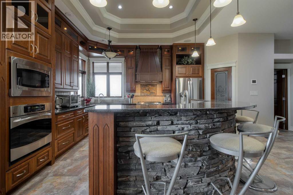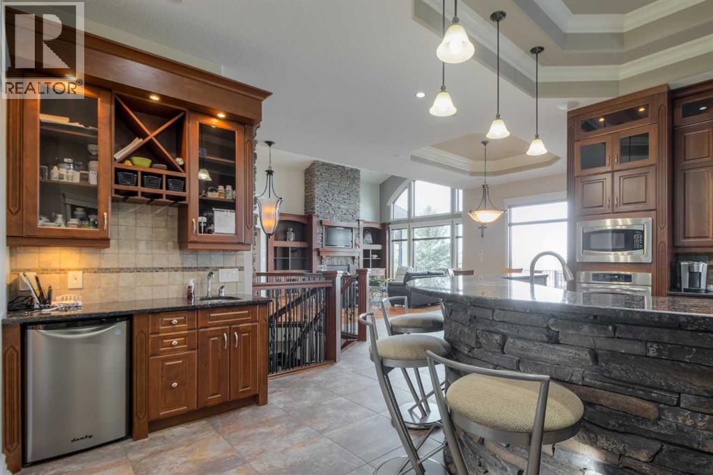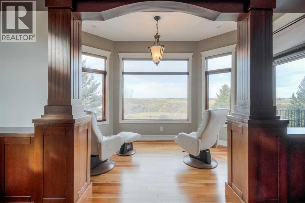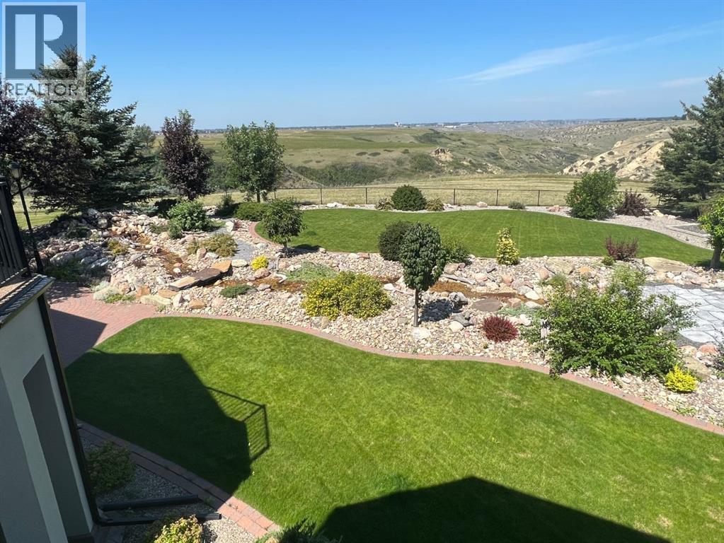 Welcome to this exceptional custom-built 2485 square foot Bungalow, perfectly positioned in a quiet cul-de-sac with breathtaking coulee views and a fully developed walk out basement. Thoughtfully designed with both luxury and functionality in mind, this home offers 4 spacious bedrooms plus a private office, main floor laundry room, an exercise room, and four beautifully appointed bathrooms, including a stunning five-piece en-suite retreat. The open concept main living area is ideal for everyday living and entertaining, while the lower level features a dedicated recreational space perfectly suited for the pool table or quilting table and a separate wet bar for hosting the guests. Triple pane windows, and radiant heat throughout the house and garage ensures year round comfort, complemented by a smart home security system for peace of mind. Car enthusiasts will appreciate the triple attached garage designed to accommodate a vehicle lift, while outdoor living is elevated with a professionally landscaped yard (has it's own running stream) two decks to enjoy the views from, and a private hot tub - perfect for relaxing while taking in the serene surroundings. There is a designated wine room, a water feature wall that runs from upstairs to down, beautiful staircase, and tons of storage throughout the home and garage. A rare combination of craftsmanship, location and lifestyle, this remarkable home offers refined living in one of the areas most sought-after settings. (31467531)