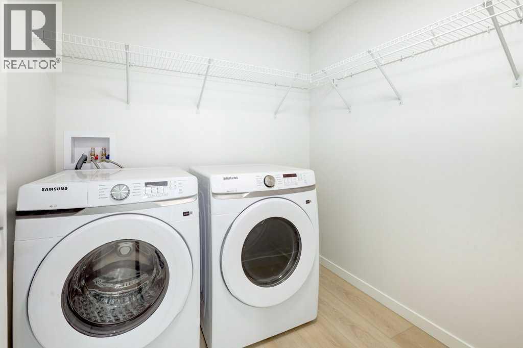 INTRODUCING GLACIER RIDGE, IN BEAUTIFUL NORTHWEST CALGARY. BUILT BY CEDARGLEN LIVING, WINNER OF THE Customer Insight BUILDER OF CHOICE AWARD, 6 YEARS RUNNING! BRAND NEW "GR07R" unit with high-spec features. You will feel right at home in this well thought-out, 915.99 RMS sq.ft. 2 bed, 2 bath home with open plan, 9' ceilings, LVP flooring throughout (NO CARPET), Low E triple glazed windows, BBQ gas line on the patio, Fresh Air System (ERV), A/C rough-in, and so much more. The kitchen is spectacular with full height, two tone cabinets, quartz counters, upgraded bank of drawers for pots and pans, undermount sink, rough-in water line to the fridge and S/S appliances. The island is extensive with built in flush breakfast bar, which transitions into the spacious living area, perfect for entertaining. The spacious primary bedroom has a large bright window (triple pane windows) and huge walk-in closet. You'll be impressed with the 4pc ensuite with double vanities and stand up shower. The second bedroom is located on the other side of the unit for privacy and a 4pc bath with quartz counters, and undermount sink is located next to it. Nearby is the spacious laundry/storage room, this is a must see (washer & dryer included). Highlights include: Hardie board siding, designer lighting package, sound reducing membrane to reduce sound transmission between floors, clear glass railing to balconies and 1 titled underground parking stall included. A once in a lifetime community in Northwest Calgary. Framed by views of the Rocky Mountains and distinguished by natural coulees that cross the land, Glacier Ridge offers a rare chance for families to live in a new community. PET FRIENDLY COMPLEX, IMMEDIATE POSSESSION AVAILABLE AND DON'T FORGET TO CHECK OUT THE VIRTUAL TOUR. (31470840)