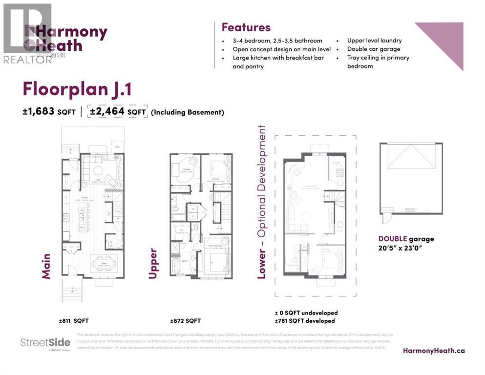 Closing in on builder completion, it could not be a better time to have a closer look a 1145 Sailfin Heath, located in StreetSide’s newest Harmony Development, Harmony Heath! Just a stroll away from the near-future village core, Nordic spa, and 140 acres between two lakes, this interior J.1 Floorplan home has a south-facing lot with a hardscape backyard for less maintenance. This home includes $16,350 of upgrades, including an upgraded Bosch appliance package with slide in gas range and French-door fridge, full heighfull-heightin oak + white dual tone, lockers in the rear mud room, upgraded tiles on the bathroom floors and en suite walk in shower, extra drawers in the main bathroom vanity, and AC rough-in. Standard features include carpet with 10lb underlay on the upper floor and stairs, LVP throughout the main floor, pendant lights over the island and chandelier in the dining room, Hardie Board siding, triple-pane windows, double-car garage, landscaping and fencing! With the mountains minutes west and the city at your back, you’re nestled in the heart of it all, offering that desired balanced lifestyle. Whether you want to hit the water for an early morning paddle, connect with your neighbours at community gatherings, rediscover nature at your doorstep or stroll through the soon-to-be village core boutique shops with a latte in hand. Lake living, mountain views, and unmatched amenities allow a complete lifestyle in Harmony. The well-thought-out J.1 Floorplan is expertly designed with you in mind, spanning 1683 sqft of living space across the upper two levels, including three beds + 2.5 baths, with the option to develop the basement later, offering a potential 781 sqft of recreational space. Please visit our brand new showhome at 1176 Sailfin Heath to find out more about owning this almost complete luxury townhome and choose a community that supports the balance you’ve always dreamed of. 10 minutes outside Calgary and 45 minutes to Canmore. (31485086)