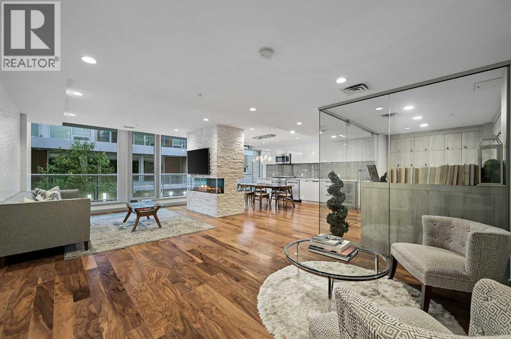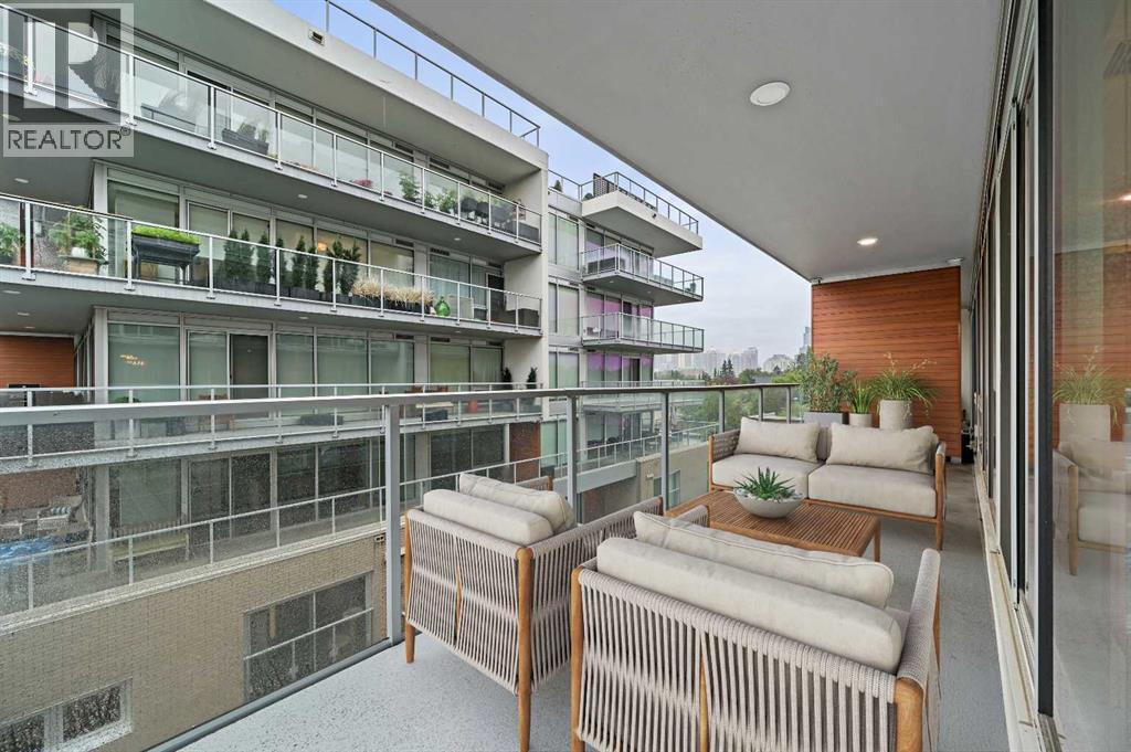 Welcome to Ezra on Riley Park, a truly unique address in the heart of Hillhurst, where stylish city living meets the serenity of nature. Nestled along the edge of the iconic Riley Park, this sophisticated 2-bedroom, 2-bath condo offers a rare opportunity to experience the best of inner-city Calgary—with breathtaking views, upscale design, and unmatched walkability. From the moment you step inside, you'll feel the difference. A spacious foyer welcomes you with beautiful textured engineered hardwood flooring, leading you into a thoughtfully designed open-concept living space filled with natural light streaming in through floor-to-ceiling windows. This home is perfectly framed by views of the lush greenspace just beyond, creating a seamless connection between indoor luxury and outdoor beauty. The kitchen and living area blend harmoniously, surrounded by oversized windows and double French sliding doors that open onto an expansive wrap-around balcony—an incredible outdoor living space measuring over 59 feet in total length, ideal for morning coffee, evening cocktails, or relaxing in your private oasis above the park. The modern kitchen boasts sleek stainless steel appliances, stylish white cabinetry with fridge panels to match, elegant glass tile backsplash, durable and beautiful silgranite sink and quartz countertops for a clean, contemporary finish. Both bedrooms are bright and inviting, featuring built-in closet organizers and a soft, modern color palette. The primary suite enjoys its own wing of the wraparound balcony and a private 4-piece ensuite, complete with classic tile flooring, full tile shower and tub combo and quartz vanity with undermount sink and built-in vanity. The second full bathroom, located near the entry for guests or family, mirrors the home’s elevated aesthetic. You'll also appreciate the in-suite laundry room, central air conditioning, and ample storage throughout. Additional highlights include a titled underground parking stall in a secure, hea ted parkade, assigned storage locker, access to a premium fitness centre and chic party room with your very own wine locker, pet-friendly and impeccably maintained building. Beyond your doorstep is the best of Calgary’s urban lifestyle. Riley Park as your backyard, complete with a cricket pitch, wading pool, new playground, and the Senator Patrick Burns Rock Garden. Steps from the Hillhurst Sunnyside community centre with tennis courts, weekly farmer’s markets, and live music. Easy stroll to the Kensington shopping district, Bow River pathways, SAIT, Jubilee Auditorium, cafés, transit, and the downtown core Ezra on Riley Park is more than a condo—it’s a lifestyle of tranquility, convenience, and contemporary charm in one of Calgary’s most vibrant, connected neighborhoods. Don’t miss this rare opportunity to live stylishly above the park—schedule your private showing today. (31495873)
