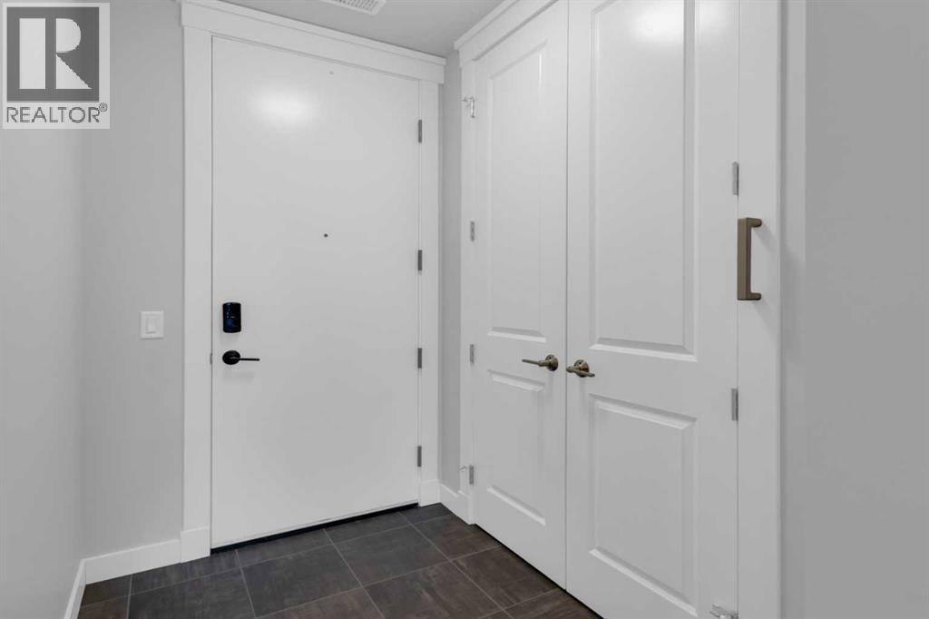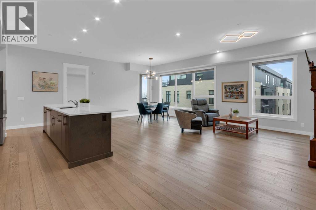 Welcome to Capella in University District, a small condo building with only 8 Estate Style single level luxury homes. This spacious and well laid-out 2 bedroom, 2 bathroom condo with single garage is just steps away from all of the amenities this highly desirable community offers. Located on the third floor is this modern residence with hardwood flooring, 10 foot ceilings, many large windows, central air conditioning, designer bathrooms and well-equipped spacious kitchen. The open concept main living space is flooded with natural light and features a sleek kitchen with expansive island, quartz countertops and full height cabinetry. The kitchen opens directly on to the dining space, the living room with electric fireplace, and a nook that works well for a den/office or as space for additional furniture. The bright primary suite offers enough space for a king size bed, a walk-in closet, and a 5-piece ensuite with heated floors, free standing tub, dual vanity, and fully tiled walk-in shower. The second bedroom has a murphy bed, a full bathroom across the hall, and is located on the other side of the condo from the primary bedroom, providing privacy between the bedrooms. Enjoy the morning sunrise on the spacious east-facing covered balcony that is equipped with a gas line for your BBQ or heater and a water line. The private, heated singe garage is attached to the building has epoxy floors, storage space, and a water softener for the condo unit. This well cared for building is part of a 7 building complex that offers a fitness centre, visitor parking, and courtyard spaces. Conveniently situated within walking distance to a grocery store, restaurants and coffee shops. Steps away from Market Mall, the U of C and the Children's Hospital and a quick commute to downtown and access out to the mountains. (31501795)