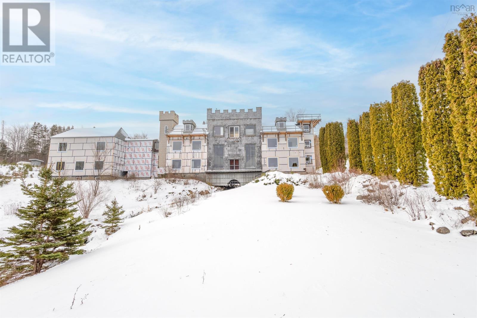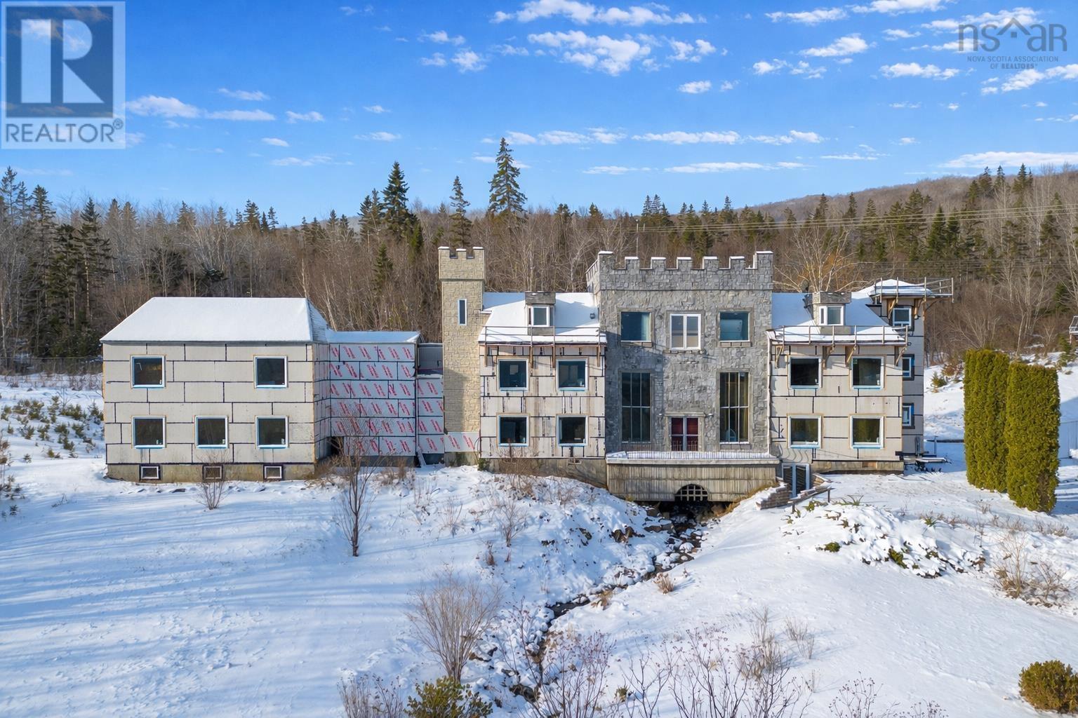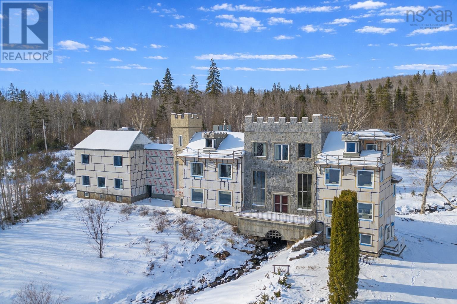 A Cape Breton Castle! This extraordinary property presents a rare opportunity to complete and reimagine a landmark estate on almost 160 acres in Aberdeen, Cape Breton Island. Built in 1992, the castle-inspired structure is set within a striking natural landscape, highlighted by a rushing brook through the grounds, creating a truly unique atmosphere. Originally designed with commercial use in mind, the property has successfully operated as a luxury bed and breakfast and offers strong future potential as a retreat centre, boutique resort, or private estate. The expansive layout spans multiple levels and includes large common areas, 12 guest suites, a commercial kitchen, dining space, and recreational areas, reflecting the scale and ambition of its original vision. Significant progress has been made under current ownership, with major construction completed & extensive landscaping. Most of the exterior walls have been fully replaced with new studs, sheathing and most new windows installed, apart from the 'Great Room', providing a solid and modernized building envelope including most new roofing shingles. Interior finishing, including flooring, drywall in select areas, and painting, allowing a new owner to customize the final design and bring the project to completion. With the most intensive structural work behind you, the property is well positioned for transformation into an impressive destination. Surrounded by acreage, natural water features, amazing water views and access to the Bras dOr Lake, this is a rare offering for a buyer prepared to invest in completing a truly iconic Cape Breton property with exceptional scale and future potential. Purchase options could include a partnership opportunity with current owner who has an in-depth & profitable business plan along with a vision and passion for the property that was thought-out with the sellers late partner. A Cape Breton Castle could be your family legacy! (231834662)