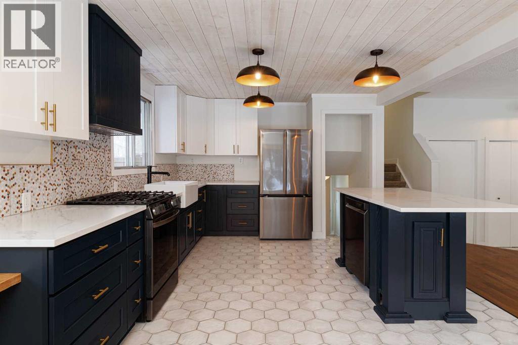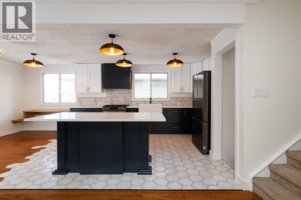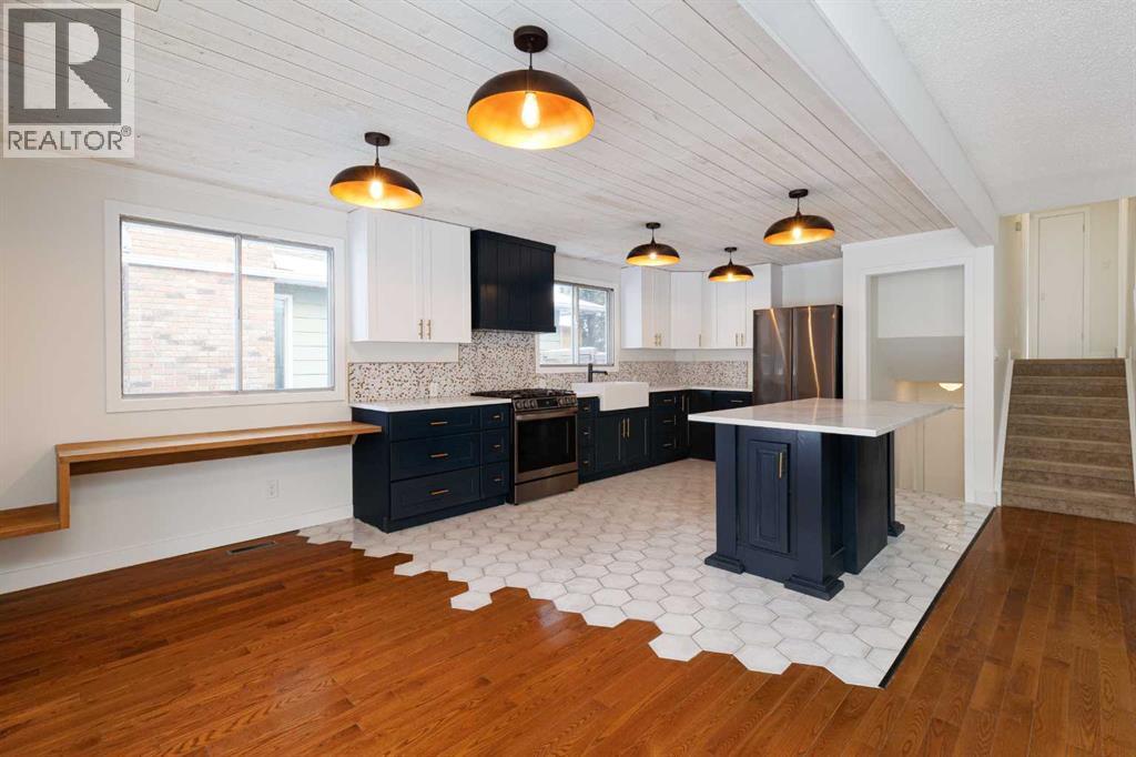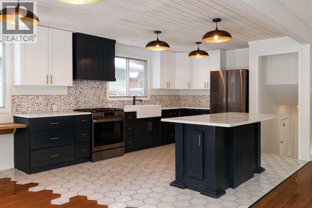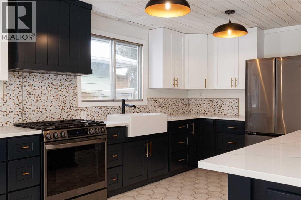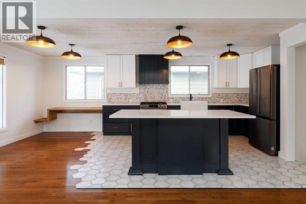 OPEN HOUSE - SATURDAY, JAN 31 2:00-4:00. Welcome to this stunningly transformed 4-level split in the heart of Queensland, where mid-century charm meets contemporary luxury. No expense was spared in this top-to-bottom renovation, offering 1,738 square feet of finished living space. The main floor is a showstopper, featuring an open concept layout with gorgeous hardwood flooring and a custom kitchen. The culinary space boasts sleek navy and white cabinetry, a large central island, quartz countertops, a classic farmhouse sink, and a unique hexagonal tile transition that seamlessly blends the kitchen and dining areas. Large windows and dual skylights flood the space with natural light, highlighting the modern wood plank ceiling and industrial-chic lighting. Relax in the expansive living room, anchored by a sleek, minimalist fireplace with a slate hearth. Retreat to the upper level where you will find three generously sized bedrooms, including the primary with two piece ensuite. The lower level provides even more versatility with a massive recreation room—perfect for a home theatre or play area—along with a fourth bedroom and a second full bathroom, making it an ideal space for guests or teenagers. The basement level houses the laundry and a large open space ensuring you’ll never be short of storage. A separate entrance walks up to the large private yard with mature trees and plenty of space to roam. An oversized double detached garage and parking space for your RV complete this property. This home is ideally located and is just minutes from schools, shopping, the ridge at Fish Creek Park, and an off leash dog park. Don’t miss your chance to own one of the most uniquely renovated homes in this established, quiet community! (31516148)