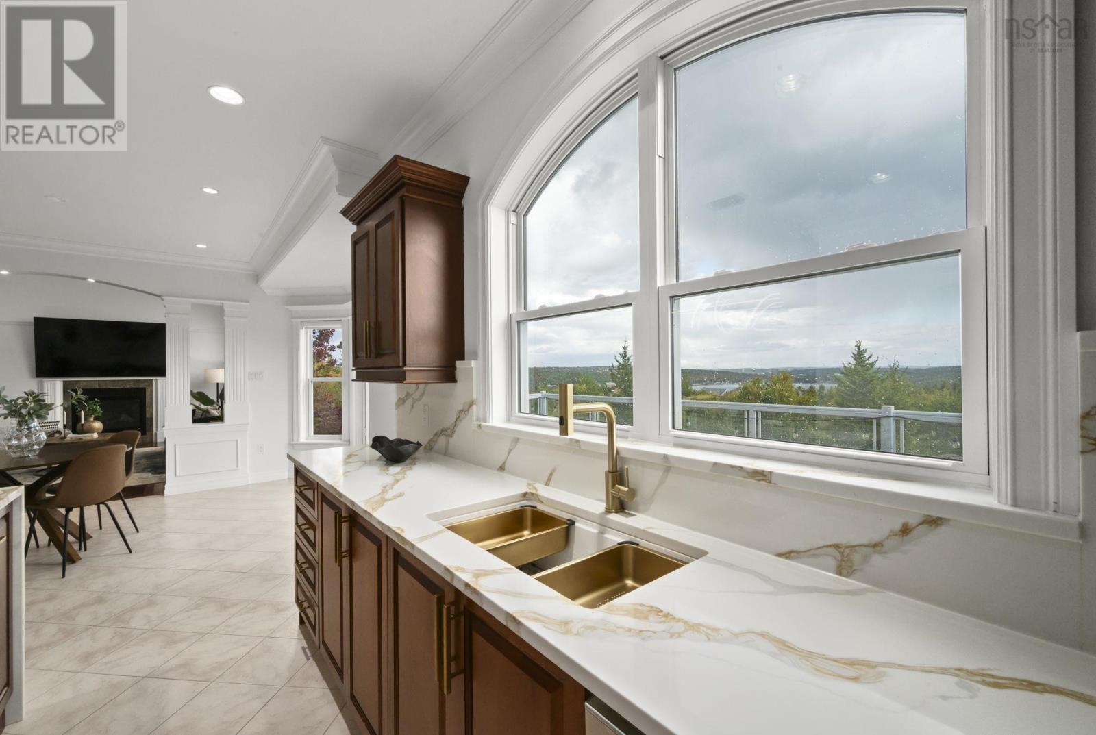 Roll out the red carpet! 24 Vanier Way is ready to deliver the royal treatment! From its commanding curb appeal to its sweeping Bedford Basin views, this executive two-storey delivers luxury on a grand scale. Nearly 4,000 sf of living space unfolds across three levels with five bedrooms, four baths and endless flexibility for the way you live- think home office, media lounge, guest quarters or all of the above. Inside, the main level dazzles with a soaring foyer, hardwood and ceramic floors, crown mouldings, wainscotting, and elegant columns. At its heart, a vaulted living room with propane fireplace steals the show, anchored by an oversized Venetian window that frames sparkling water vistas. The space flows effortlessly into a breakfast nook and a newly renovated gourmet kitchen where fresh granite countertops, a matching backsplash and abundant cabinetry make both everyday living and entertaining a breeze. Upstairs, the primary suite reigns supreme with panoramic basin views, a massive walk-in closet, and a regal ensuite accented with columns. Two additional bedrooms, another full bath and laundry complete this floor. The lower walkout level continues the versatility with a supersized rec room, two more bedrooms (or flex spaces), another full bath and storage galore. The double car garage stays clutter-free thanks to an 8x8 shed, while curb appeal shines with an exposed aggregate driveway, fresh sod, and meticulous upkeep. Outdoors, freshly poured concrete steps lead to the backyard, where a concrete platform beneath the deck is perfectly poised for that dream hot tub. Recent upgrades bring a fresh polish to every corner- full interior and garage repaint, a new hot water tank, partial chain-link fencing, updated light fixtures, and smart thermostats just to name a few. Add in the integrated home audio system and youve got a space thats as functional as it is stylish. This isnt just a home-its a lifestyle upgrade designed to impress at every turn! (231854710)