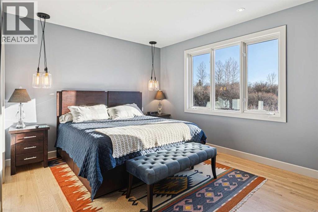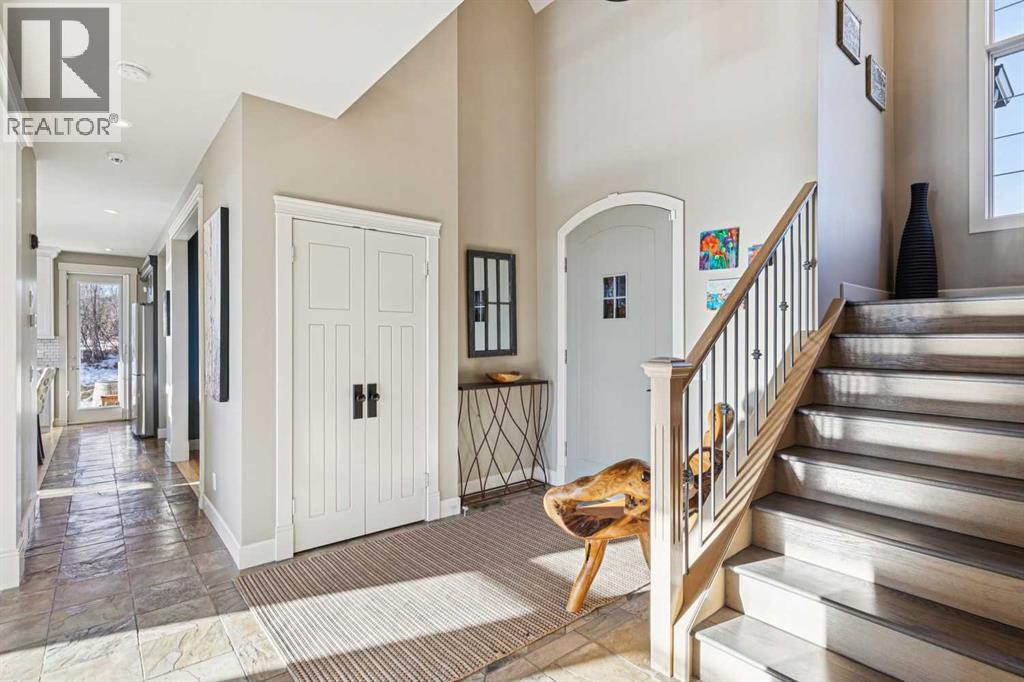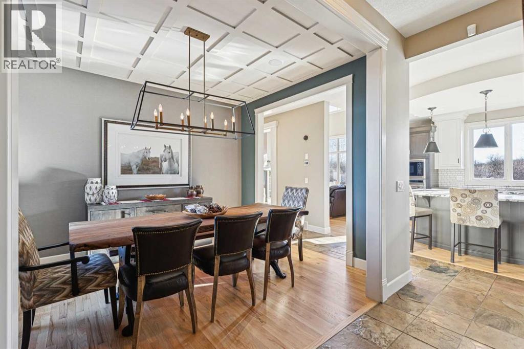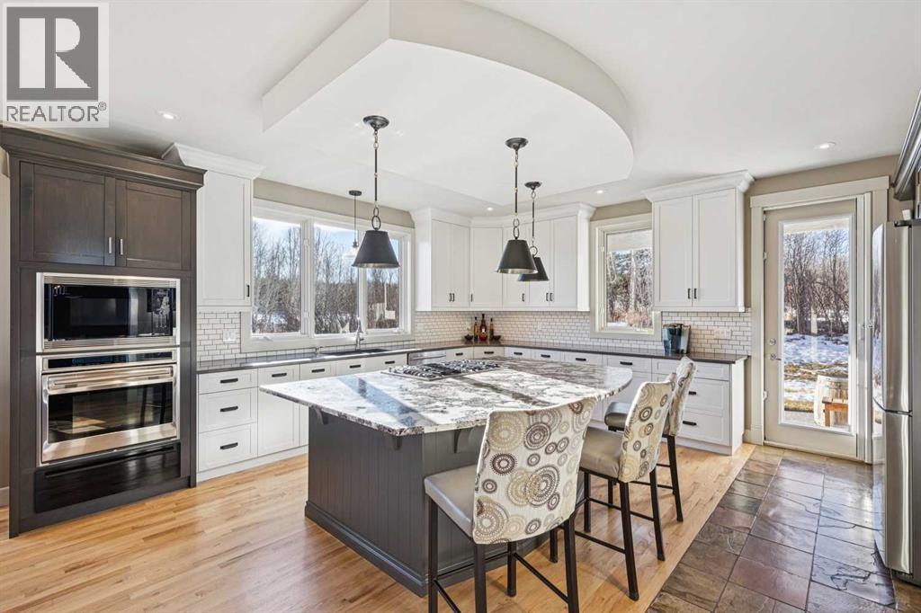 The French countryside awaits you in this spectacular 2,900 square foot one and one-half storey bungalow on a two-acre lot in the three-time award-winning “Canada Community of the Year”, Elbow Valley. Nestled in the Elbow River Valley, just west of Calgary, this prestigious community offers genuine estate living alongside unrivalled amenities. This beautifully upgraded and renovated home offers a dramatic open staircase, two storey foyer and great room ceilings, refinished quality hardwood floors throughout the main floor, staircases, and upper level. The professionally renovated kitchen was expanded and features shaker-style cabinets with soft- close doors, quality Wolf and JennAir stainless steel appliances, a feature center island with a special one-piece curved leather-finished granite cooktop. The formal dining room, warm and inviting with its coffered ceilings and hardwood floors, is perfect for entertaining. The main floor primary bedroom features a walk-through closet with custom built-ins and a luxurious ensuite bathroom that has heated porcelain tile floors, 10-mil glass shower, quartz vanity countertops, and double sinks. Overlooking the great room below, the upstairs boasts two large bedrooms, each with a full ensuite bath, walk-in closets, and incredible views. Professional walkout basement development is perfect for the mature family with a billiards/games room, a family room with a built-in entertainment center, a custom bar, a second fireplace, a full bath, two more bedrooms with new flooring, and multiple storage spaces to utilize by design. No-maintenance landscaping designed to blend into the natural surroundings features an exposed aggregate patio, a dry creek bed, a continuous curb, a natural Rundlestone exterior, and total privacy. Oversized triple attached heated garage with a developed 300 sq. ft. bonus room, perfect for a man cave, home office, or storage. Walk-up staircase to the garage, slab heating in the basement, upgraded mechanical, a nd 200-amp service. A blend of smooth-finished and knocked down stipple ceilings, renovated baths, upgraded lighting, solid core doors, nine-foot ceilings, laundry on the main and upper levels, clad windows in good condition, with three new triple pane windows added. From its sweeping views and prime location to its thoughtful design and upgrades, this beautiful Elbow Valley home is an absolute must-see! (31537358)