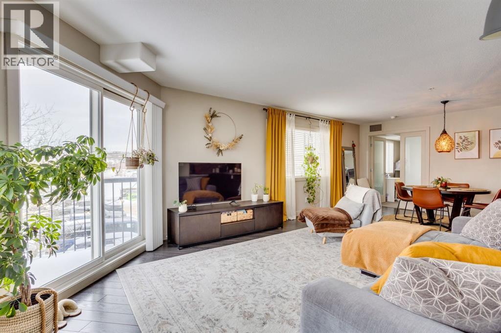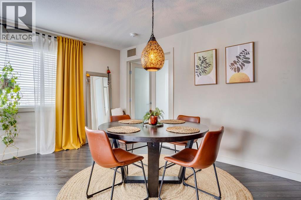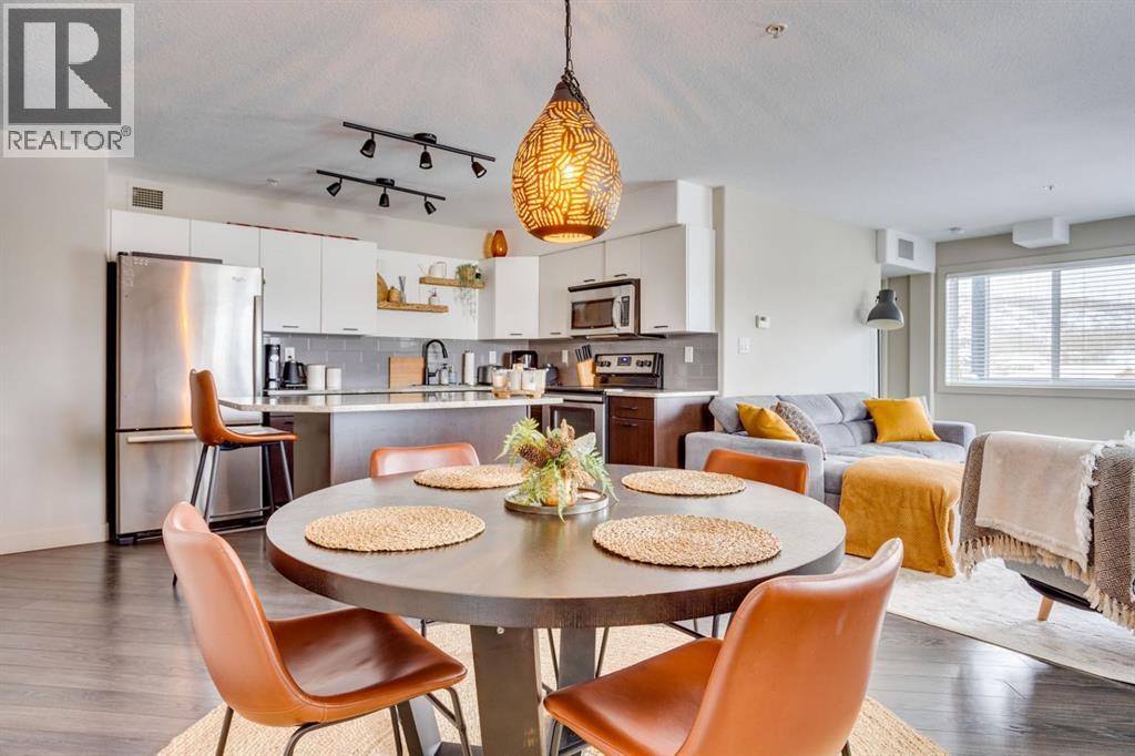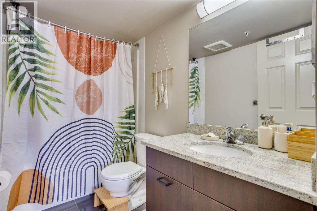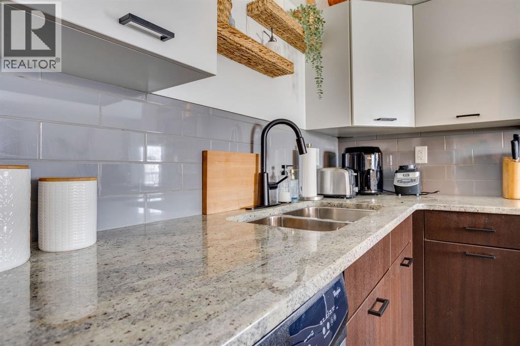 Beautiful Executive Corner Unit in the Heart of DowntownWelcome to Hangingstone Landing, a prestigious downtown residence offering an exceptional executive-style second-floor corner unit with enhanced privacy and a desirable south-facing balcony. This well-appointed 811 sq. ft. open-concept condominium features two bedrooms and two bathrooms, thoughtfully designed to maximize comfort and functionality.The bright, modern kitchen is equipped with laminate flooring, crisp white cabinetry, granite countertops, and a convenient eat-up breakfast bar, complemented by ample cabinet and counter space. The home also features stainless steel appliances, including a refrigerator, stove, microwave, washer, and dryer, along with a stylish grey subway tile backsplash.Both bedrooms are generously sized and offer plush carpet flooring and large windows that allow for abundant natural light. The primary suite includes a walk-through closet and a four-piece ensuite bathroom with a tub/shower combination. The secondary bedroom is directly connected to an additional three-piece bathroom, which also features a secondary entrance from the main living area—providing added convenience for guests or family.The main living area is highlighted by laminate flooring, central air conditioning, and expansive windows, with direct access to a balcony, ideal for relaxing or entertaining.Additional features include one titled underground parking stall. Residents of The Hanginstone Landing enjoy access to premium amenities, including a fully equipped fitness room. Condo fees conveniently cover water, heat, garbage, exterior insurance, and reserve fund contributions.This exceptional corner unit offers refined urban living in a highly desirable downtown location. (31541871)