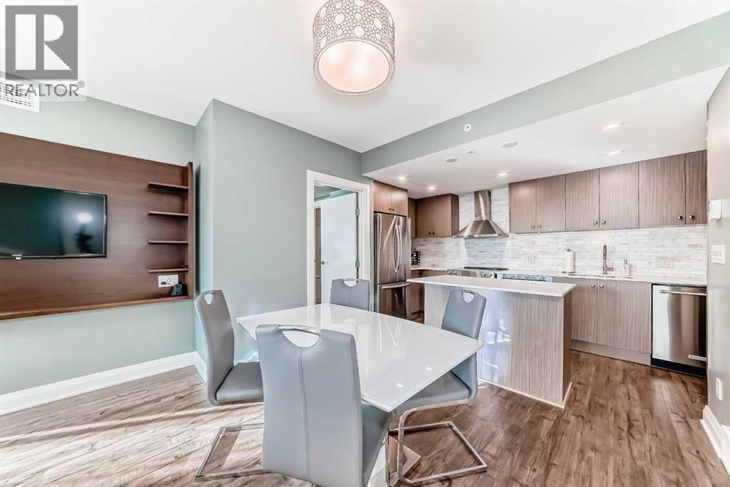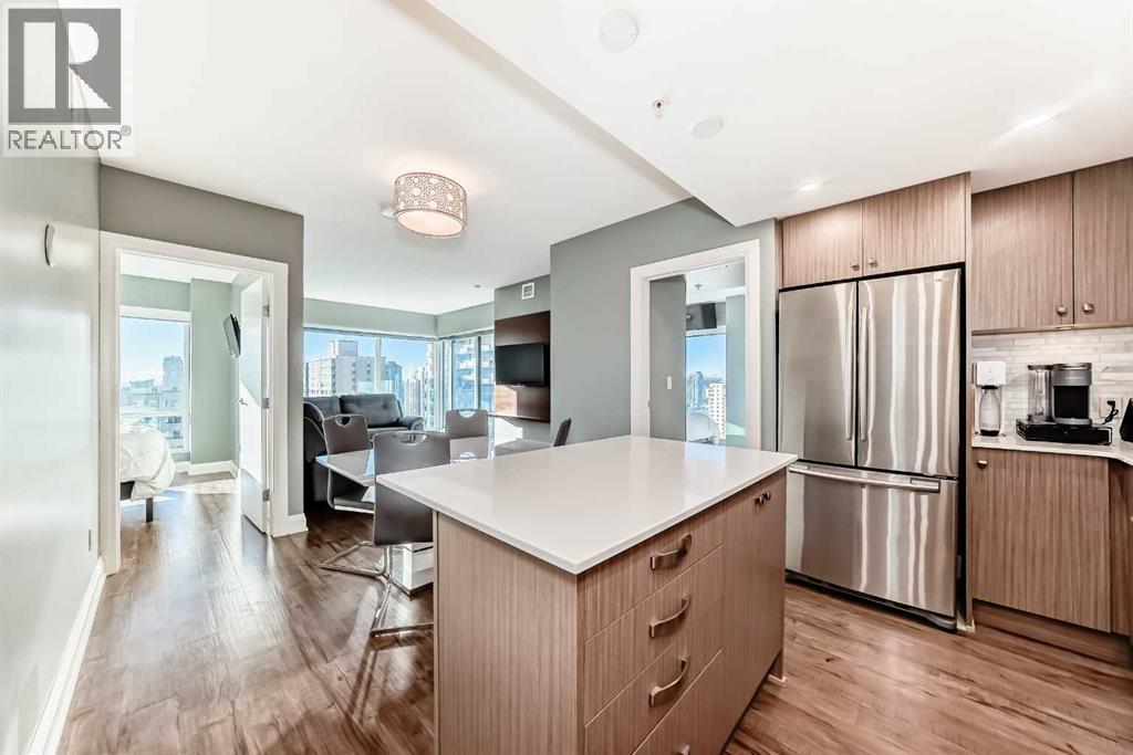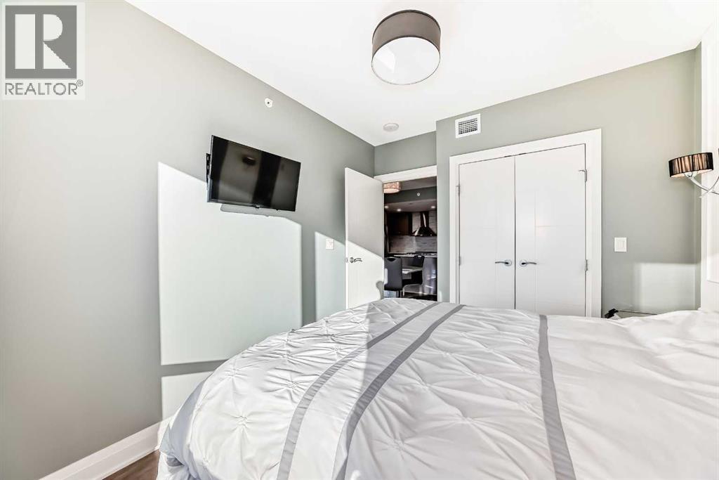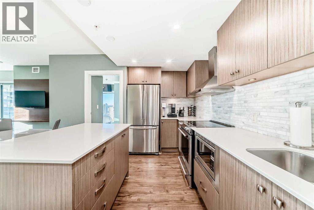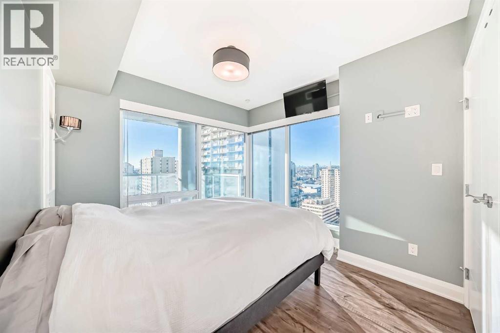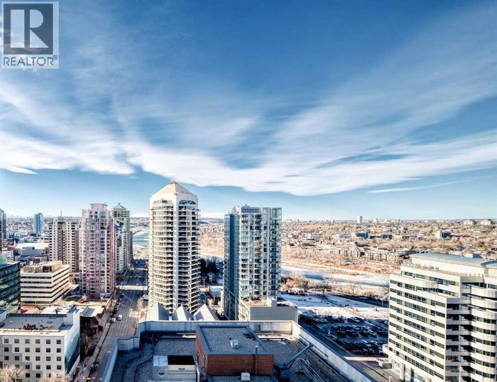 Experience the pinnacle of downtown luxury in this 2 bedroom, 2 bathroom, titled parking, SW-facing corner unit at VOGUE. Sold fully furnished and turnkey, this "Orion" floorplan is situated on one of the exclusive "Bedouin Suites" floors, featuring elite upgrades not found in the rest of the building.Floor-to-ceiling windows frame breathtaking mountain and river views, flooding the space with natural light. The interior boasts premium walnut built-ins, custom bedroom paneling, and a chef-inspired kitchen with an upgraded central island and quartz finishes. Both bedrooms act as private retreats, flanking the living area for maximum privacy. Perfect for investors, professionals and empty nesters. Beyond the unit, enjoy executive amenities including a 36th-floor Sky Gym and 24/7 concierge. Prime West End location steps to the river pathway, C-Train, downtown, and trendy Kensington. Condo fees are $610.35/month, including all utilities except electricity. (31543421)