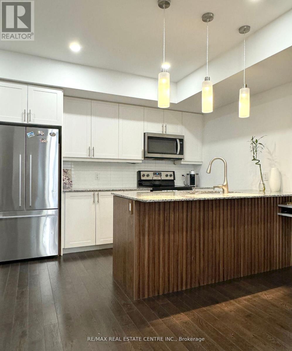 Bright, spacious, and well-maintained 2-bedroom, 2.5-bath stacked townhome in a highly desirable Milton location. Features an open-concept kitchen and living area with 9-ft ceilings, hardwood flooring throughout, upgraded staircase, smooth ceilings, and modern light fixtures. Contemporary kitchen boasts a large centre island with quartz countertop, backsplash, and under-cabinet lighting. Generously sized living area overlooks the front yard and opens to a Juliet balcony with a large front patio-perfect for relaxing or entertaining. Washrooms are finished with granite countertops. Includes two premium underground parking spaces and a personal locker. Conveniently located close to amenities, transit, and with easy access to Highways 401 & 407. (41971610)