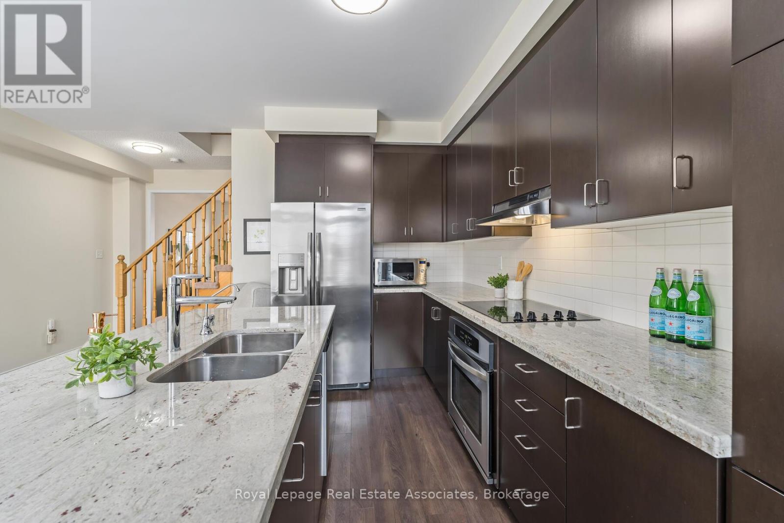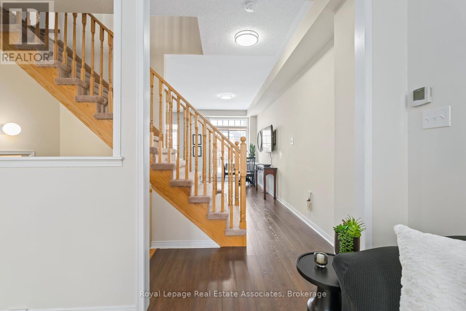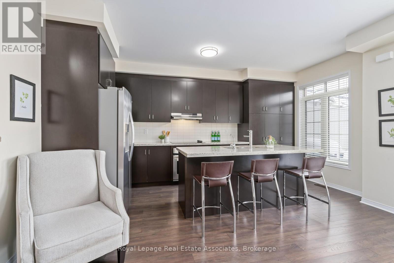 Live in a bright and stylish 3-bedroom, 3-bath, 3-storey townhome in Weaver Mill, one of Georgetown's most desirable and friendly neighbourhoods. The main living area features a combined living and dining room that feels open and inviting, ideal for both everyday living and entertaining. The kitchen is thoughtfully designed with a centre island with seating, granite countertops, ceramic backsplash, double sink, and a dedicated reverse osmosis water faucet, while the sun-filled breakfast room walks out to a spacious balcony, perfect for outdoor dining or summer barbecues. Upstairs, the primary bedroom offers a walk-in closet and a 4-piece ensuite, with two additional well-sized bedrooms and a second 4-piece bathroom. The ground floor adds exceptional functionality with tile flooring, two closets, and a fully dry-walled laundry room featuring a sink, windows, shelving, and abundant storage, along with a convenient direct interior access from the garage. Enjoy low-maintenance, worry-free living with POTL fees that include visitor parking, snow removal, landscaping of common elements, two parkettes, and garbage removal. All of this is just minutes from Downtown Georgetown, with shops, restaurants, cafés, schools, parks, the hospital, library, and GO Train station close by. Extras: New Light Fixtures (2026). Rough-in Central Vacuum. (41972716)