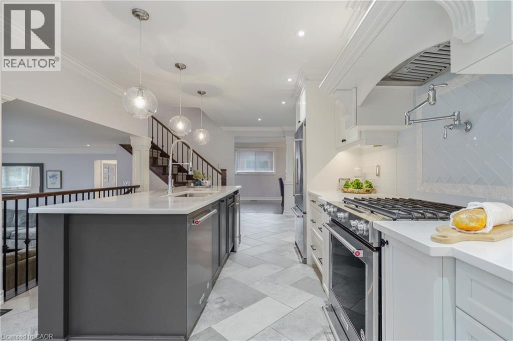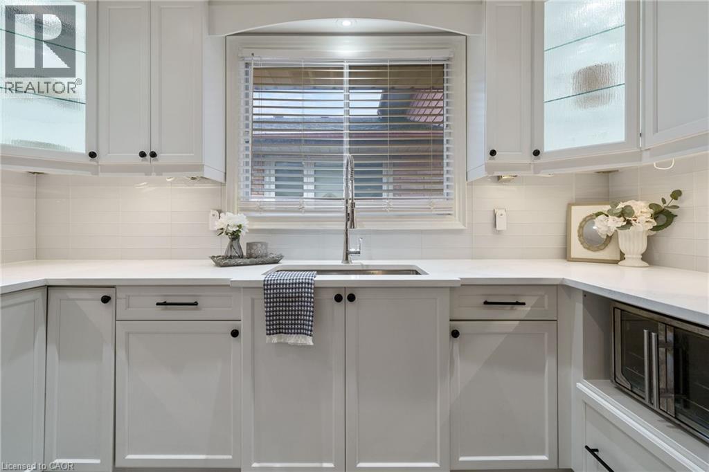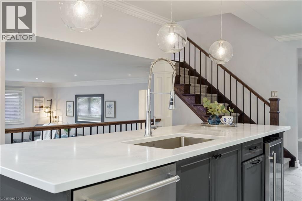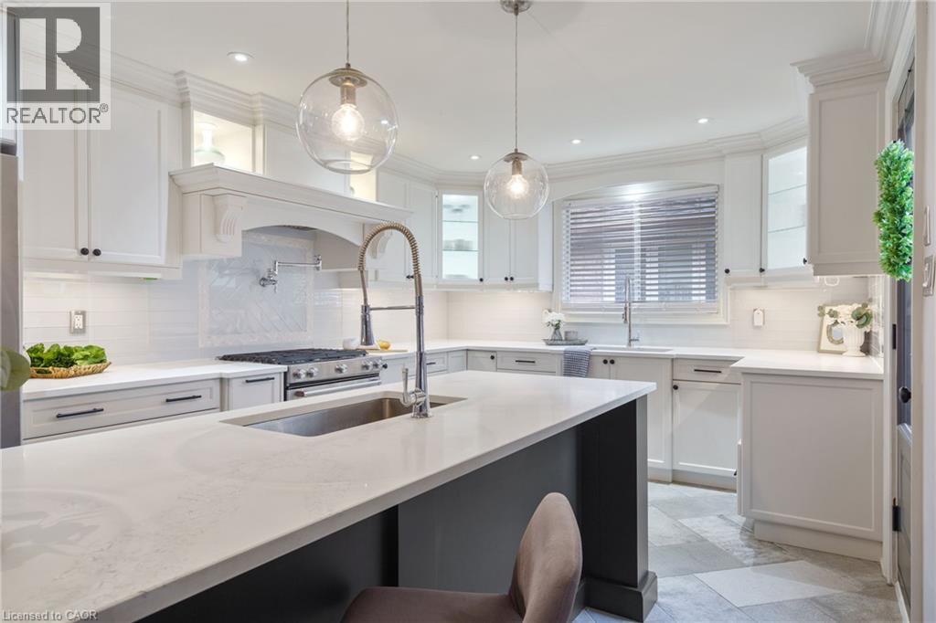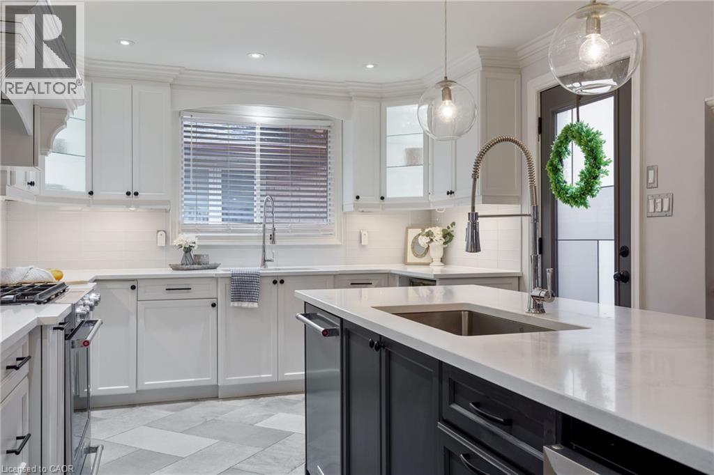 Welcome to this beautifully renovated all-brick 5-level backsplit offering over 2,005+ sq. ft. of finished living space above grade, perfectly situated on a quiet, tree-lined street just steps from Ferris Park. This exceptional home blends timeless craftsmanship with modern upgrades and offers excellent in-law potential, featuring a separate entrance to the basement with a second kitchen already in place. The main level showcases a bright open-concept layout with hardwood maple flooring, crown moulding, and pot lights throughout. The stunning custom maple kitchen is a true showpiece, featuring solid soft-close cabinetry, dual sinks, a 9-ft quartz island, pot filler over the gas stove, under-cabinet lighting, glass backsplash and stainless steel appliances—striking the perfect balance of beauty and function. Just two steps down, the spacious family room welcomes you with a custom-built stone gas fireplace, ideal for gatherings or relaxing nights in. Conveniently located on this level is a 3-piece bath and a versatile rec room or fourth bedroom, perfect for guests, a home office, or playroom. The elegant wrought iron staircase connects all levels seamlessly. Upstairs, you’ll find three generous bedrooms and a beautifully renovated 4-piece bath with custom cabinetry and premium finishes. The fourth and fifth levels are partially finished, ready to unlock approximately 700+ sq. ft. on the fourth level and an additional 600 sq. ft. on the fifth, providing substantial potential to expand living space. Outside, enjoy a fully fenced backyard with an irrigation system, a two-car garage, and a wide private driveway. Recent updates include a new roof, air conditioning, and furnace (2023). Located close to parks, schools, transit, and shopping, with QEW access in under five minutes, this move-in-ready Stoney Creek home perfectly combines modern comfort, space, and style. (70065662)