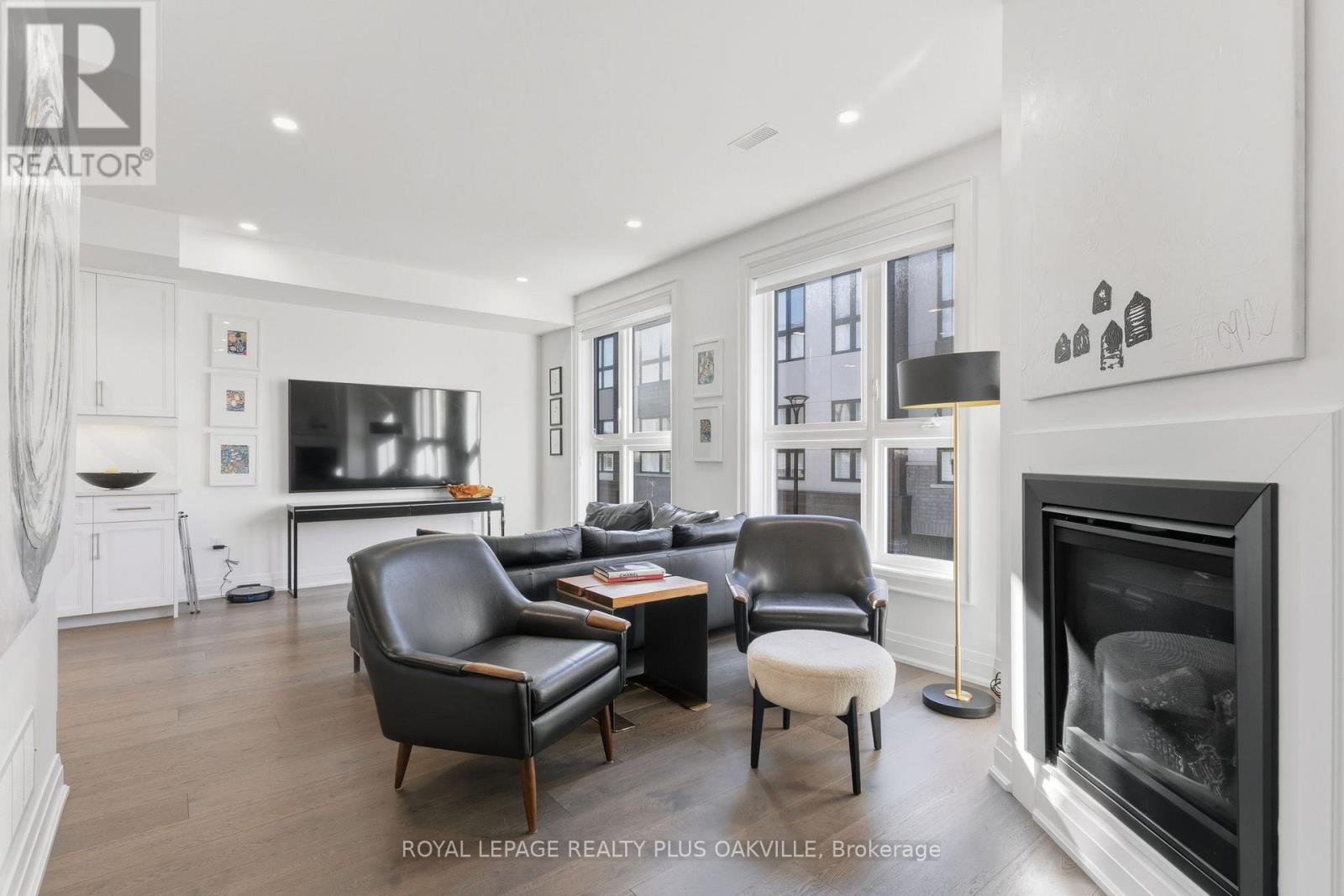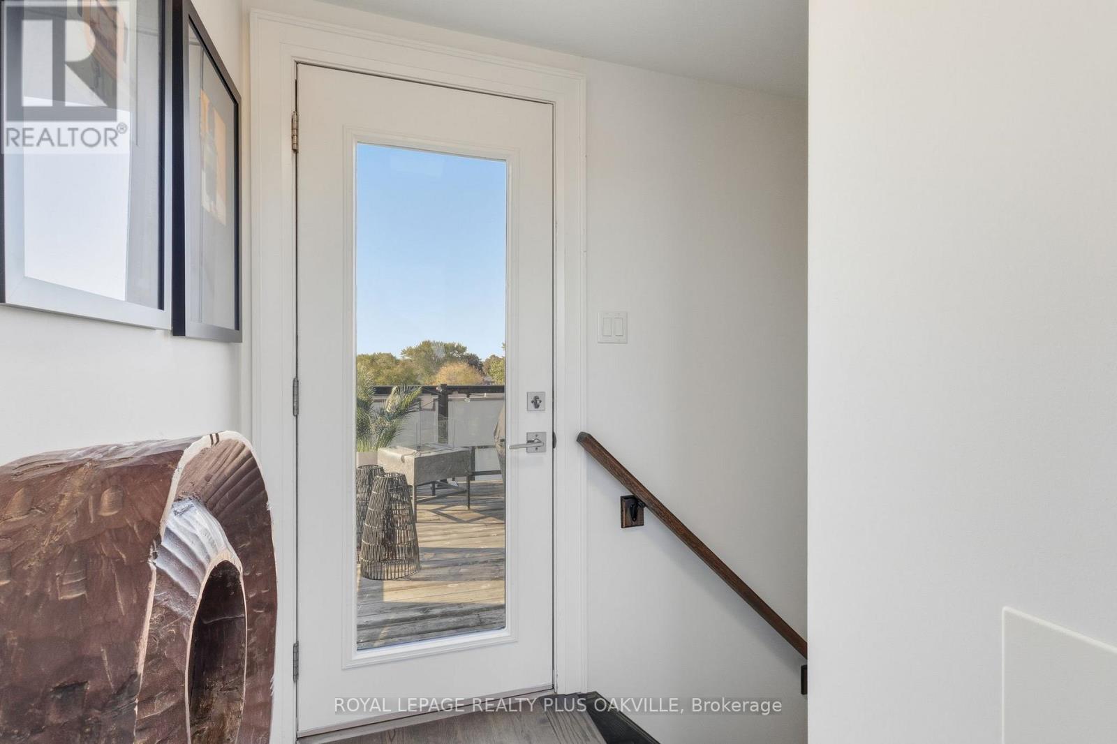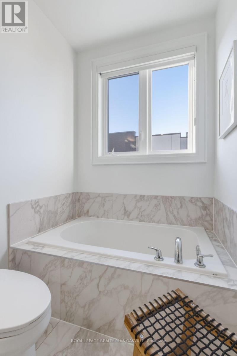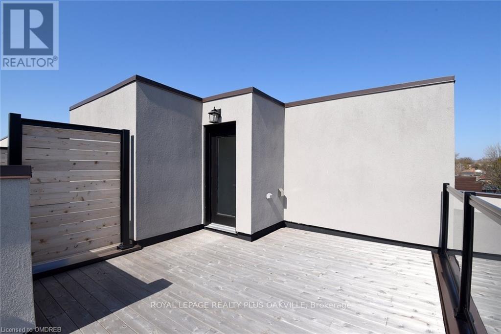 A One-of-a-Kind FREEHOLD Townhome in a Sought-After Community, Exceptional in both design and scale, this beautiful three-bedroom home stands apart as the largest and widest floorplan in this exclusive ten-residence enclave. Every detail has been carefully chosen, creating a bright, refined living space filled with natural light from its extra-large windows. The exterior blends brick, stone, and stucco with a striking 8-foot modern entrance door. Inside, you'll find 9-foot ceilings on every level, 8-foot solid interior wood doors, upgraded trim, and hardwood floors throughout no carpet anywhere. The custom kitchen is the heart of the home, featuring soft-close cabinetry, quartz countertops and backsplash, a waterfall island with undermount sink, KitchenAid appliances including a gas stove, and a built-in beverage fridge. The open-concept living area flows seamlessly and features a gas fireplace and Juliette balcony, creating a space that feels both stylish and inviting. The oak staircase with metal pickets and Hunter Douglas blinds continue the homes attention to detail. Upstairs, the primary suite offers a spa-like retreat with heated floors, a frameless glass shower, and double comfort-height vanities. Additional thoughtful upgrades such as custom closet organizers, LED pot lights, and a full-sized washer and dryer finishes the space beautifully. The appeal extends outdoors with a rare 375-square-foot rooftop terrace finished in cedar and complete with a gas line for barbecuing perfect for relaxing or entertaining under the open sky. Additional conveniences include inside garage entry, a large window in the garage, a covered second parking space, and an owned hot water tank. Located close to Downtown Burlington, shopping, schools, parks, the Burlington Centennial Bike Path, public transportation, major highways and the GO Train. This is a home worth seeing... you will truly be impressed. (41983604)