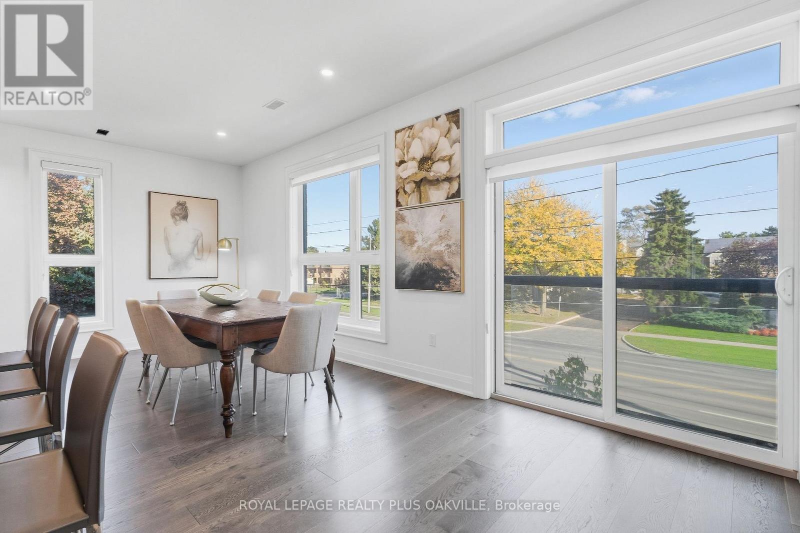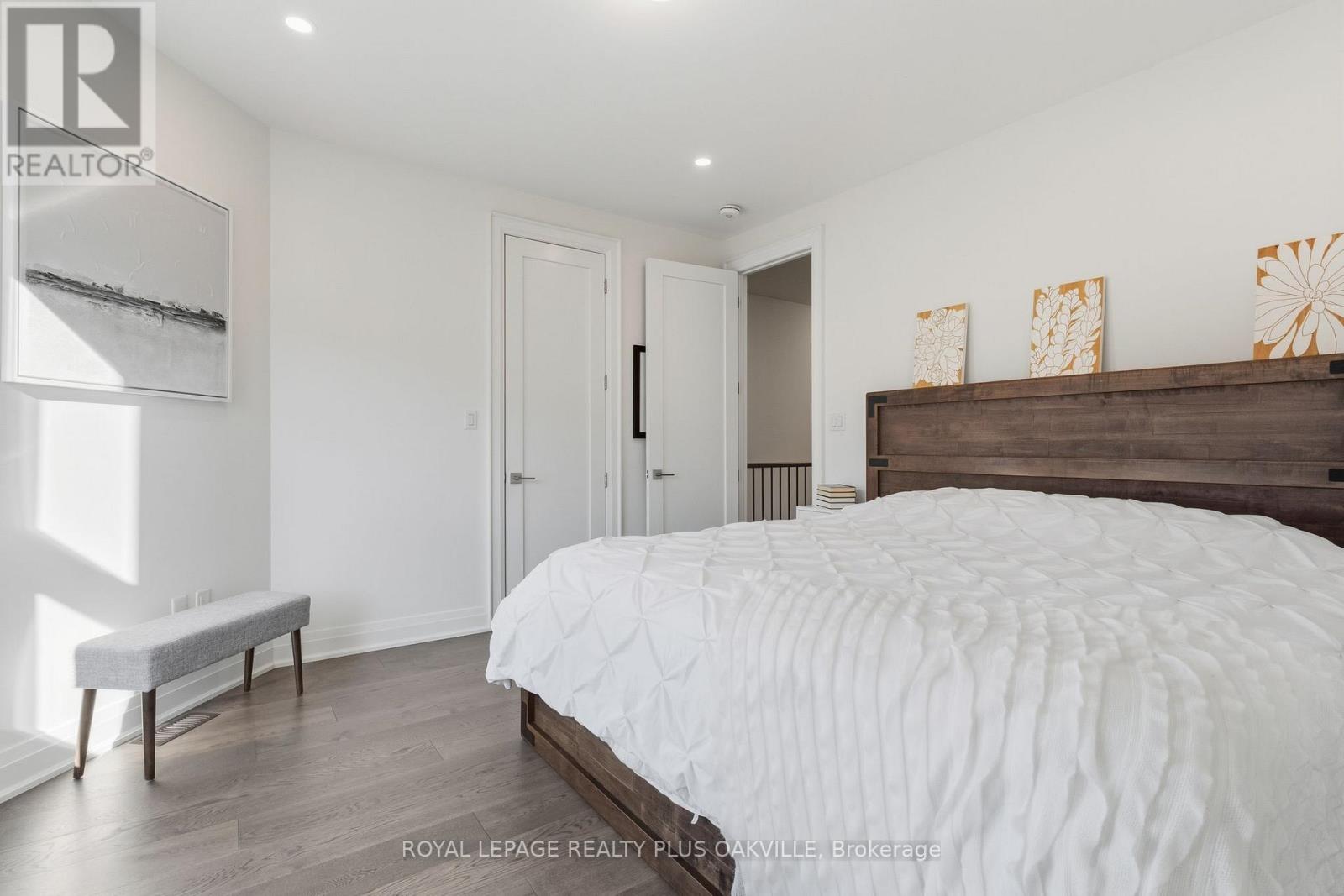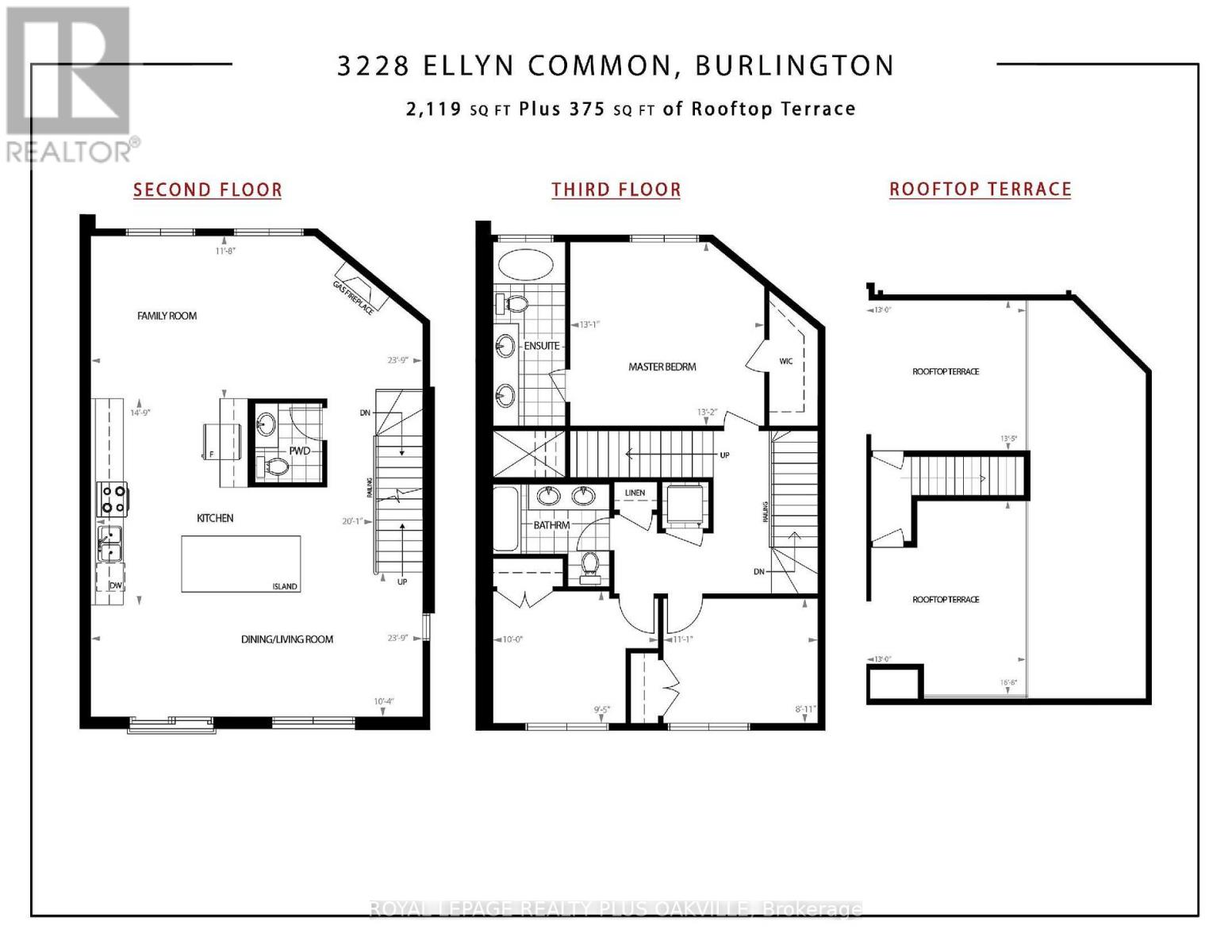 A One-of-a-Kind FREEHOLD Townhome in a Sought-After Community, Exceptional in both design and scale, this beautiful three-bedroom home stands apart as the largest and widest floorplan in this exclusive ten-residence enclave. Every detail has been carefully chosen, creating a bright, refined living space filled with natural light from its extra-large windows. The exterior blends brick, stone, and stucco with a striking 8-foot modern entrance door. Inside, you'll find 9-foot ceilings on every level, 8-foot solid interior wood doors, upgraded trim, and hardwood floors throughout no carpet anywhere. The custom kitchen is the heart of the home, featuring soft-close cabinetry, quartz countertops and backsplash, a waterfall island with undermount sink, KitchenAid appliances including a gas stove, and a built-in beverage fridge. The open-concept living area flows seamlessly and features a gas fireplace and Juliette balcony, creating a space that feels both stylish and inviting. The oak staircase with metal pickets and Hunter Douglas blinds continue the homes attention to detail. Upstairs, the primary suite offers a spa-like retreat with heated floors, a frameless glass shower, and double comfort-height vanities. Additional thoughtful upgrades such as custom closet organizers, LED pot lights, and a full-sized washer and dryer finishes the space beautifully. The appeal extends outdoors with a rare 375-square-foot rooftop terrace finished in cedar and complete with a gas line for barbecuing perfect for relaxing or entertaining under the open sky. Additional conveniences include inside garage entry, a large window in the garage, a covered second parking space, and an owned hot water tank. Located close to Downtown Burlington, shopping, schools, parks, the Burlington Centennial Bike Path, public transportation, major highways and the GO Train. This is a home worth seeing... you will truly be impressed. (41983604)