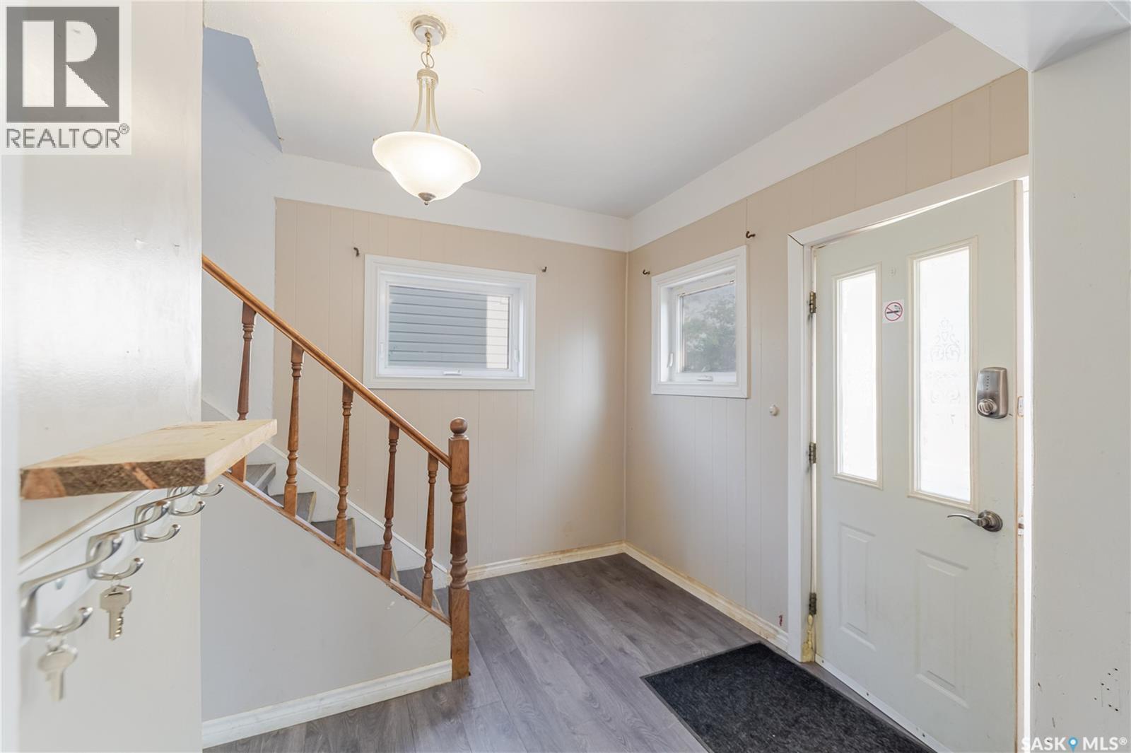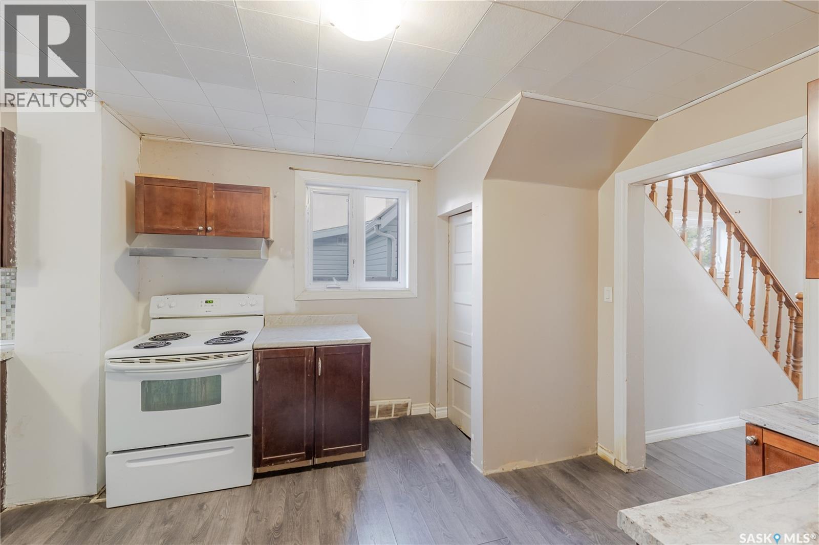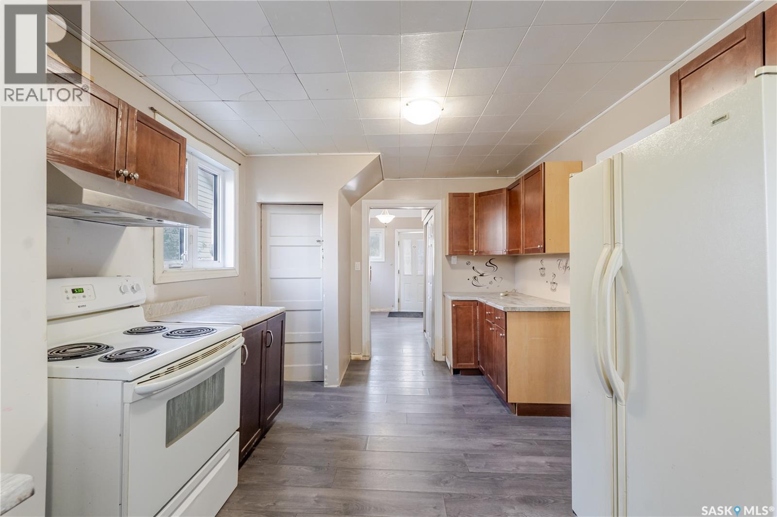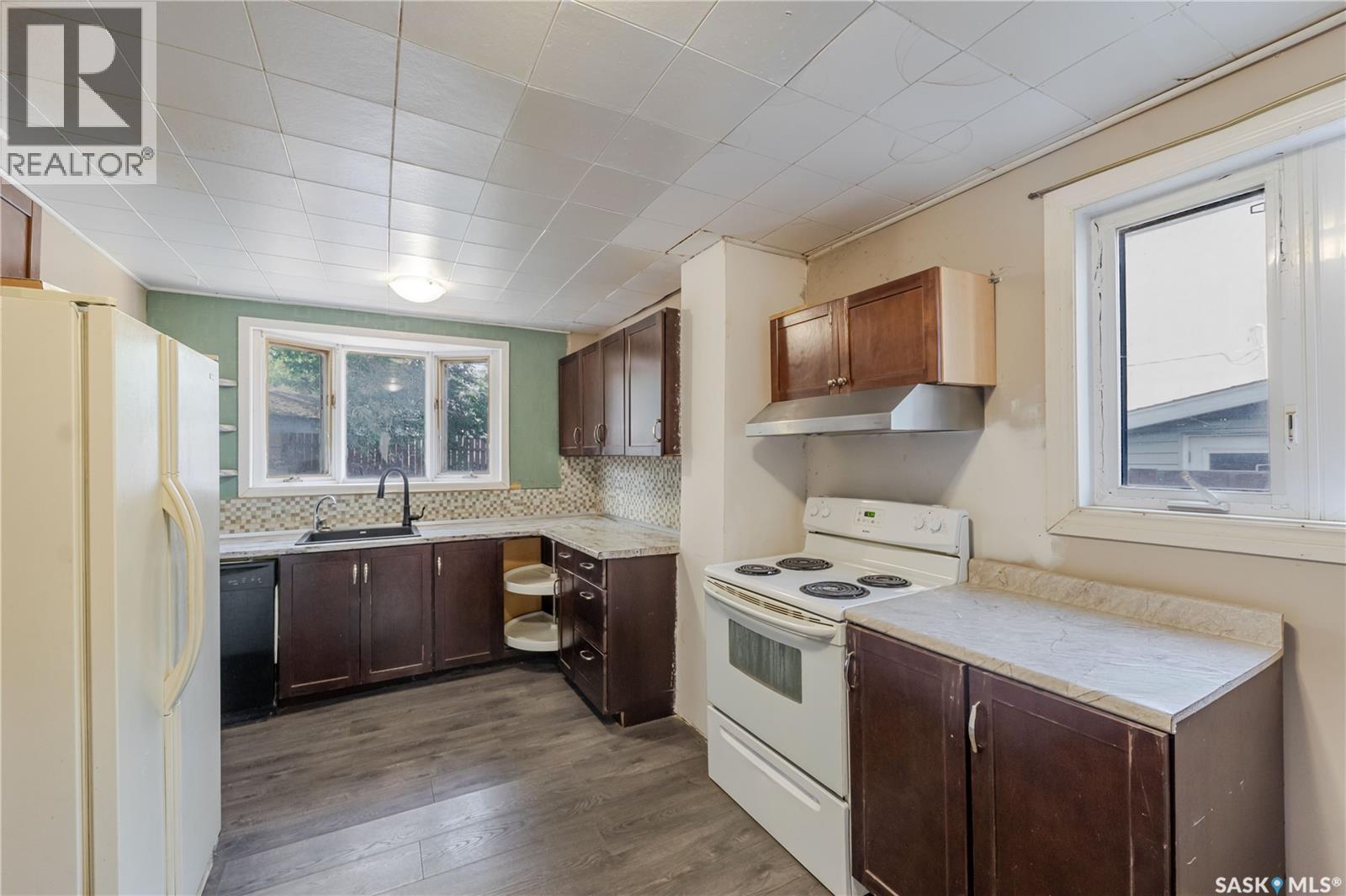 Welcome to this inviting two and a half storey home that blends character, comfort, and affordability. A welcoming front deck with a unique second tier perfect for relaxing, entertaining, or even creating a potted garden sets the tone. Inside, the spacious foyer includes a built-in closet and 9-foot ceilings, creating an open and airy first impression. The open concept living and dining rooms feature laminate flooring and plenty of room for family gatherings or hosting friends. The updated kitchen boasts maple cabinetry, ample counter space, a built-in dishwasher, fridge, stove, and a coffee bar area. From here, a mudroom leads to the patio and fully fenced yard. Upstairs, you will find three generously sized bedrooms and a refreshed four-piece bathroom with extra storage. The top floor loft offers incredible versatility with enough space for a kids’ play area, a home office, or a cozy reading nook while enjoying beautiful views. The basement, though unfinished, provides laundry facilities and abundant storage. Recent updates include shingles, some PVC style windows, kitchen and bath upgrades, a high efficiency furnace, water heater, and central air for those warm Saskatchewan summers. Outside, there is a deck and patio area with some mature trees, all inside a fully fenced yard. While the backyard needs some care, this home is still a great choice for first time buyers, growing families, or investors looking for space and potential at an affordable price. (29298297)