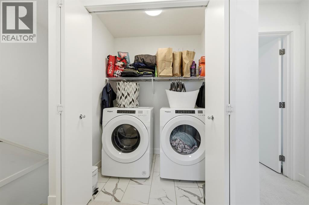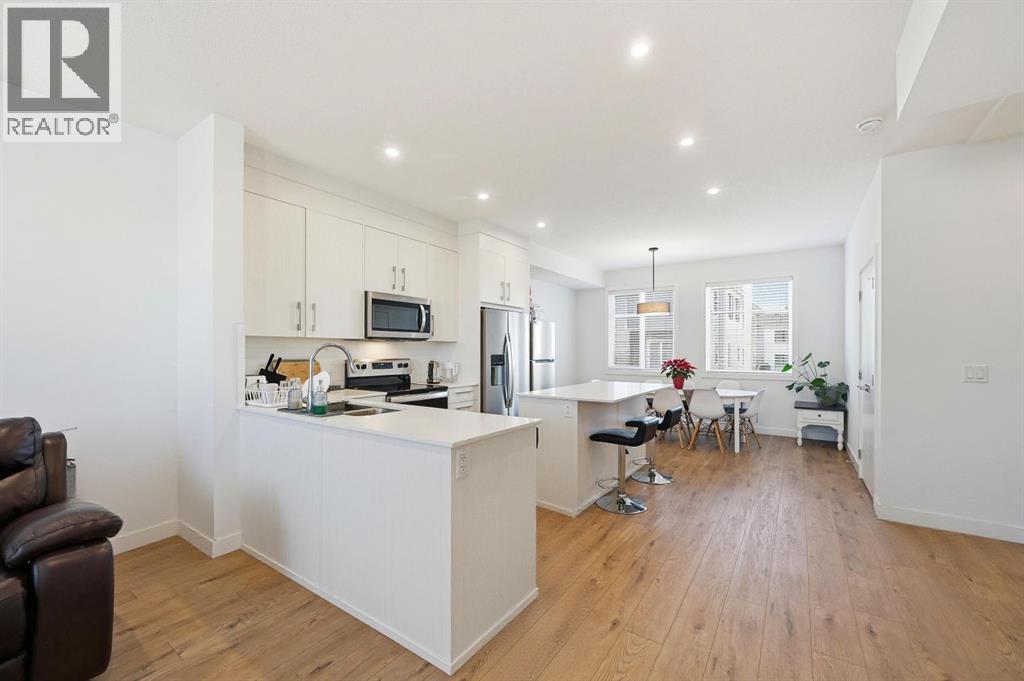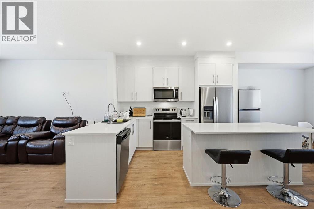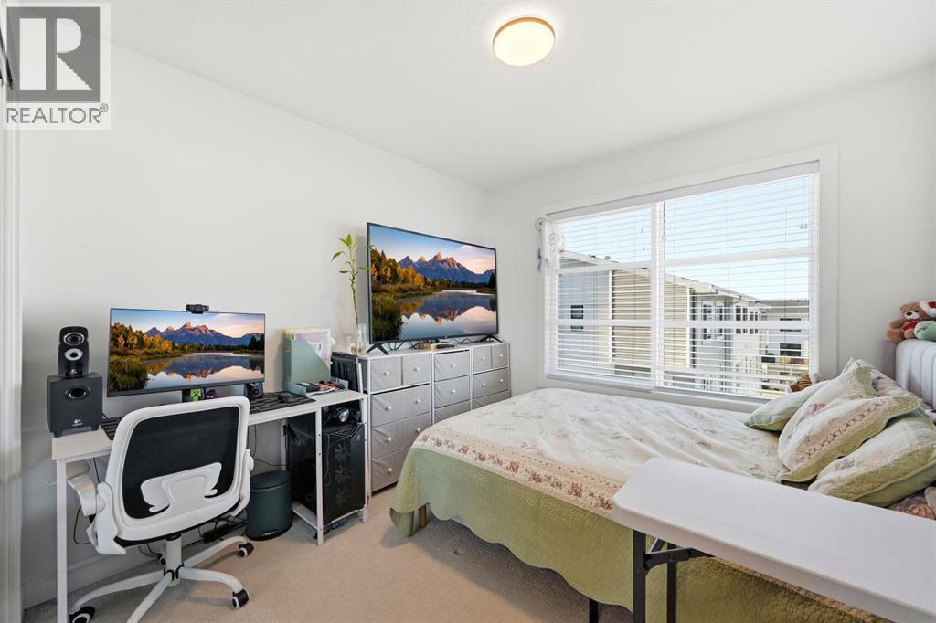 Beautifully upgraded townhome located in the family-friendly community of Carrington NW. Enjoy the convenience of nearby shops, walking paths, and easy access to downtown and the mountains. This modern 4-bedroom, 2.5-bath home offers 1,639 sq ft of thoughtfully designed living space. The main-floor bedroom is extremely versatile and works perfectly as a home office, gym, or guest room. The attached double garage provides secure parking and seasonal storage. The bright, open-concept second level is perfect for both daily living and entertaining. Large windows bring in plenty of natural light, while the upgraded kitchen features quartz countertops, stainless steel appliances, and ample storage. The living area opens onto a private balcony, great for morning coffee or relaxing in the evening. Upstairs offers three well-sized bedrooms, including a spacious primary suite with a walk-in closet and private 4-piece ensuite. Two additional bedrooms, a full bathroom, and upper-floor laundry add everyday convenience.The complex is well managed and features a landscaped courtyard with ample visitor and street parking. With growing amenities, future schools, and a planned LRT nearby, this is a fantastic option for families, professionals, or investors looking for a low-maintenance home in a growing community. Homes like this don’t last long in Carrington, book your private showing today and secure this one before it’s gone. (31551939)