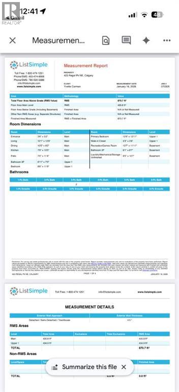 :..Welcome::.. 423 regal Park NE! This stunning townhome in the community of Renfrew has been fully renovated and you will not be disappointed once you walk through the front door. From the elegant vinyl plank flooring that leads you into the main living space to the beautiful kitchen that hosts stainless steel appliances, modern cabinets, quartz counter tops, and under mount cabinet lighting, this is a unique finish within this complex and you will not find another unit like this. The upper level has 2 bedrooms, the primary suite is massive featuring a large wardrobe and a walk-in closet. The 2nd bedroom is spacious and bright, with dimmable LED lighting in both rooms. The bathroom is ultra modern with fine finishings, a beautiful custom tile walk-in shower, and features black accents. The basement is fully developed with an additional 3 piece bathroom, which is exceptional for this type of property in this complex. The rubber flooring is perfect for a home gym or a recreation area! The neighbours are amazing and the property is close to local shopping, transit, schools, and everything that you would need. You will love living in this community, call your favourite realtor today to view this fantastic opportunity! (31551471)