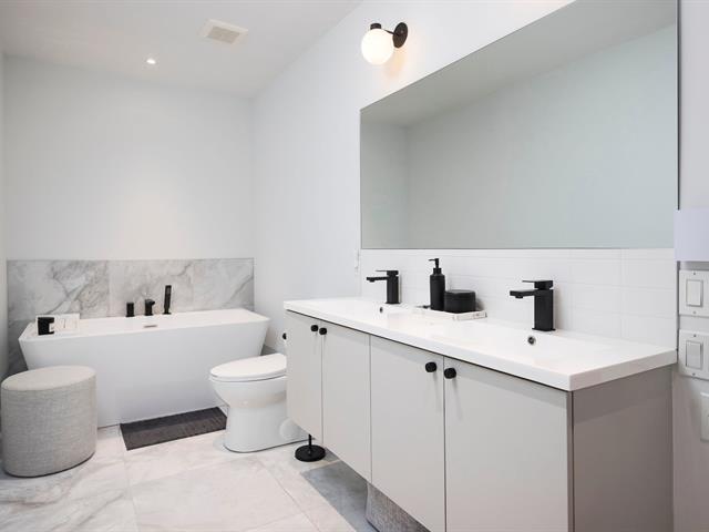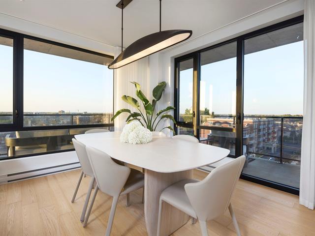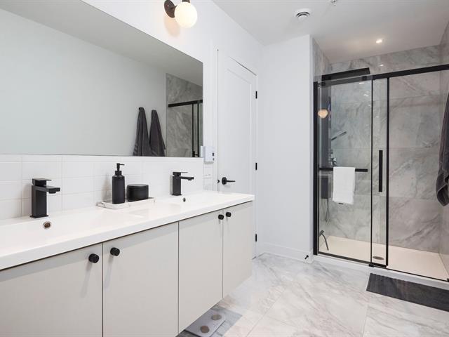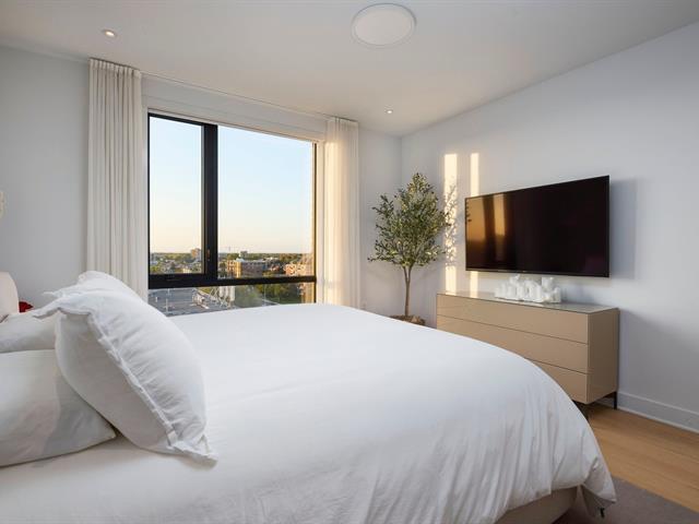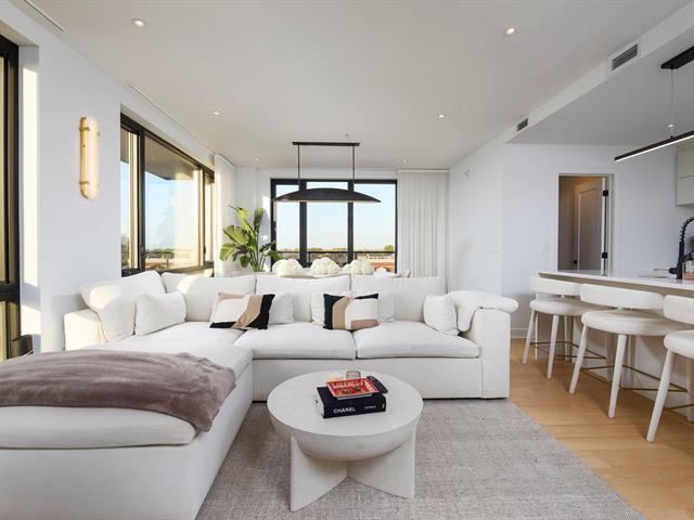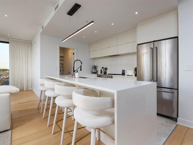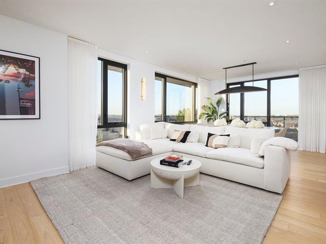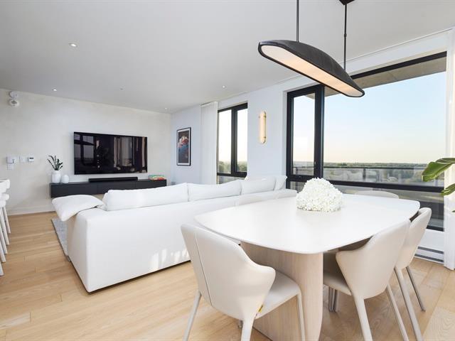 Welcome to 4420 Boul. St-Jean #614 at the Baldwin Condos. This exceptional 2 bedroom, 2 bathroom corner unit on the 6th floor offers breathtaking views, stunning sunsets, and abundant natural light through floor-to-ceiling windows and a wrap-around balcony. The open-concept living space features hardwood floors and a modern kitchen with quartz waterfall countertops, white cabinetry, a large island, and walk-in pantry. The primary bedroom includes a custom walk-in closet and ensuite with separate shower and bathtub. Two indoor parking spaces and a large storage locker included.Enjoy amenities: swim spa, indoor & outdoor gym, rooftop terrace. (43540489)