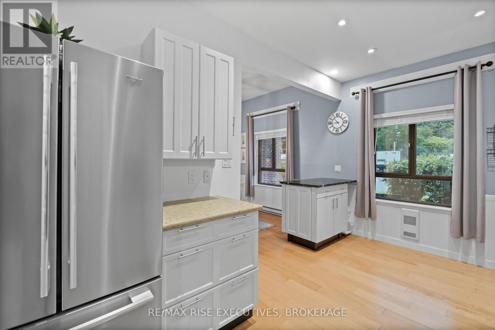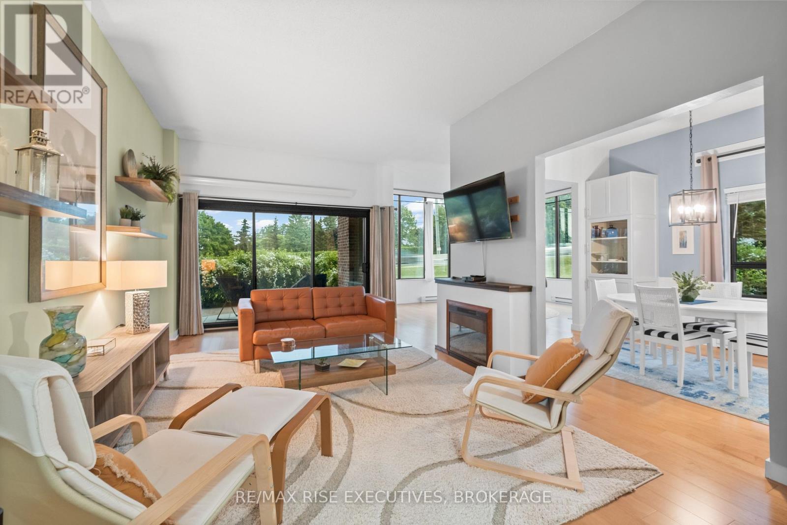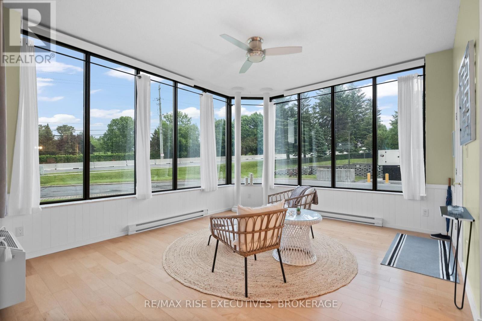 Stunning Condo with Lake & Golf Course Views in Prime Kingston Location. Welcome to one of Kingston's most breathtaking condos, offering panoramic views of Lake Ontario, nearby parks, the Rideau Trail, and the Cataraqui Private Golf Club. This beautifully updated ground-floor unit features 10 ceilings, engineered hardwood throughout, and two private patios perfect for pet owners (25 lb max) or outdoor enthusiasts, with convenient side-door access. The spacious foyer leads into a modern kitchen with granite countertops, under-cabinet lighting, and stainless steel appliances (all new in 2020), including a stackable washer and dryer. The open-concept dining area with built-in cabinetry flows into the Atrium which is all windows overlooking the golf course. A bright and inviting family room features large patio doors and a built-in electric fireplace. The generous primary bedroom includes a custom built-in unit, walk-through closet, and a renovated 3-piece ensuite (2021) with a walk-in shower and heated tile flooring. A second spacious bedroom and updated 4-piece main bathroom also with heated floors complete the layout. Additional features include an in-unit storage room, two new air exchangers (2020), high-efficiency baseboard heating, one underground parking space, and a storage locker. Enjoy resort-style amenities: indoor pool, jacuzzi, sauna, gym, games room, and a penthouse library, guest suite, underground parking, car wash, solarium and more! A rare opportunity for luxurious, low-maintenance living in a premium Kingston location! (41990187)