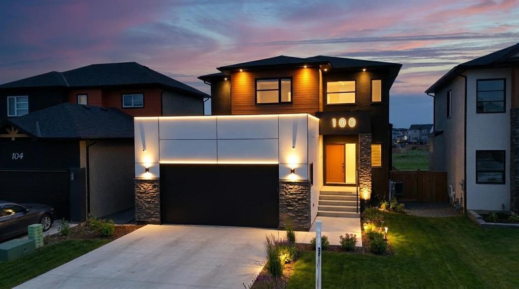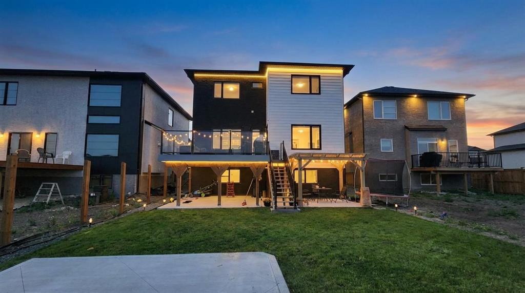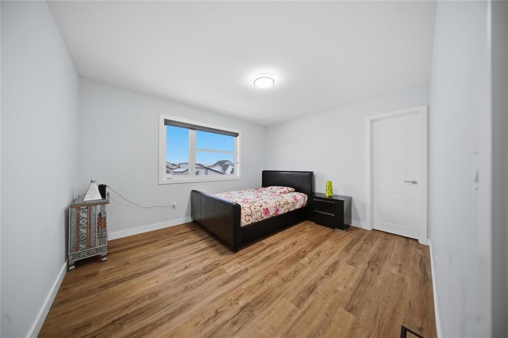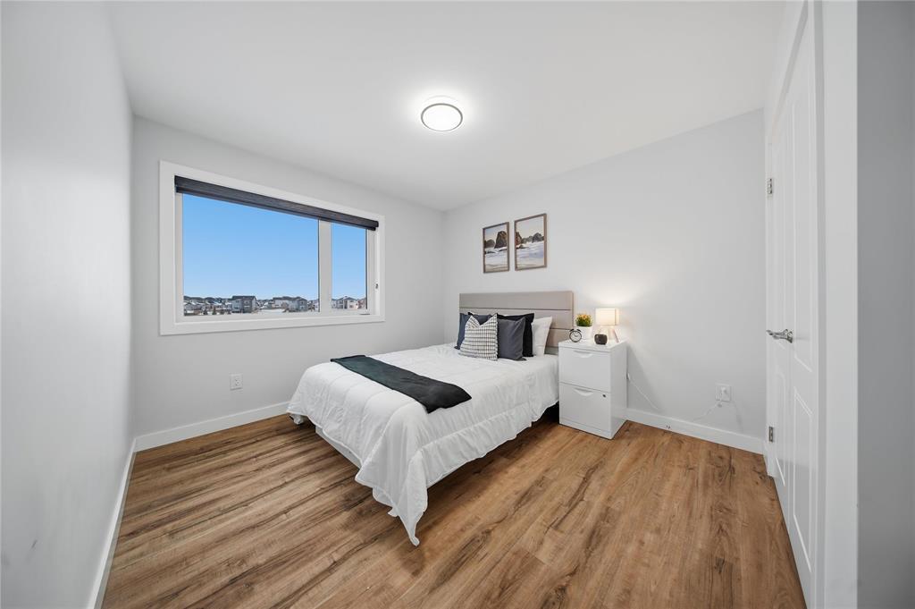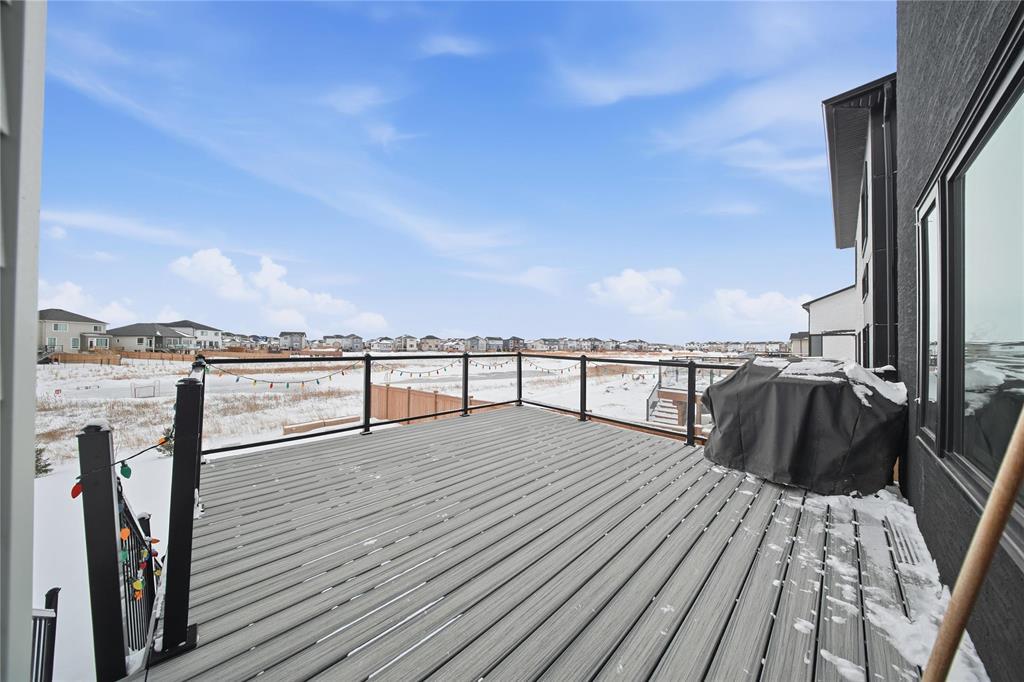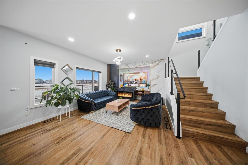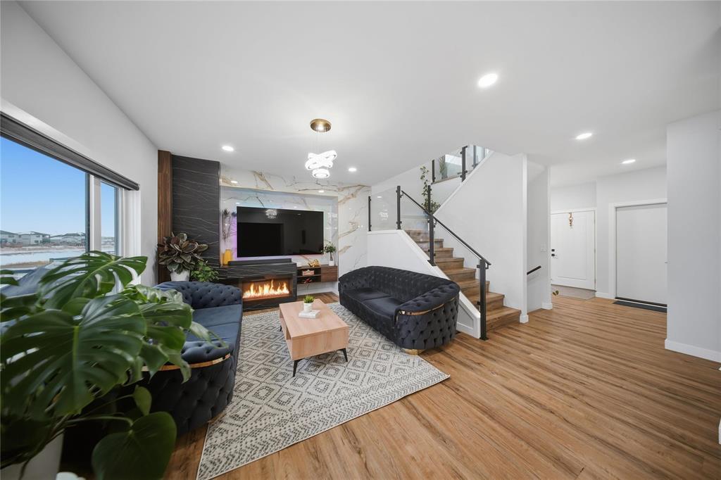 3M//Winnipeg/Showings Start Now. Offers to be presented as Received. Open house 7th February & 8th February 2PM-4PM. Welcome to Exquisitely designed 2,088 sq. ft. luxury residence featuring 4 bedrooms and 3 full bathrooms, including a rare main-floor bedroom with full bathroom ideal for refined multi-generational living. This elegant home showcases premium luxury vinyl plank flooring, black windows, Modern lightning, sleek glass railings, and a statement tiled fireplace. The chef-inspired kitchen offers high-end finishes with quartz countertops throughout, built-in oven and microwave, and modern cabinetry. Upstairs, a spacious loft ideal for a second living area or home office. The primary suite impresses with a spa-like standing tile and glass shower and Upstairs you will find two more Spacious bedrooms and full washroom. Enjoy upscale outdoor living with a composite deck overlooking a desirable lookout lot with beautiful lake views, plus a concrete under the deck, patio and concrete backyard pad for added functionality. Set within a vibrant, well-connected community close to everyday amenities, this home offers the perfect balance of luxury, comfort, and lifestyle A must see. All measurements are +/- (231875636)