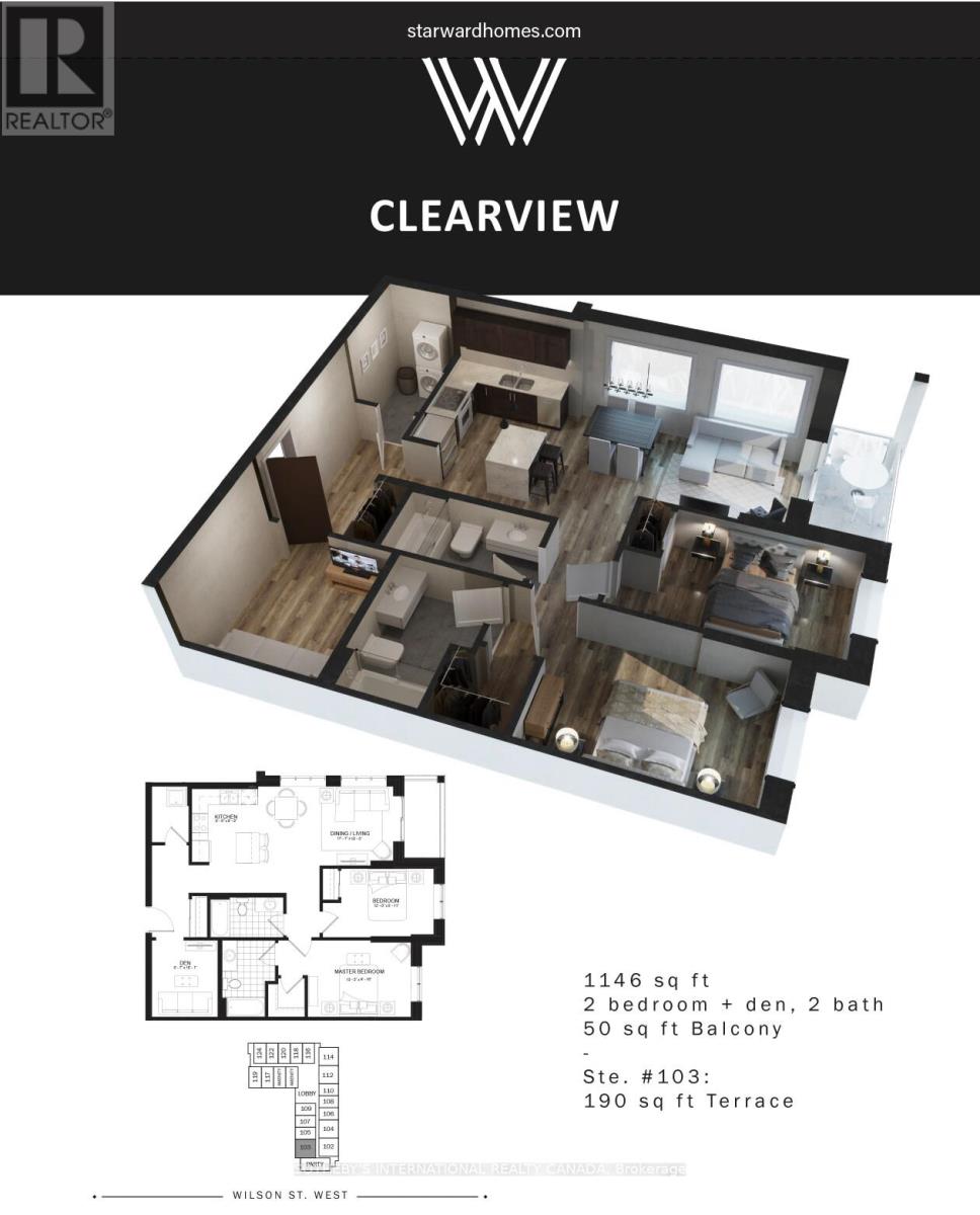 Welcome to this beautifully finished condo, offering 2 beds + Den, 2 baths and 1,146 sq. ft. of thoughtfully designedliving space. Located on the main level, this unit features both a private balcony and an impressive oversized terrace -ideal for relaxing or entertaining. The open-concept layout is enhanced by high-end finishes throughout, including a fullLED pot-light package and over $51,000 in Luxury Upgrades. The versatile den works perfectly as a home office oradditional living space. Residents enjoy access to premium building amenities such as rooftop terraces, a fullyequipped fitness centre, and a stylish party room, along with the added convenience of underground parking and astorage locker. Set within a highly desirable Ancaster community, this condo offers a seamless blend of comfort, style,and functionality. (41991008)