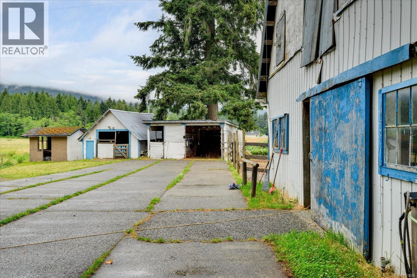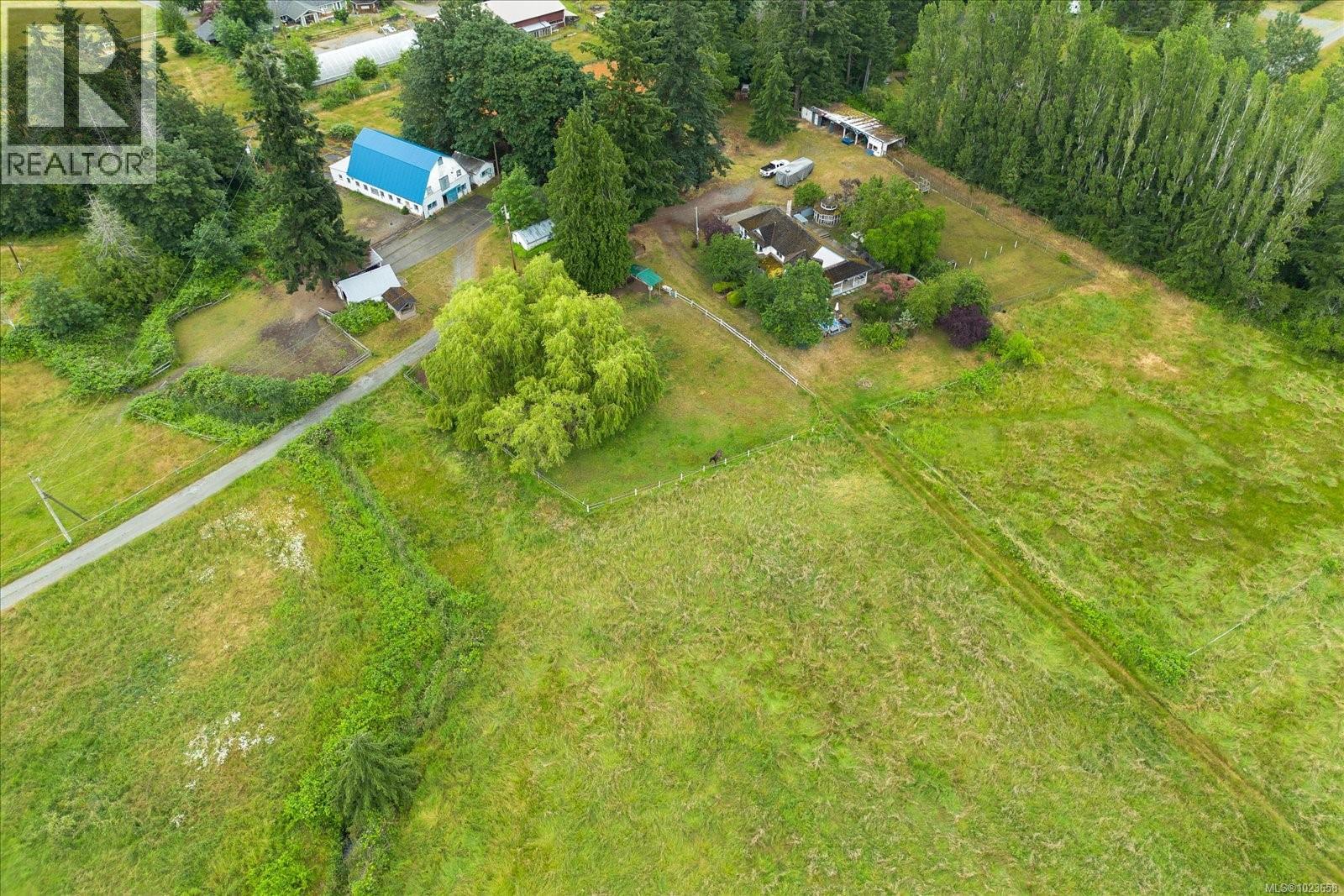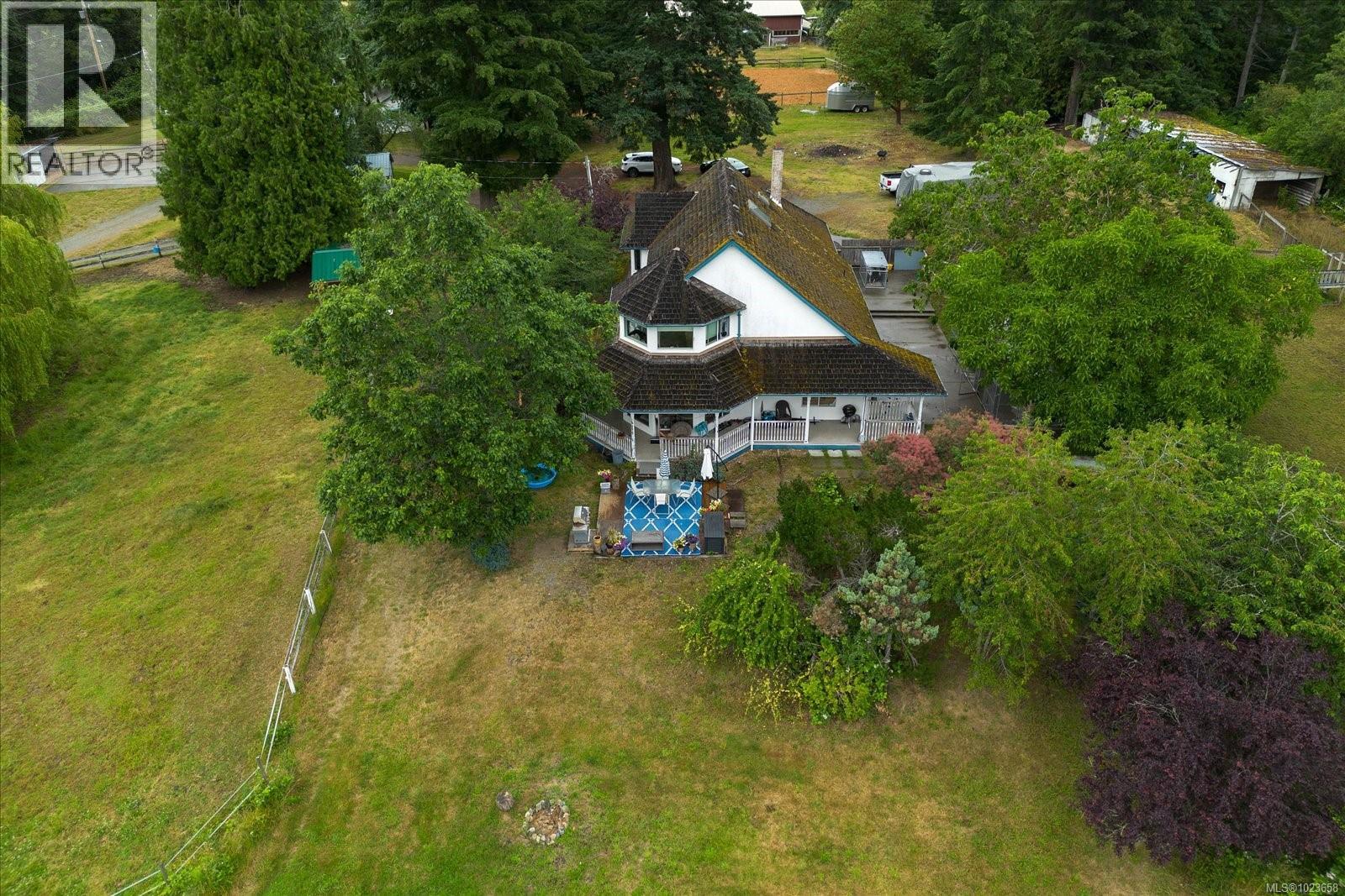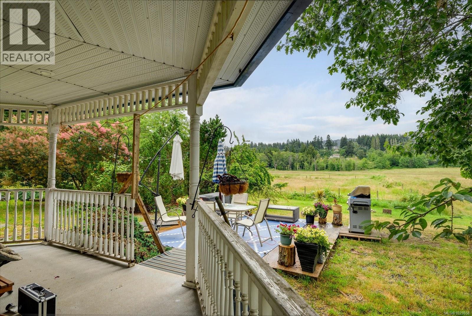 Idyllic 34 acre property in the desirable Jingle Pot area of Nanaimo! At the end of the winding driveway, across cleared fields and a small stream is a 3 bed plus den, 2 bath farmhouse with a wrap around porch, large barn, paddocks, implement shed, outbuilding and riding ring. The homestead is surrounded by mature trees providing both privacy and shade. Every room in the house has beautiful views, especially the picture windows in living room and primary bedroom that look out across the fields over to Mount Benson – the sunset is spectacular! As ALR land there are plenty of options for self sustainable living with hayfields and gardens, plus the barn and outbuildings serve a variety of businesses and hobbies. Come enjoy quiet and solitude just minutes from town. (30301205)