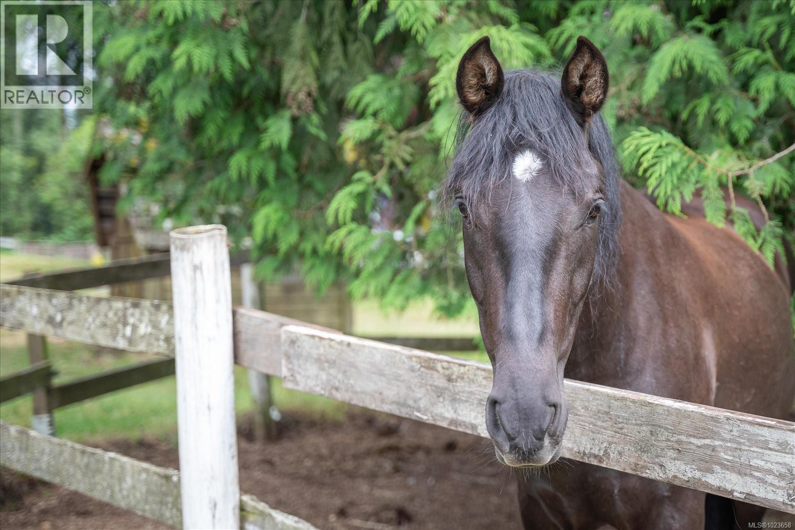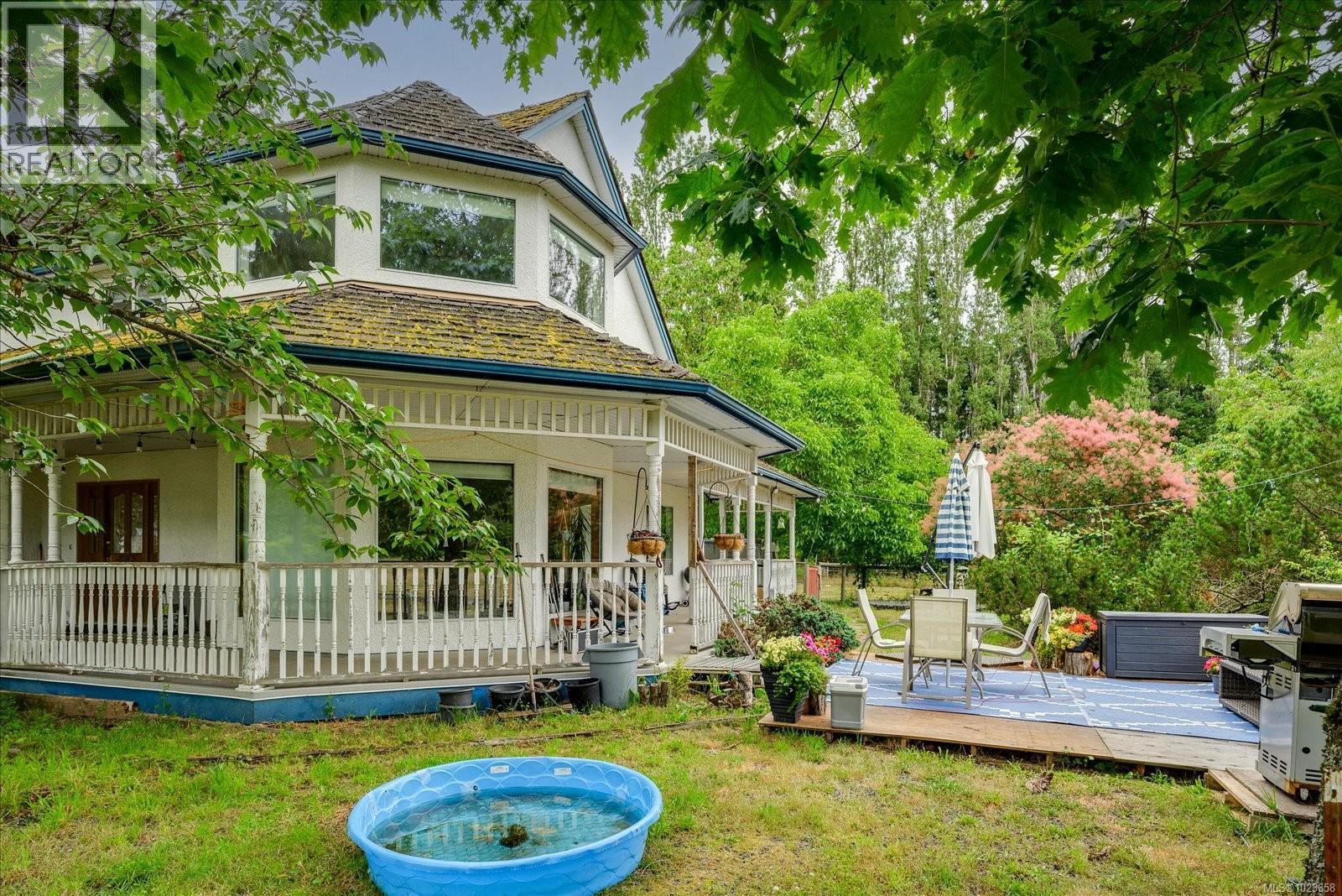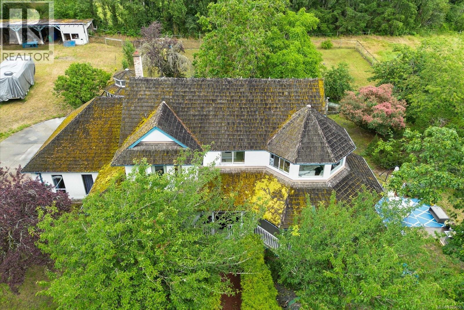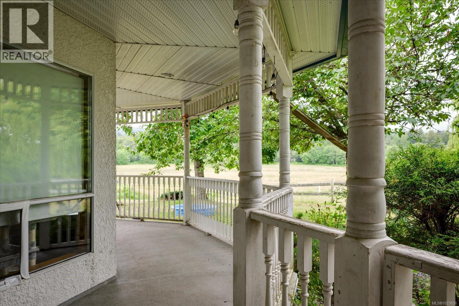 Idyllic 34 acre property in the desirable Jingle Pot area of Nanaimo! At the end of the winding driveway, across cleared fields and a small stream is a 3 bed plus den, 2 bath farmhouse with a wrap around porch, large barn, paddocks, implement shed, outbuilding and riding ring. The homestead is surrounded by mature trees providing both privacy and shade. Every room in the house has beautiful views, especially the picture windows in living room and primary bedroom that look out across the fields over to Mount Benson – the sunset is spectacular! As ALR land there are plenty of options for self sustainable living with hayfields and gardens, plus the barn and outbuildings serve a variety of businesses and hobbies. Come enjoy quiet and solitude just minutes from town. (30301205)