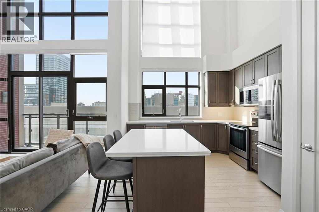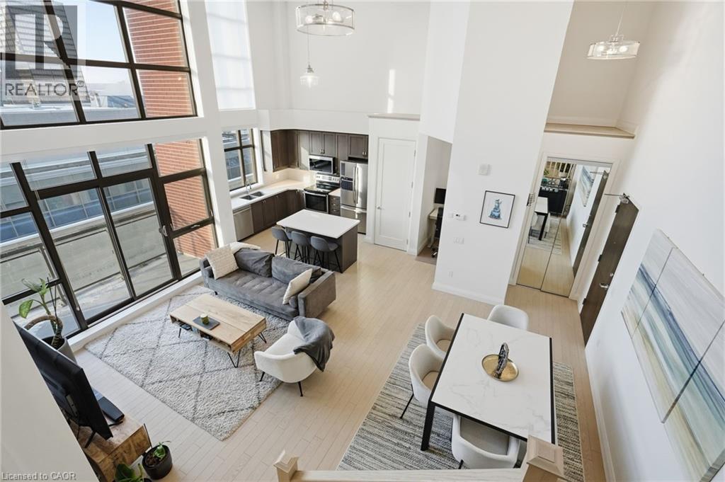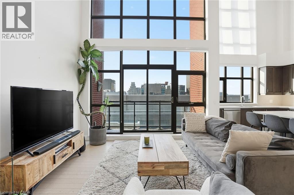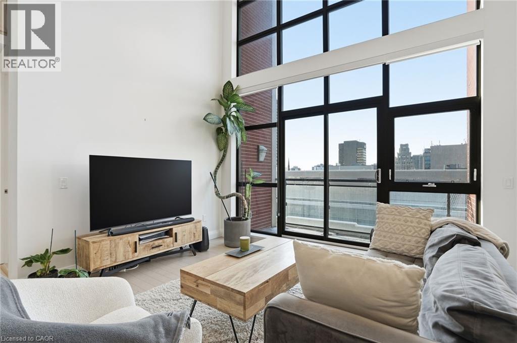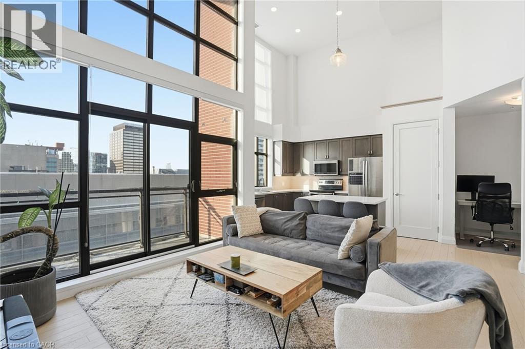 Step into elevated city living in this rare two-storey 2-bedroom, 2-bathroom, plus den lower penthouse at the iconic Residences of Royal Connaught. This 1,267 sq ft west-facing suite features dramatic 18-foot ceilings, expansive floor-to-ceiling windows, and breathtaking, unobstructed views of the Escarpment, Gore Park, and Hamilton Harbour. The main level offers a bright open-concept living space with a den, laundry, and a spacious primary bedroom complete with walk-in closet and ensuite privileges, delivering true one-floor convenience. Upstairs, the second bedroom boasts its own 4-piece ensuite, ideal for guests or family. Thoughtful upgrades include quartz countertops, under-cabinet lighting, engineered hardwood floors, and custom motorized blinds. Enjoy your private balcony, ample storage throughout, and access to premium amenities including a rooftop terrace with fireplace and BBQs, party and media rooms, and a fully equipped gym. Starbucks is conveniently located between the two lobbies, just an elevator ride away. Unbeatable location steps to the GO Station, James Street North, King William Street, the Art Gallery of Hamilton, the Farmers’ Market, and more. Includes underground parking and a storage locker located right next to the unit. Luxe, location, and lifestyle all in one. (70079369)