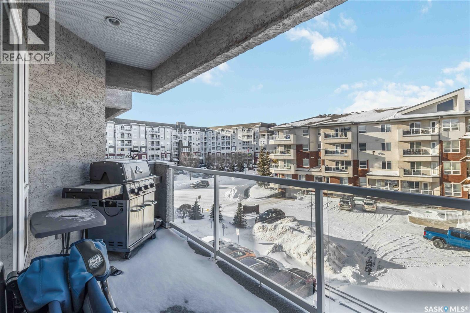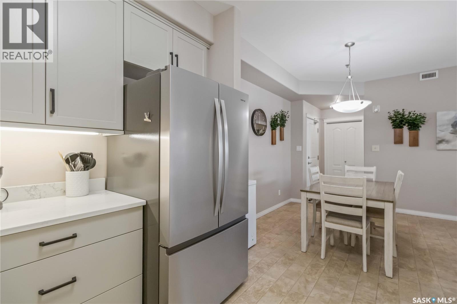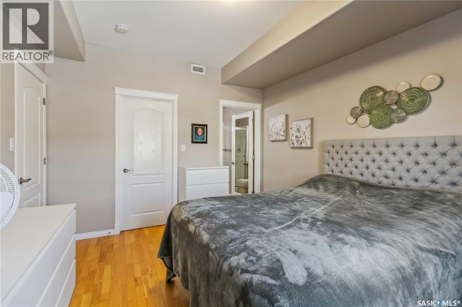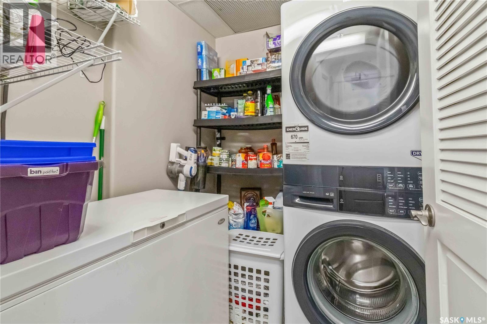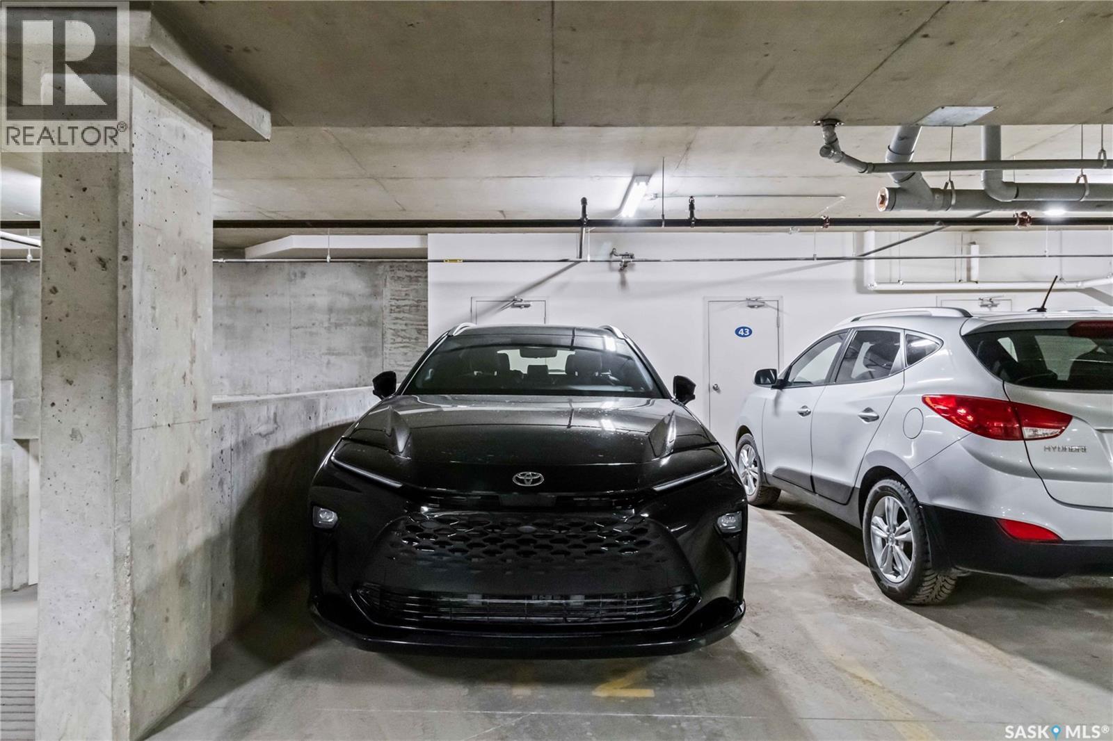 Welcome home to this bright and spacious two bedroom, two bathroom third level condo, located in a quiet building with elevator access and underground parking for accessibility and convenience. This well designed unit has expansive windows that fill the space with natural light throughout the day. The fully renovated kitchen is a true highlight, professionally completed by Superior Cabinets featuring full extension soft close drawers, quartz countertops, and upgraded appliances, including in suite washer and dryer. The central air conditioning unit was replaced for additional comfort and peace of mind. The primary bedroom offers an excellent retreat with a generous walk in closet and a three piece ensuite. Engineered hardwood flooring flows through the living room and bedrooms, adding warmth and style to the space. Step outside onto the west facing balcony to enjoy open views and the convenience of a natural gas BBQ line, perfect for entertaining or relaxing evenings at home. This well kept unit and building offer a high quality living experience, complete with one heated underground parking stall and your own private storage room. Ideally located close to Market Mall, schools, and a wide range of amenities, this is an unbeatable location. Do not miss your opportunity to own this bright, upgraded, move in ready condo. (29307338)