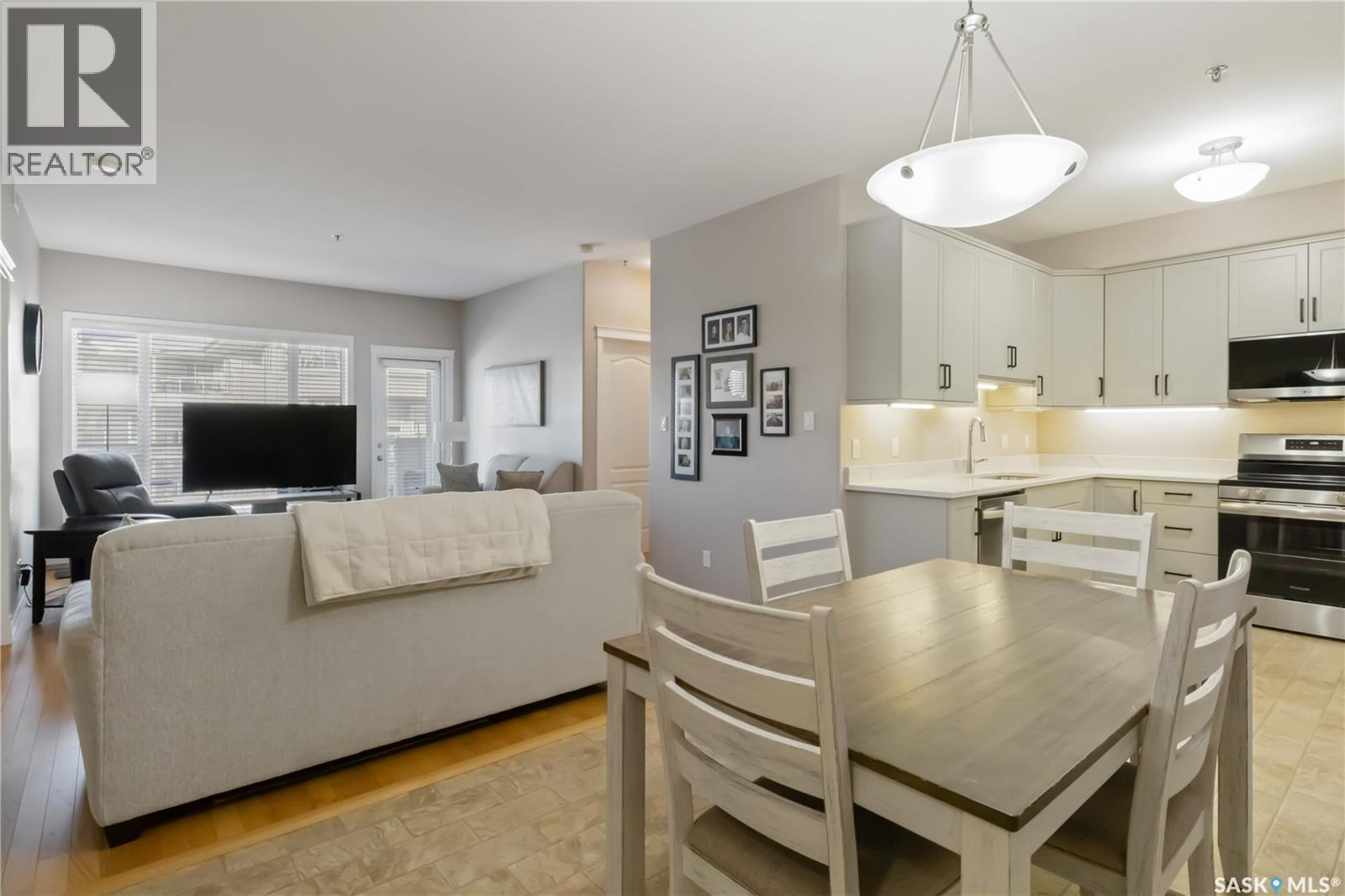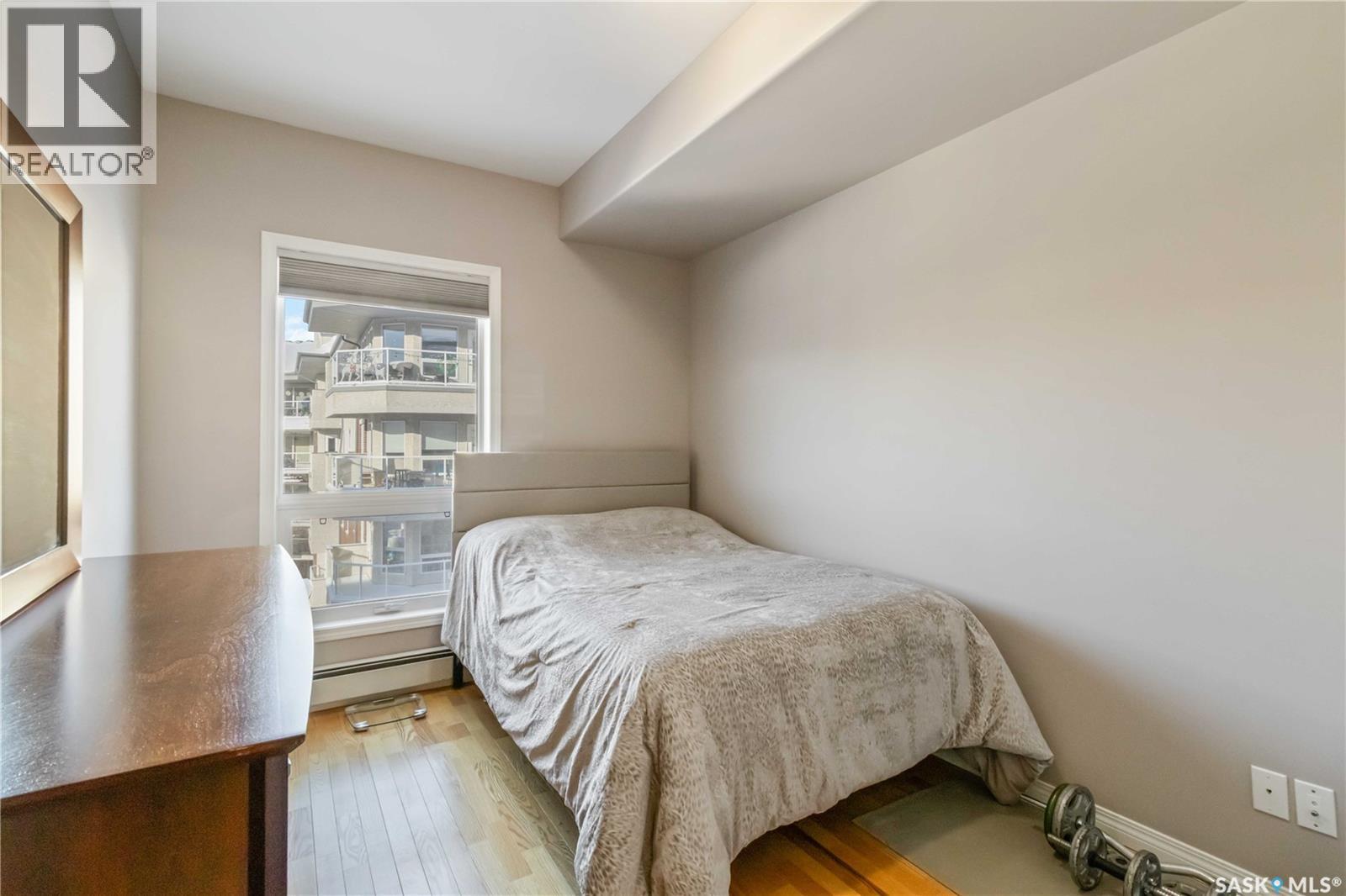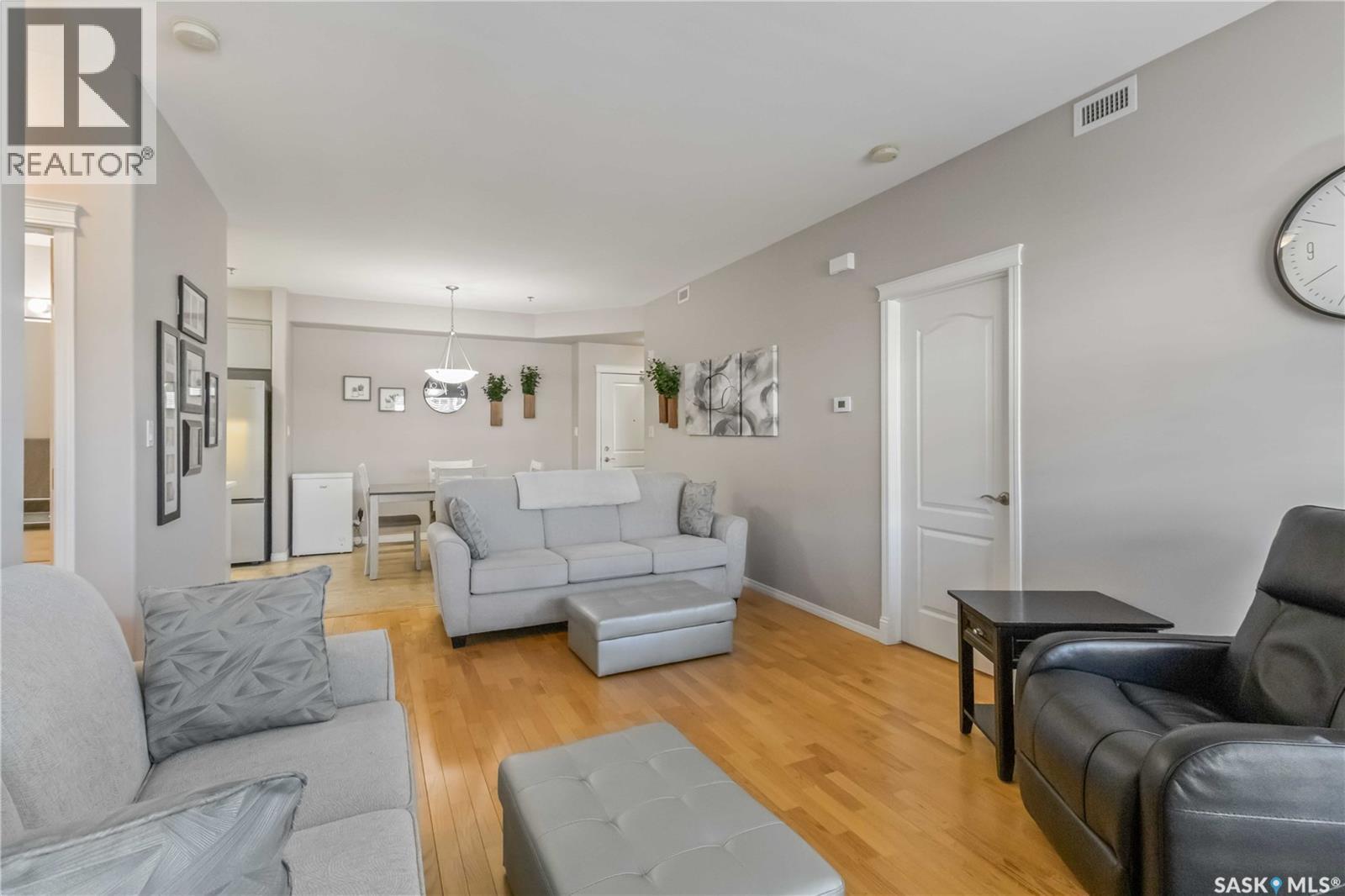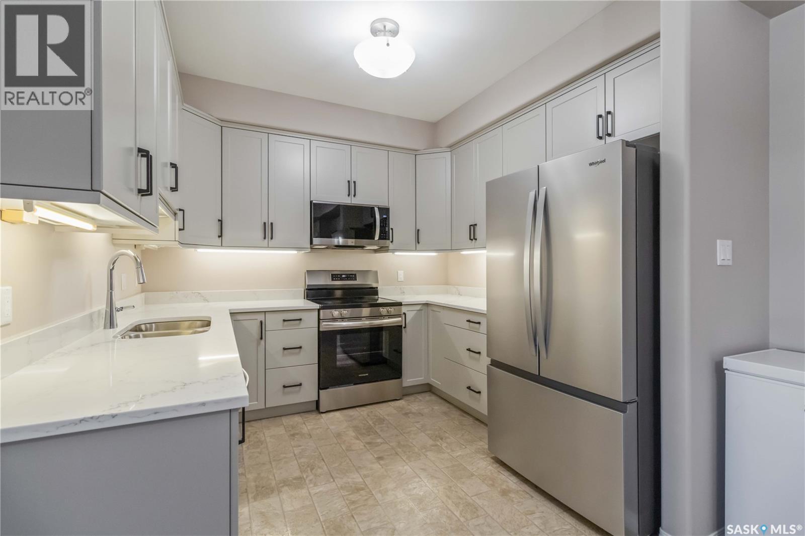 Welcome home to this bright and spacious two bedroom, two bathroom third level condo, located in a quiet building with elevator access and underground parking for accessibility and convenience. This well designed unit has expansive windows that fill the space with natural light throughout the day. The fully renovated kitchen is a true highlight, professionally completed by Superior Cabinets featuring full extension soft close drawers, quartz countertops, and upgraded appliances, including in suite washer and dryer. The central air conditioning unit was replaced for additional comfort and peace of mind. The primary bedroom offers an excellent retreat with a generous walk in closet and a three piece ensuite. Engineered hardwood flooring flows through the living room and bedrooms, adding warmth and style to the space. Step outside onto the west facing balcony to enjoy open views and the convenience of a natural gas BBQ line, perfect for entertaining or relaxing evenings at home. This well kept unit and building offer a high quality living experience, complete with one heated underground parking stall and your own private storage room. Ideally located close to Market Mall, schools, and a wide range of amenities, this is an unbeatable location. Do not miss your opportunity to own this bright, upgraded, move in ready condo. (29307338)
