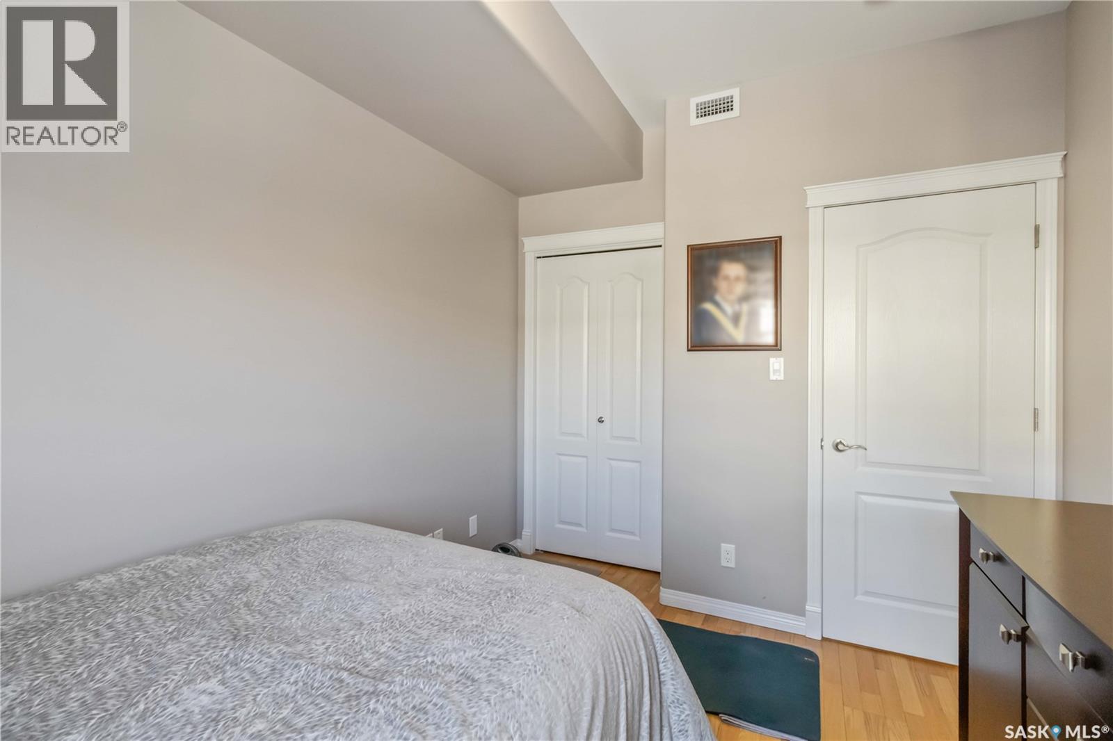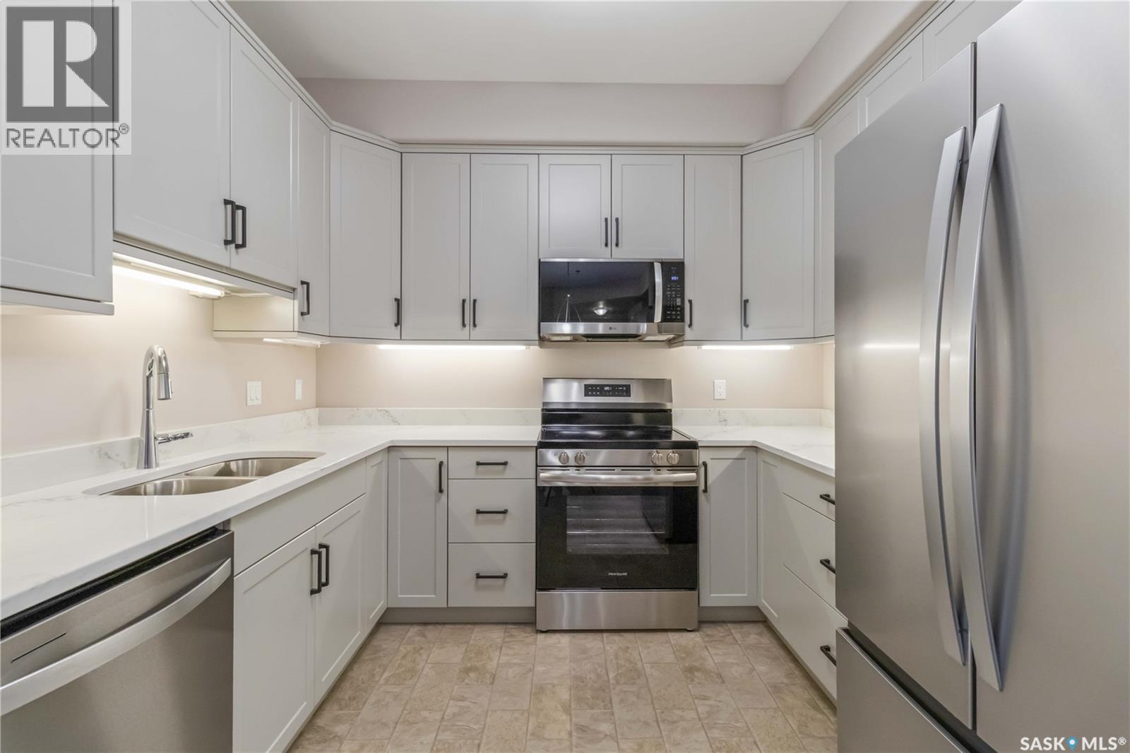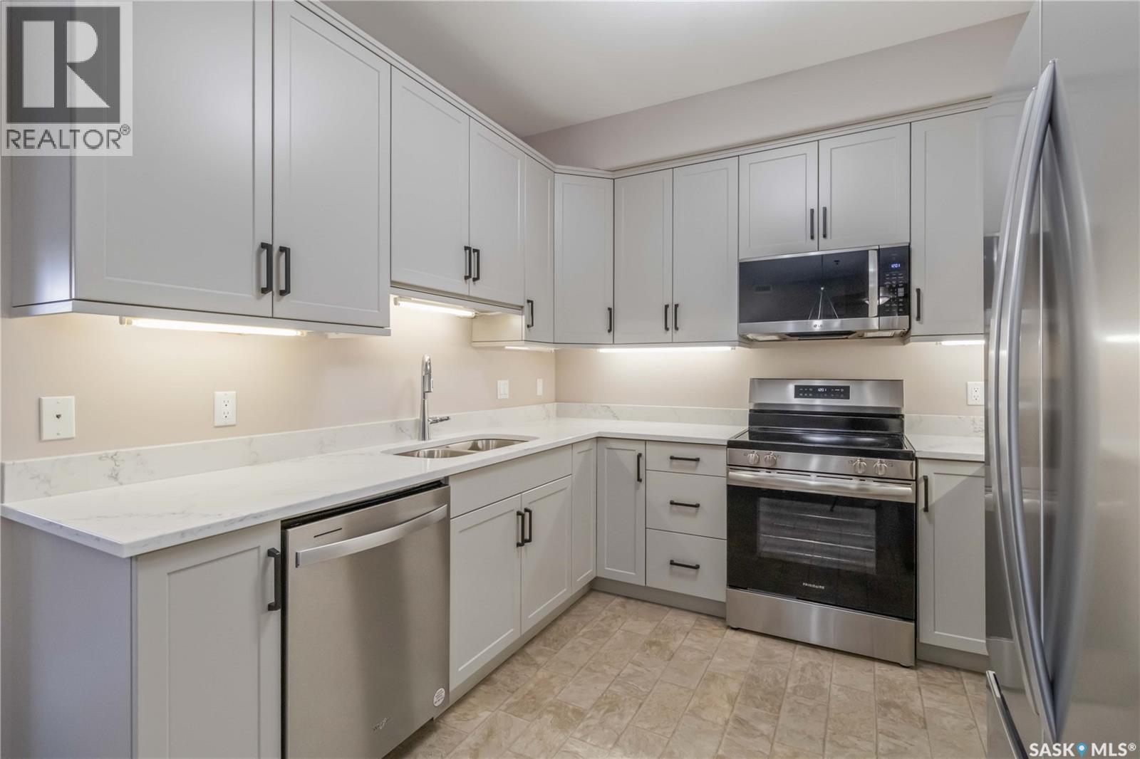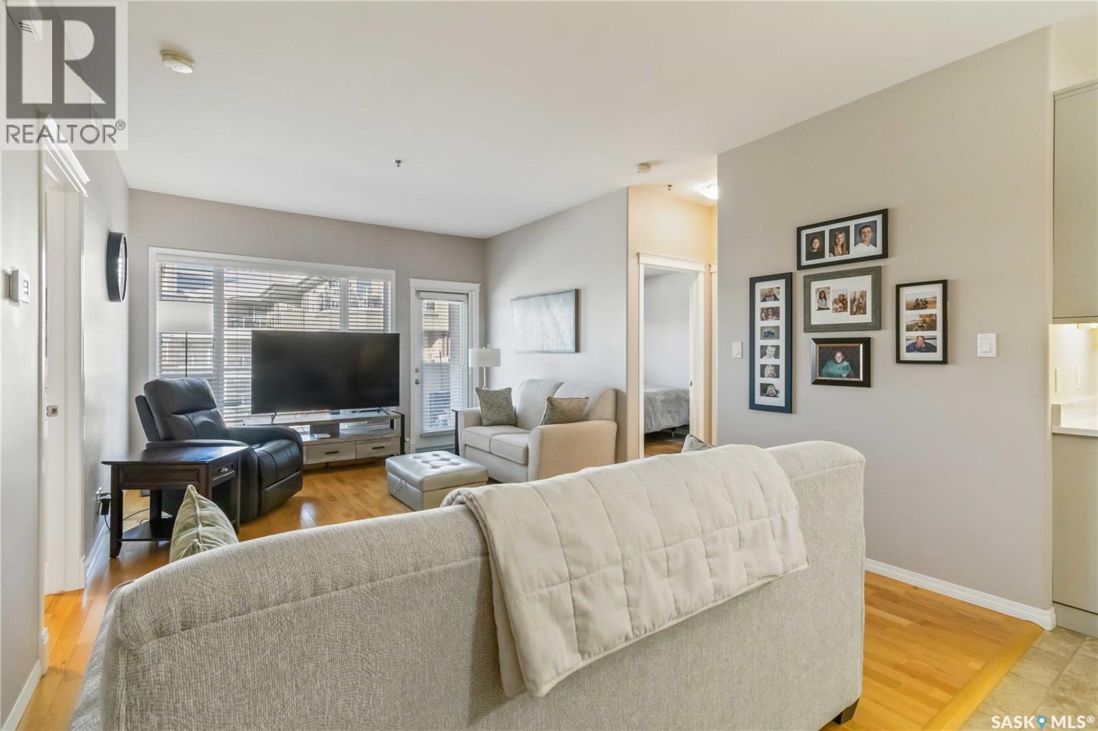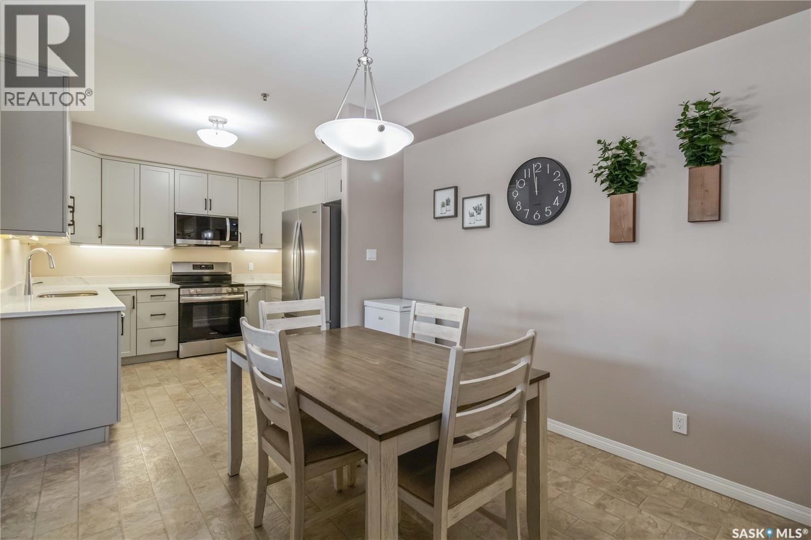 Welcome home to this bright and spacious two bedroom, two bathroom third level condo, located in a quiet building with elevator access and underground parking for accessibility and convenience. This well designed unit has expansive windows that fill the space with natural light throughout the day. The fully renovated kitchen is a true highlight, professionally completed by Superior Cabinets featuring full extension soft close drawers, quartz countertops, and upgraded appliances, including in suite washer and dryer. The central air conditioning unit was replaced for additional comfort and peace of mind. The primary bedroom offers an excellent retreat with a generous walk in closet and a three piece ensuite. Engineered hardwood flooring flows through the living room and bedrooms, adding warmth and style to the space. Step outside onto the west facing balcony to enjoy open views and the convenience of a natural gas BBQ line, perfect for entertaining or relaxing evenings at home. This well kept unit and building offer a high quality living experience, complete with one heated underground parking stall and your own private storage room. Ideally located close to Market Mall, schools, and a wide range of amenities, this is an unbeatable location. Do not miss your opportunity to own this bright, upgraded, move in ready condo. (29307338)