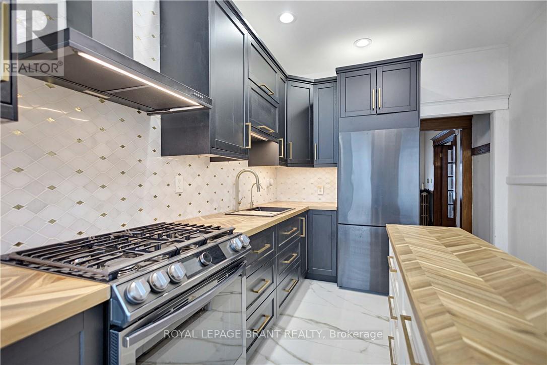 Charming 4-bed, 3 bath, brick home with modern comfort, character and a fully finished basement offering in-law suite potential in a great area! Welcome to this beautifully maintained solid brick 2.5-storey home, offering over 2,000 sq. ft. of above grade living space. Located in the highly desirable St. Clair/Blakely neighbourhood, this home combines timeless character with thoughtful updates; the perfect blend of classic, but with modern comforts and conveniences. Step inside and be greeted by hardwood floors with walnut inlay, original trim, and bright, inviting rooms that make you feel instantly at home. The spacious main floor features a warm living room, a large dining area perfect for family gatherings, and a modern, tastefully remodeled kitchen, with a built-in dishwasher and under cabinet lighting, that balances style and functionality. Upstairs, you'll find three generous bedrooms, including a large primary suite with double closets, and a stunning updated bath with a custom-tiled walk-in shower. The third level is a private retreat; offering a fourth bedroom with beautiful custom 3-piece ensuite bath plus extra space ideal for a home office or lounge. The finished basement provides even more versatility with a side entrance, kitchenette, and full bath; ideal for extended family, guests, or potential rental income. Enjoy low-maintenance outdoor living with professionally turfed front and back gardens, composite decking and a detached garage for easy care and upkeep. (42004019)