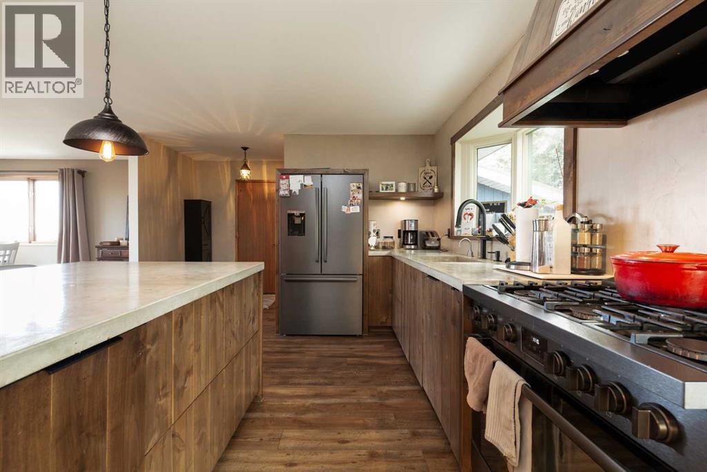 Welcome to 304 Riverbend Road in sought-after Moon River Estates. This 1,965 sqft bungalow offers 5 bedrooms, 2 full bathrooms, and 2 half bathrooms, with a fully finished walkout basement and breathtaking views of the river valley. Set on a private 1.14-acre lot, the home features classic brick and wood siding and an east-facing backyard that’s sheltered from west winds.The heart of the home is the beautifully updated kitchen, featuring alder wood cabinetry, concrete countertops, and new flooring that continues through the kitchen, dining area, and basement. Two bathrooms have been recently renovated, and new outdoor spaces include three decks off the back of the home, including the expansive deck off the primary bedroom and a concrete patio outside the walkout basement—perfect for enjoying the view.Both the main floor living room and basement family room are anchored by striking wood-burning fireplaces, each inset into floor-to-ceiling stone hearths that add warmth, character, and timeless appeal. A unique open-below staircase connects the main floor to the basement, filled with floor to ceiling windows and decades old greenery, blurring the line between indoor and outdoor living.Oversized windows along the back of the home frame the river valley views and flood the interior with natural light. Additional features include a double attached heated garage, underground sprinklers, co-op water servicing the home, new roof, and the option to purchase the property fully furnished. Horse paddocks are available for rent at the bottom of Moon River Estates, adding to the unique rural lifestyle feel just minutes from the city. A rare opportunity to own an acreage property with views, space, and thoughtful updates in one of the area’s most desirable communities. (31562395)