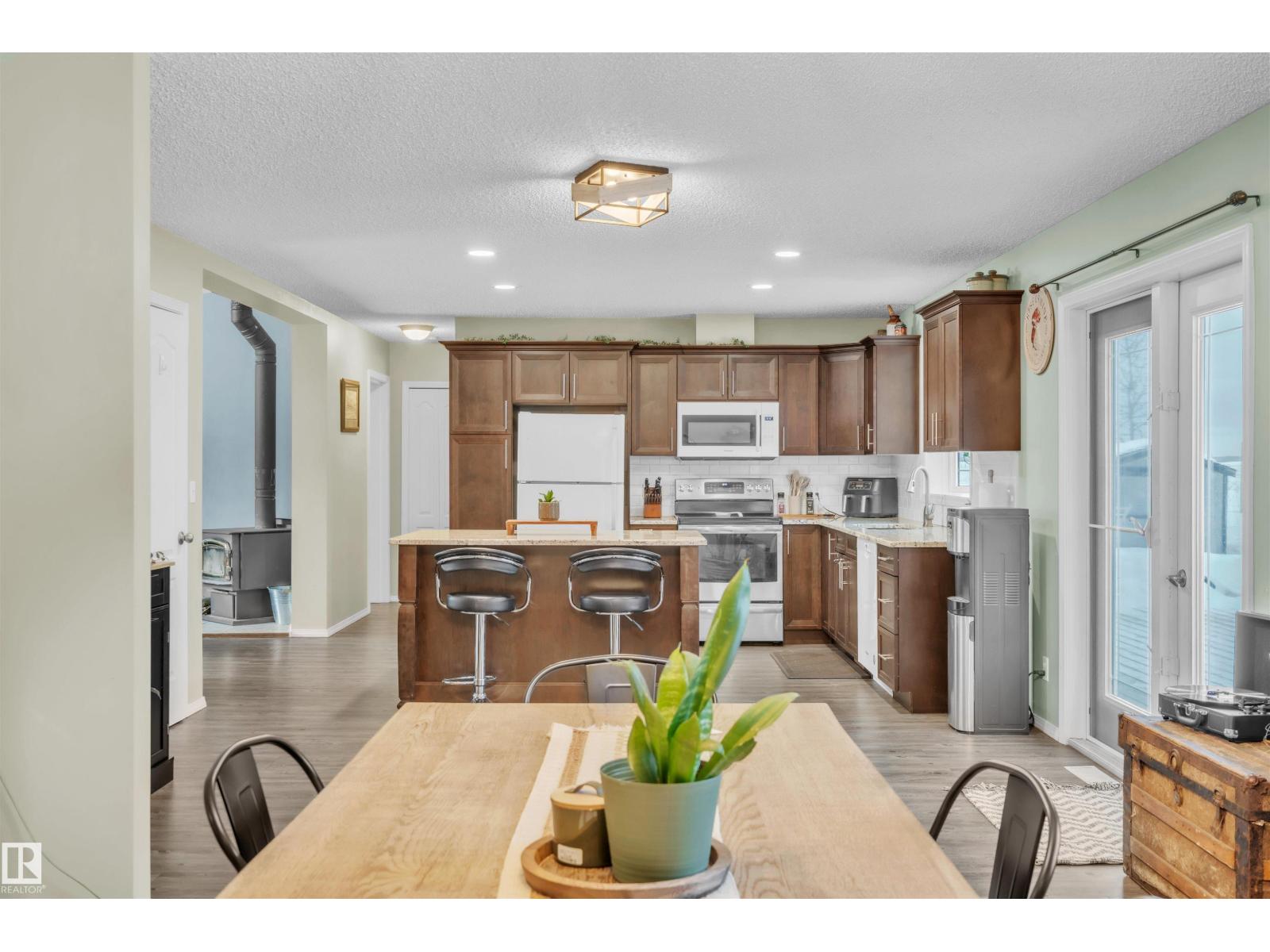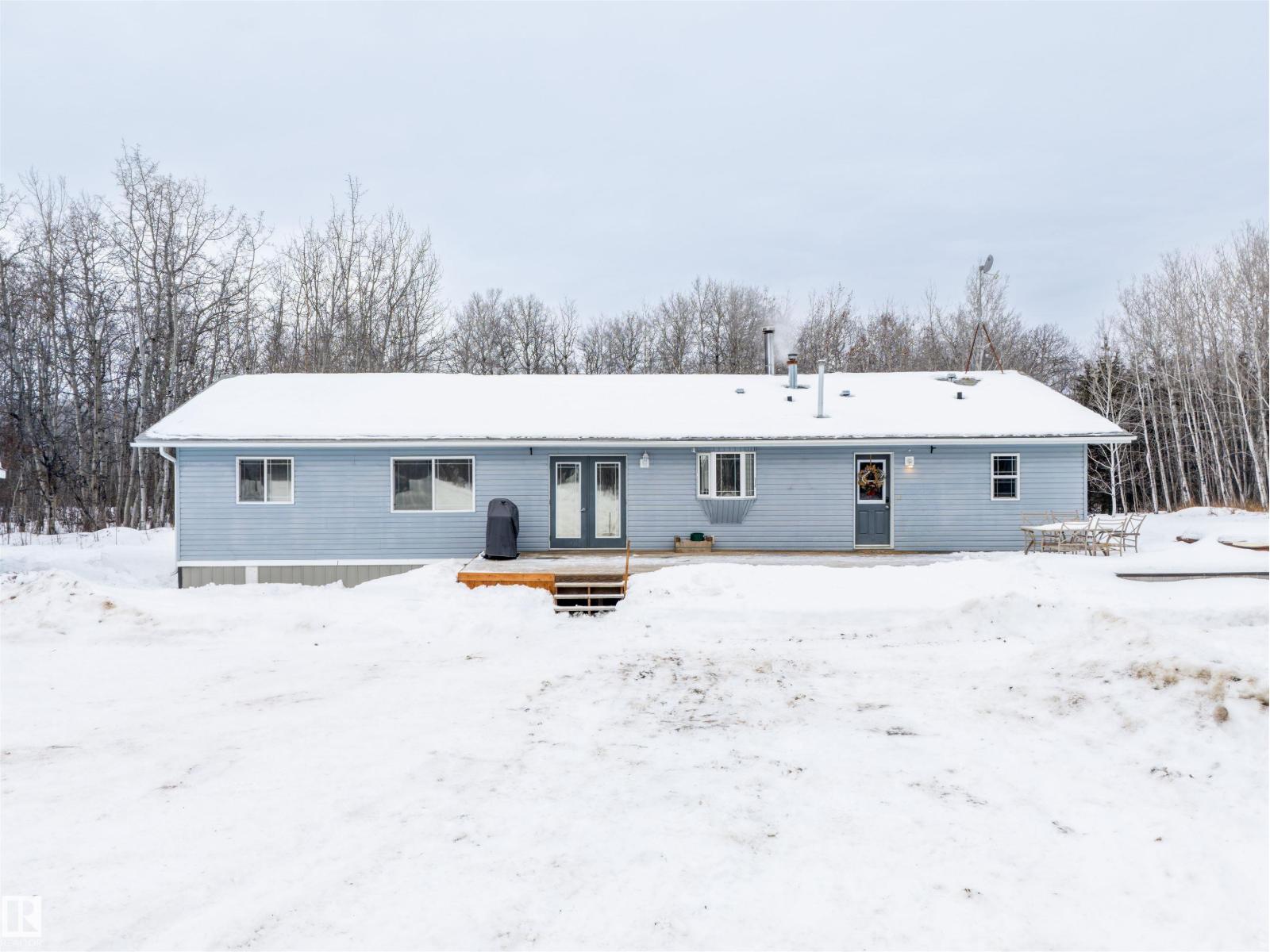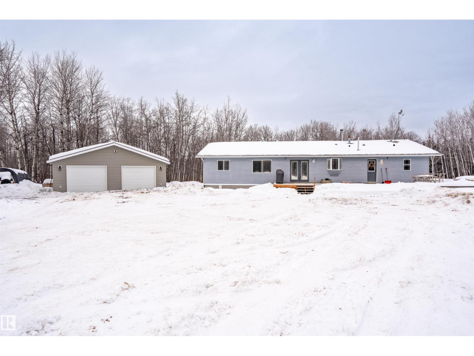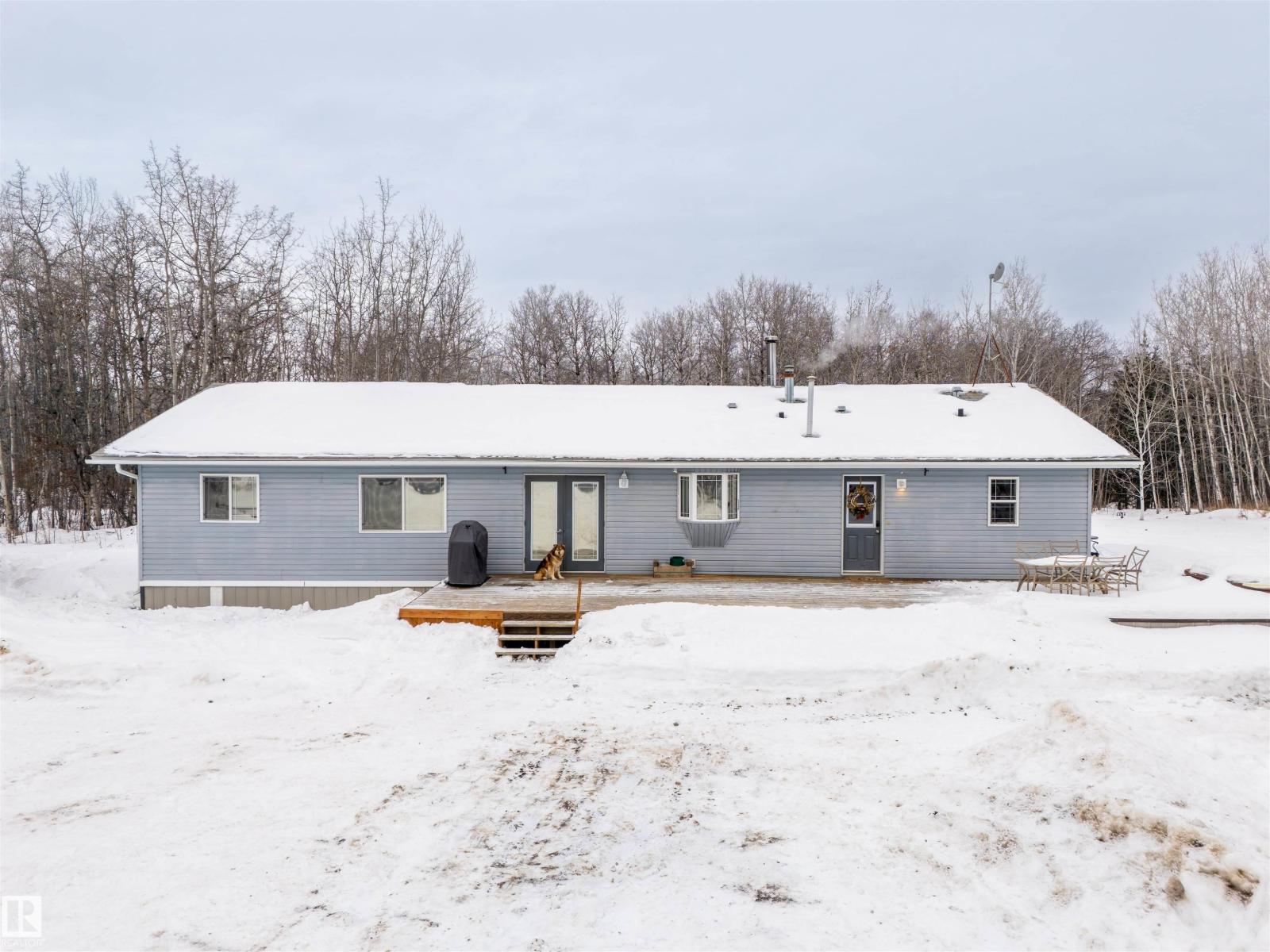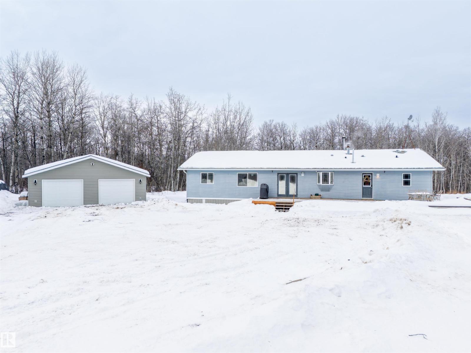 This inviting open-concept 1965 sq ft home offers a perfect blend of warmth, functionality, and modern style. The kitchen features rich dark cabinetry, light granite countertops and a central island with seating—ideal for everyday living and entertaining. Open to the kitchen, the spacious dining area easily accommodates a large table and flows seamlessly into the bright living room. Large patio doors fill the space with natural light and provide outdoor access, while a cozy wood-burning stove adds warmth and character. The layout comfortably fits full-sized furnishings and creates a welcoming atmosphere throughout. The large primary bedroom includes a full ensuite for added comfort and privacy. Situated on 4.81 acres, this property offers peaceful country living in a private setting, ideally located just minutes from the Cold Lake oil patch and Imperial Oil / Esso operations. An oversized double detached garage provides excellent storage and workspace. (33752915)