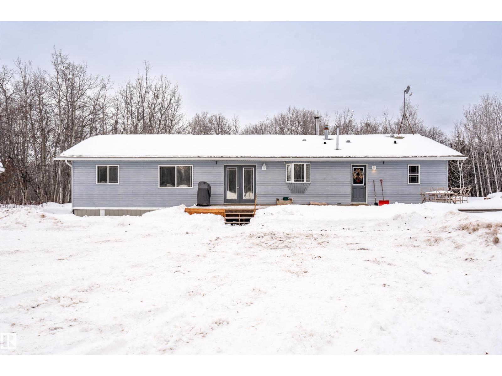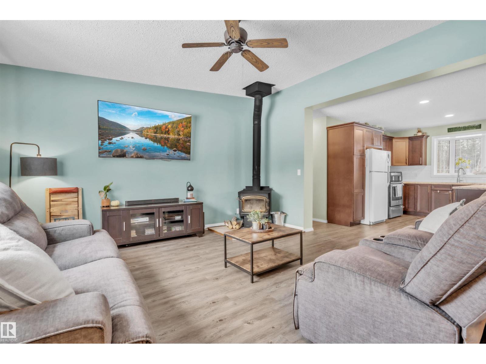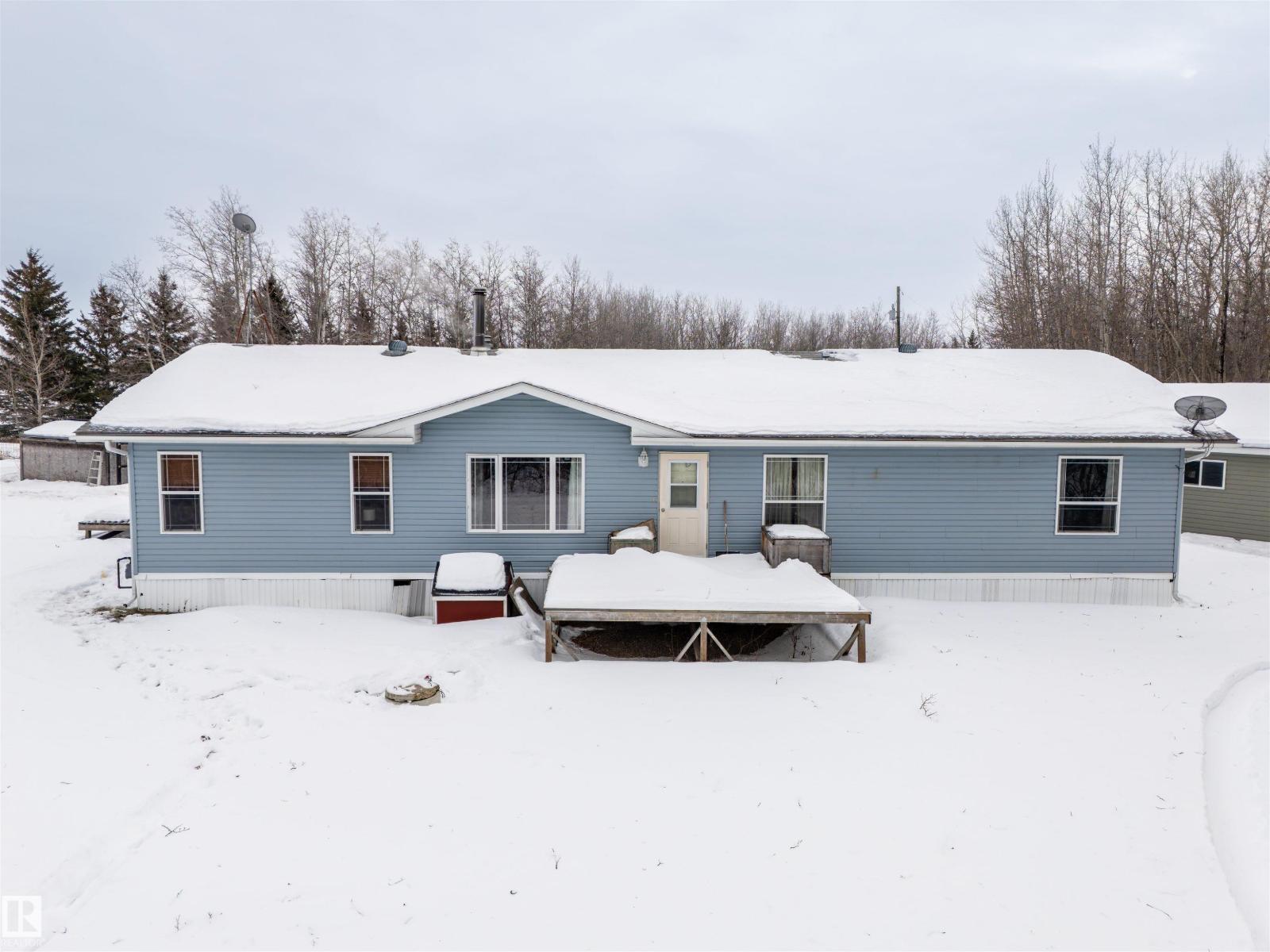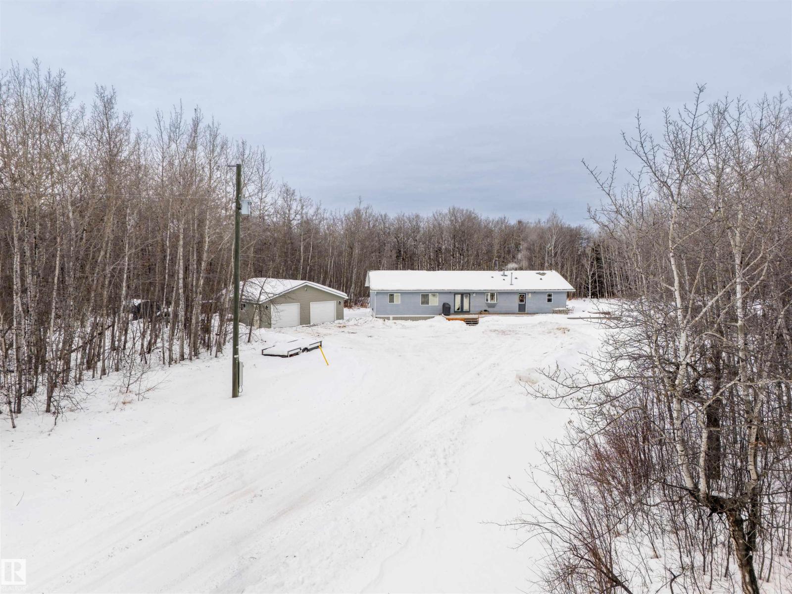 This inviting open-concept 1965 sq ft home offers a perfect blend of warmth, functionality, and modern style. The kitchen features rich dark cabinetry, light granite countertops and a central island with seating—ideal for everyday living and entertaining. Open to the kitchen, the spacious dining area easily accommodates a large table and flows seamlessly into the bright living room. Large patio doors fill the space with natural light and provide outdoor access, while a cozy wood-burning stove adds warmth and character. The layout comfortably fits full-sized furnishings and creates a welcoming atmosphere throughout. The large primary bedroom includes a full ensuite for added comfort and privacy. Situated on 4.81 acres, this property offers peaceful country living in a private setting, ideally located just minutes from the Cold Lake oil patch and Imperial Oil / Esso operations. An oversized double detached garage provides excellent storage and workspace. (33752915)
