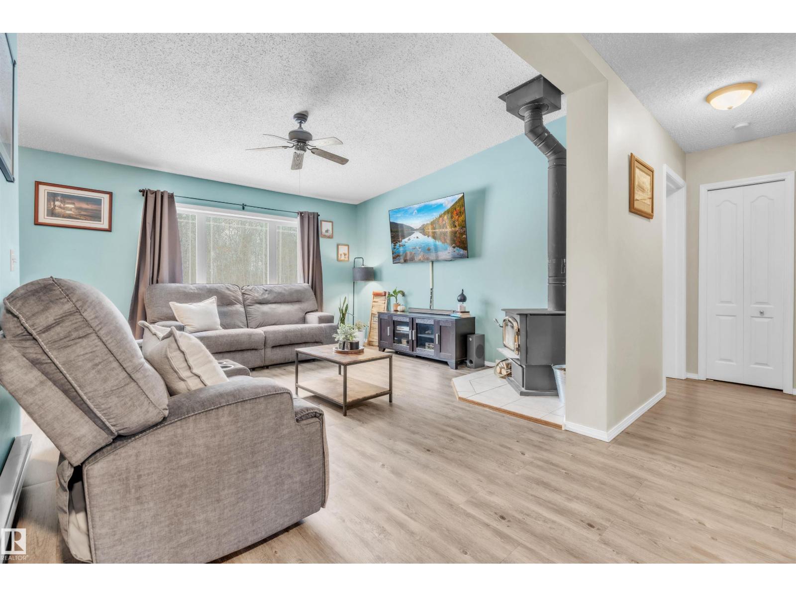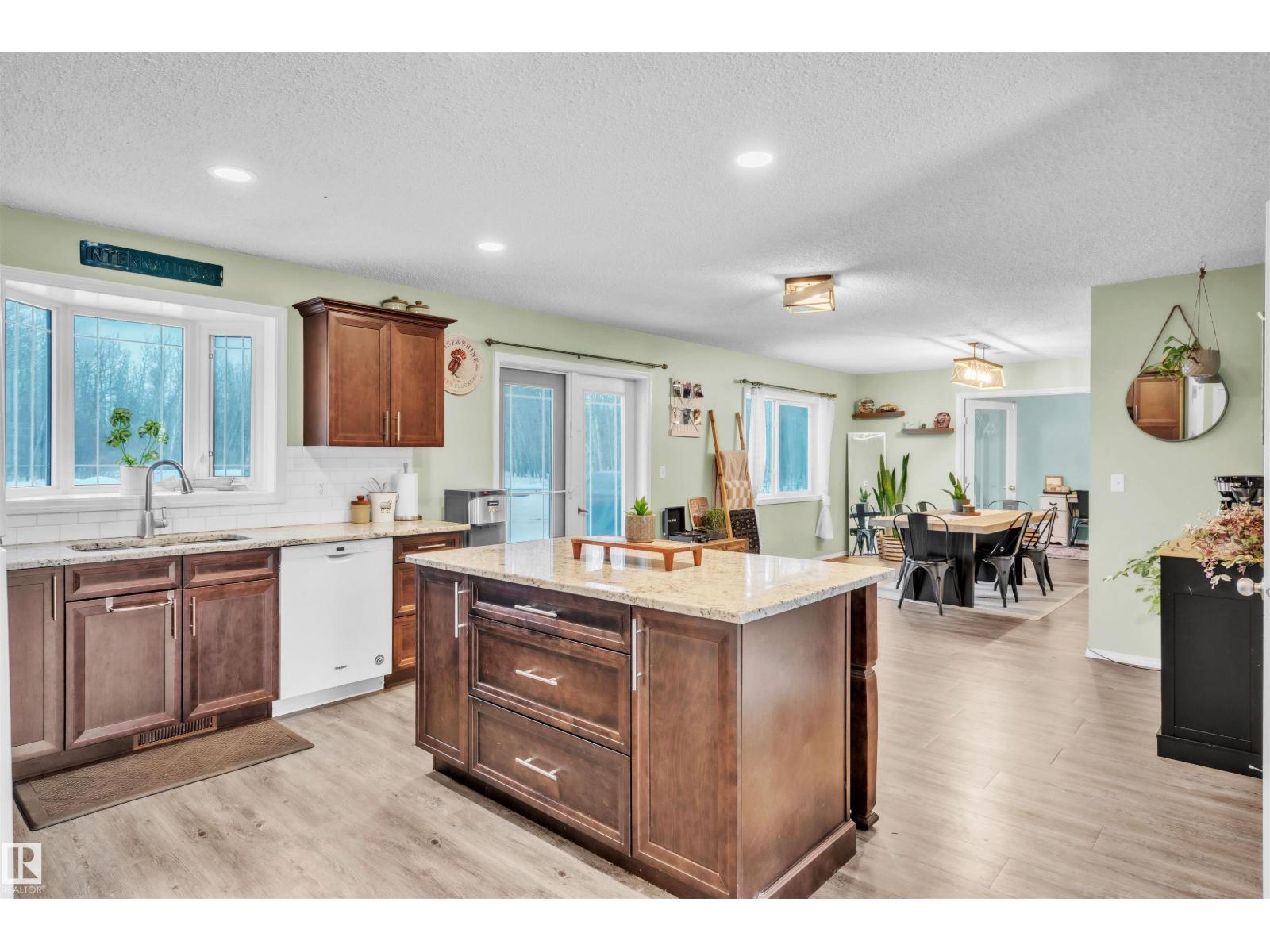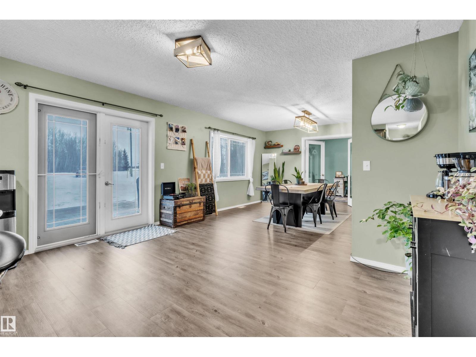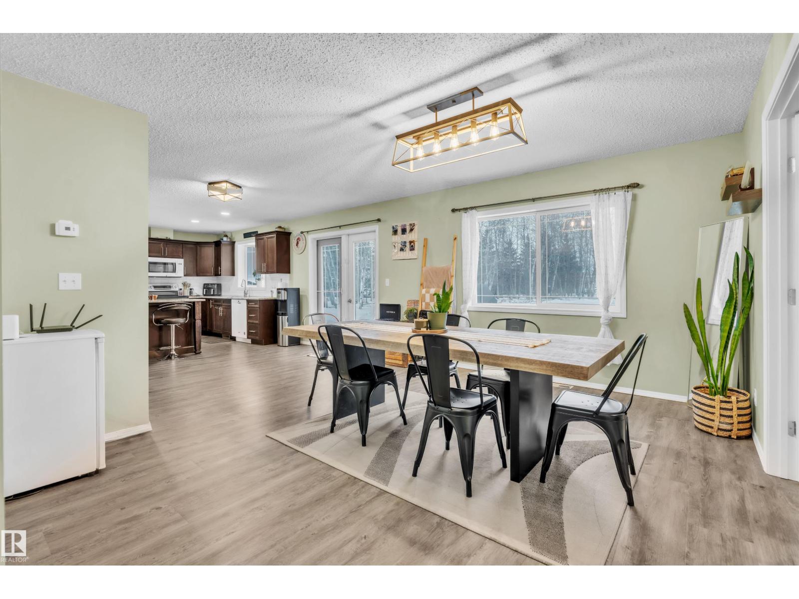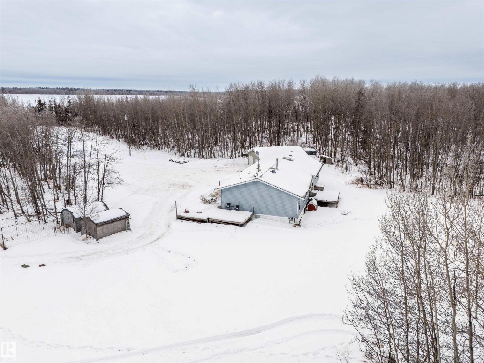 This inviting open-concept 1965 sq ft home offers a perfect blend of warmth, functionality, and modern style. The kitchen features rich dark cabinetry, light granite countertops and a central island with seating—ideal for everyday living and entertaining. Open to the kitchen, the spacious dining area easily accommodates a large table and flows seamlessly into the bright living room. Large patio doors fill the space with natural light and provide outdoor access, while a cozy wood-burning stove adds warmth and character. The layout comfortably fits full-sized furnishings and creates a welcoming atmosphere throughout. The large primary bedroom includes a full ensuite for added comfort and privacy. Situated on 4.81 acres, this property offers peaceful country living in a private setting, ideally located just minutes from the Cold Lake oil patch and Imperial Oil / Esso operations. An oversized double detached garage provides excellent storage and workspace. (33752915)